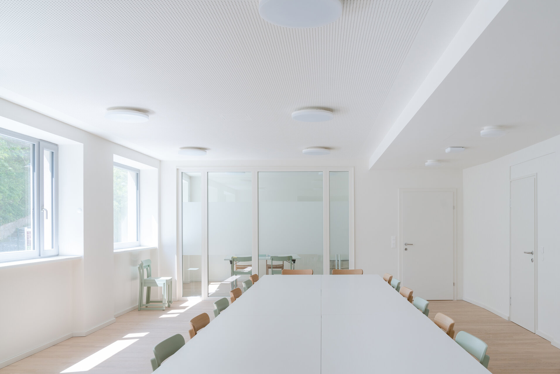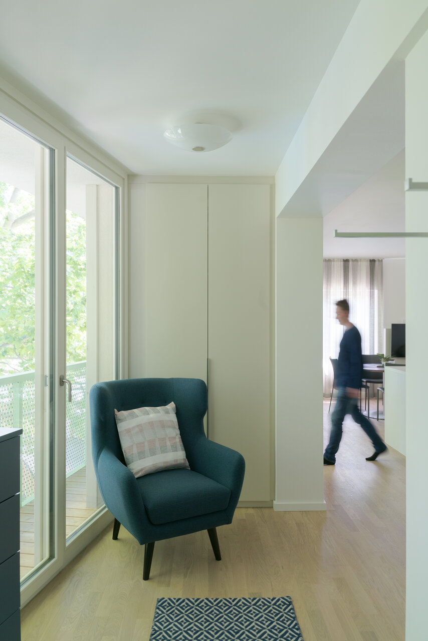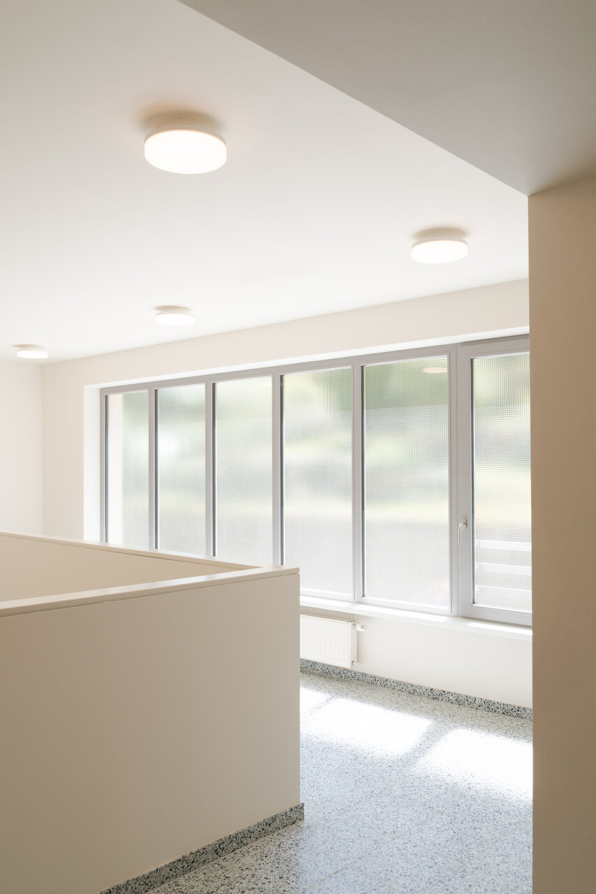 Die Lochfassade entlang der Maitalstraße blieb bestehen, die Fensteröffnungen sind wie im ursprünglichen Bestand linear und schlicht gehalten. Die eingeschnittenen, südseitigen Loggien erhalten außen fassadenbündige Faltläden zur Verschattung und Ergänzung des Fensterrasters.
