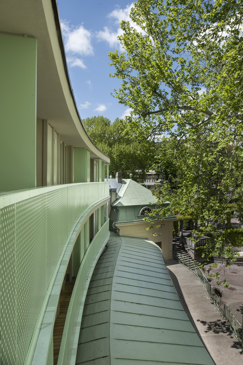 Die bäderseitige Fassade passt sich dem Verlauf der bestehenden Kabinen als weiche, geschwungene Form an. Die aneinandergereihten, raumhohen Fassadenelemente in Holz und Glas orientieren sich am Erscheinungsbild der Türelemente der darunterliegenden Ebenen mit den Umkleidekabinen. Durch das Zurücksetzen der Fensterebene entstanden zum Thermalbad hin geschützte, diskrete Räume. Sowohl von unten nach oben, als auch von oben nach unten werden die Ein- bzw. Ausblicke „gefiltert“. Die Loggien sind bewusst nach Innen „gestülpt“, um ruhige, introvertierte Bereiche zu schaffen. (Text: Architekten, bearbeitet)
