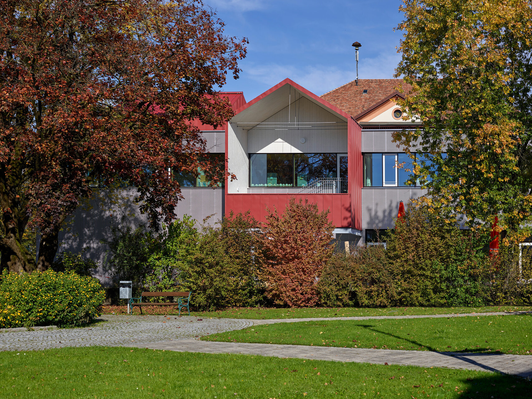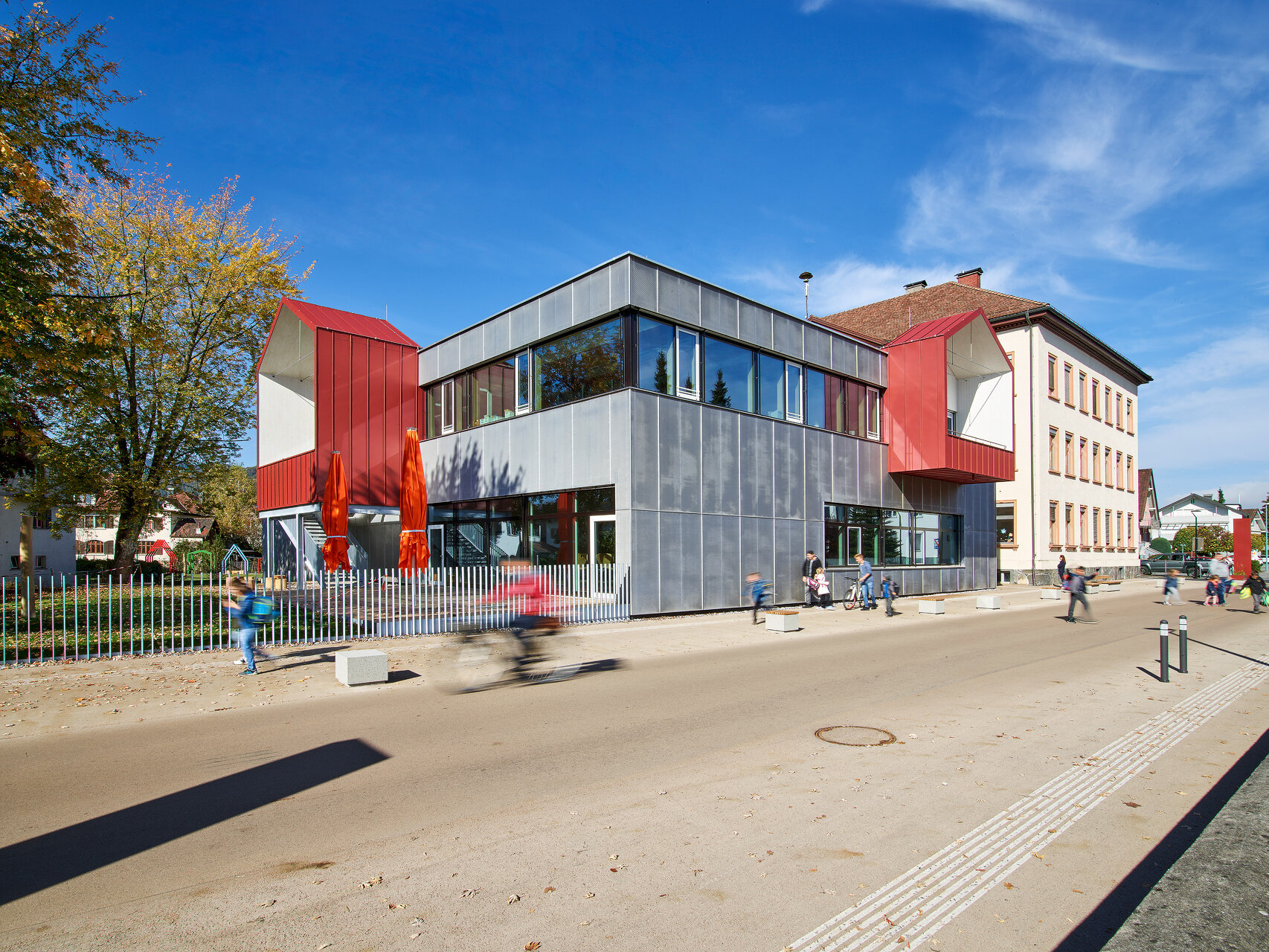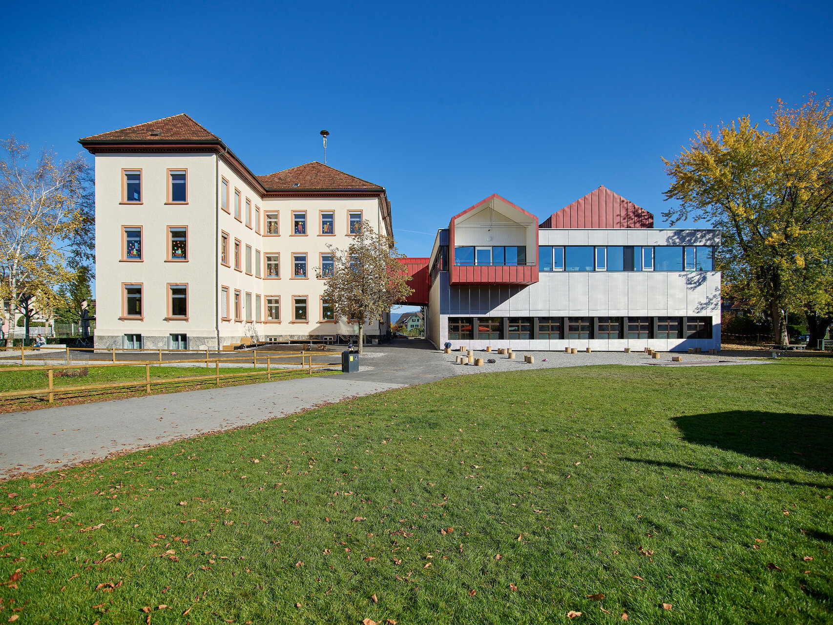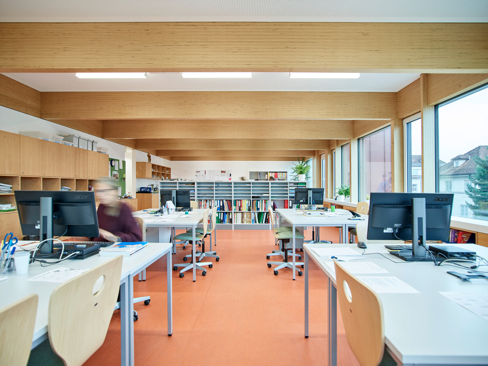 Das Dach der Turnhalle wurde abgetragen, das Erdgeschoß zur Straße hin erweitert und ein zusätzliches Geschoß in Holzbauweise aufgesetzt. So entstanden 900 Quadratmeter zusätzlicher Nutzfläche, um den aktuellen Anforderungen an Schule gerecht zu werden: Räume für Bewegung und Präsentation, Möglichkeiten für Ganztagsbetreuung, Platz für Musik und Kreatives, eine großzügige Bibliothek sowie Arbeitsplätze für Lehrende und Administration. Die großen Räume des Altbaus hingegen wurden durch die Erweiterung wieder frei für die Nutzung als Klassen.
