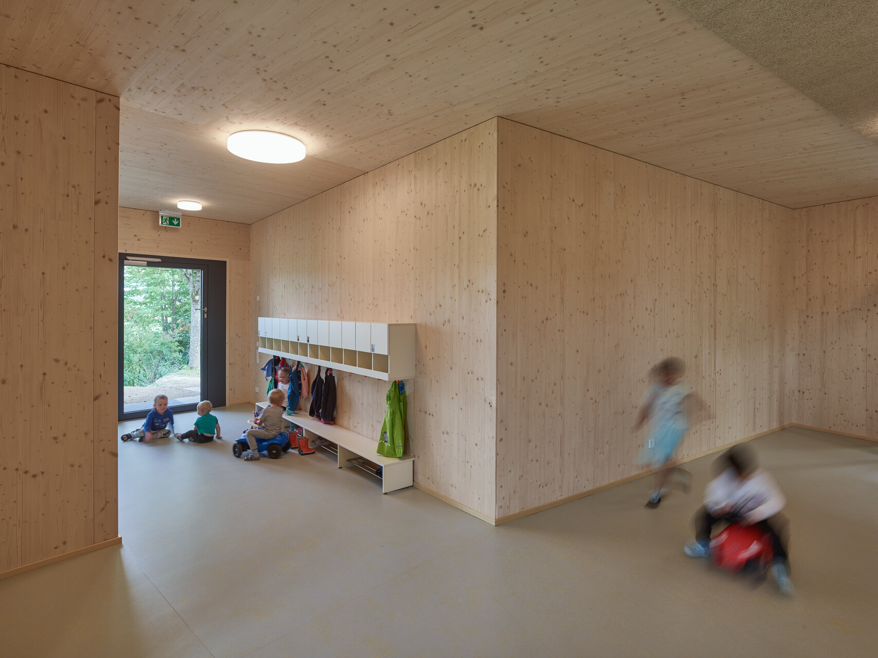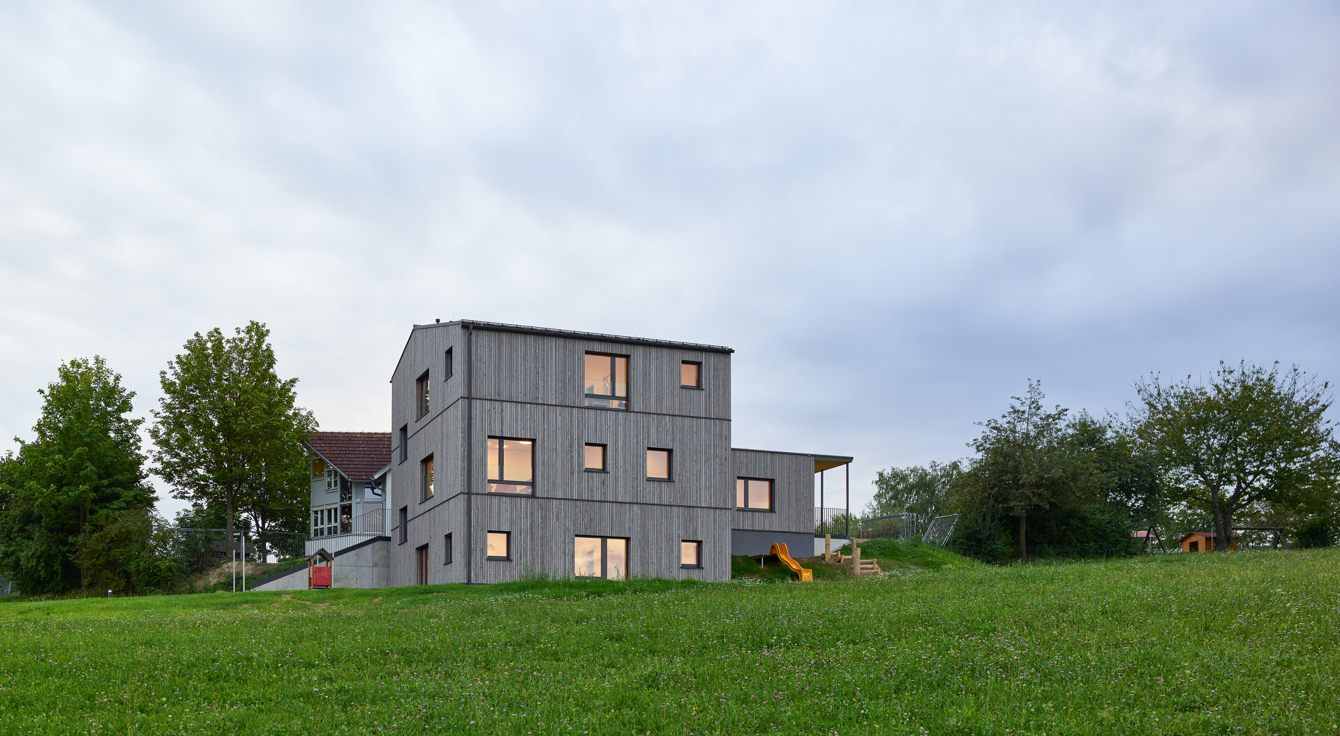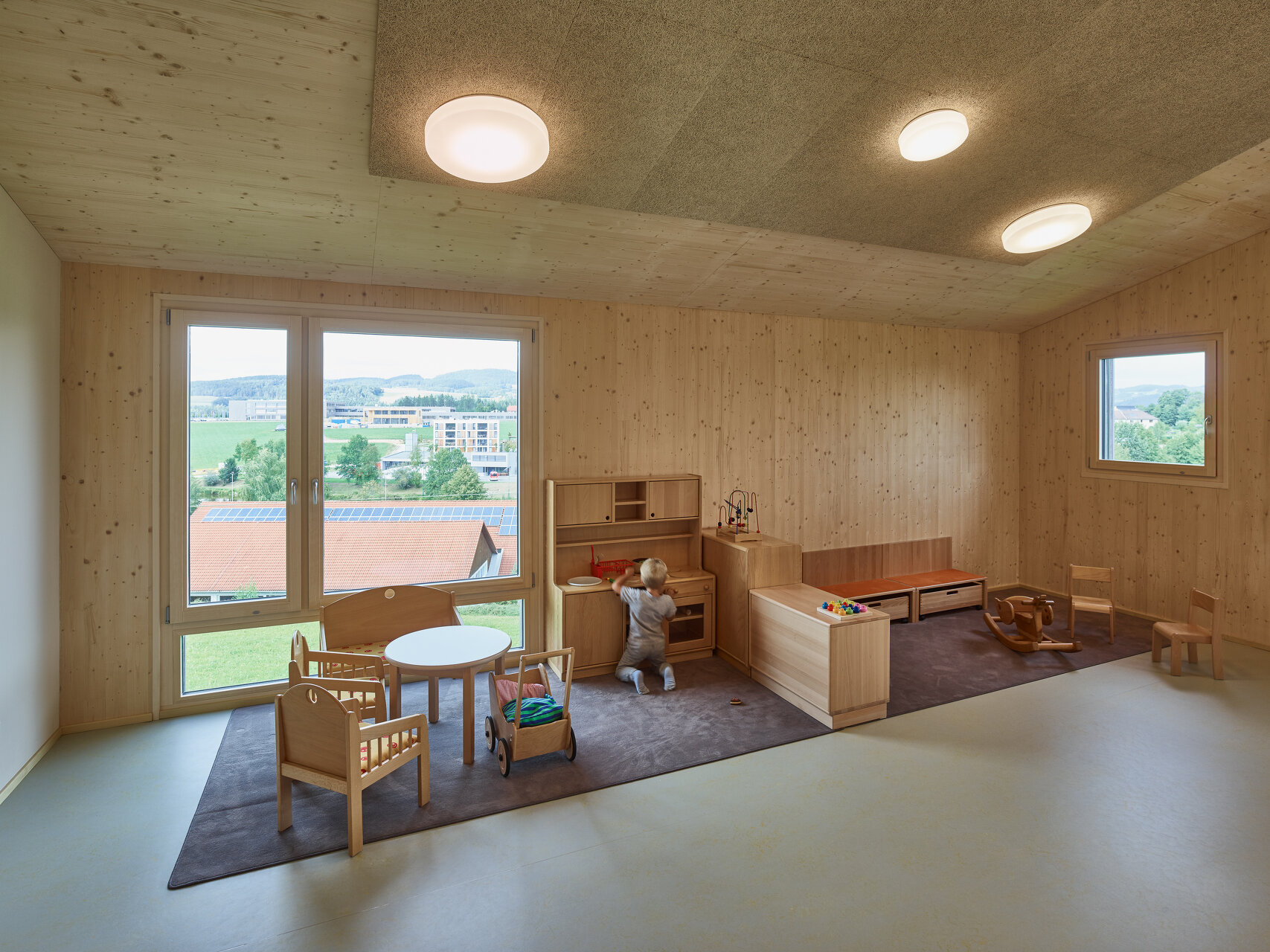 - Das Krabbelstubenhaus ist aus CLT-Konstruktionsmassivholz ausgeführt. Die hinterlüftete Lärchenholzfassade prägt das Erscheinungsbild.