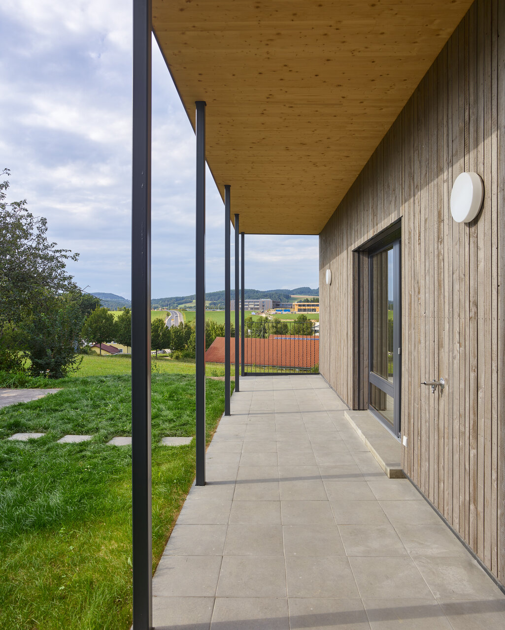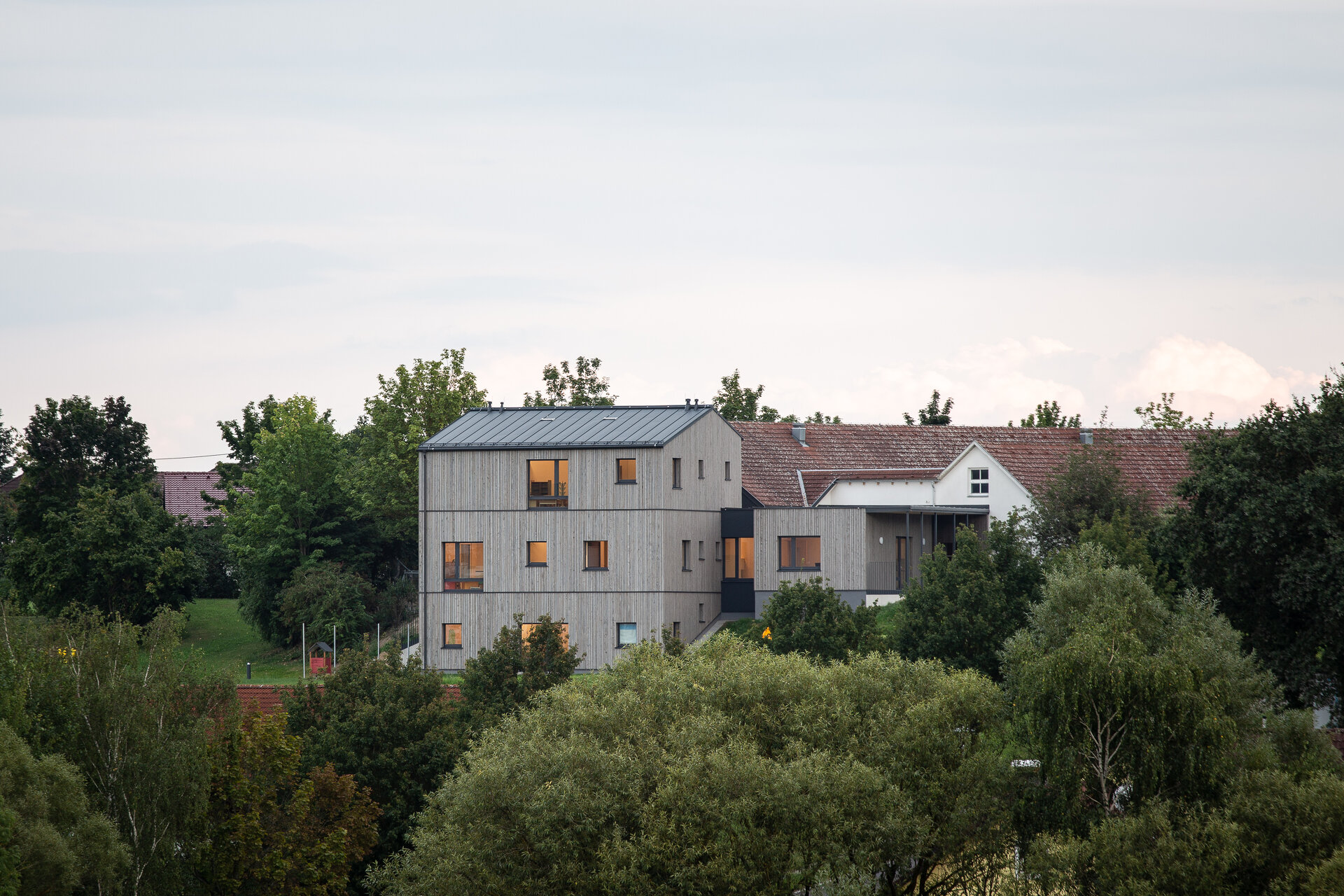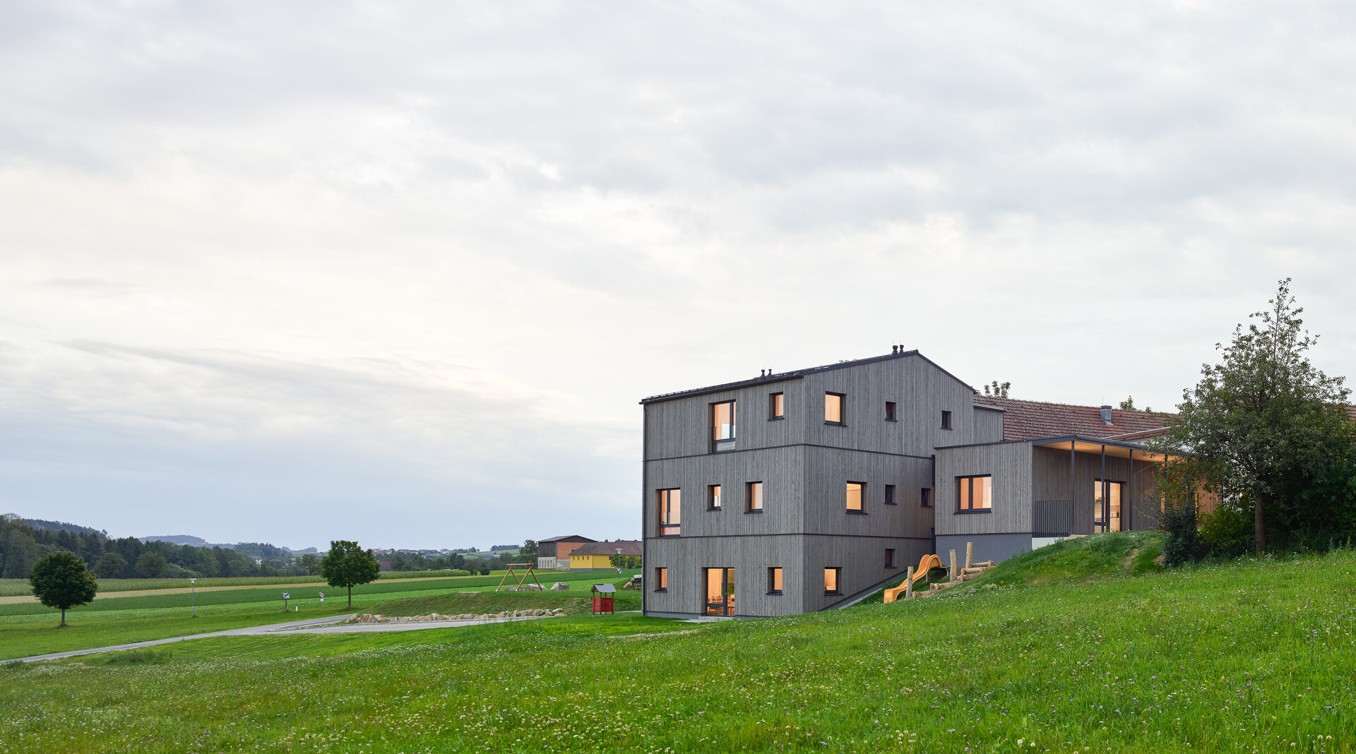 - Das Krabbelstubenhaus ist aus CLT-Konstruktionsmassivholz ausgeführt. Die hinterlüftete Lärchenholzfassade prägt das Erscheinungsbild.