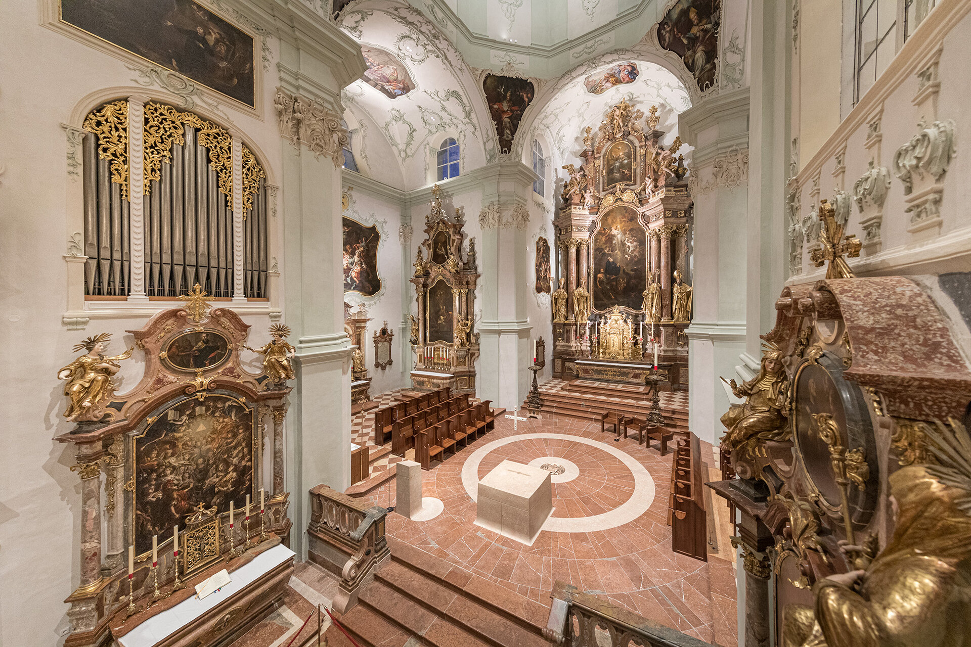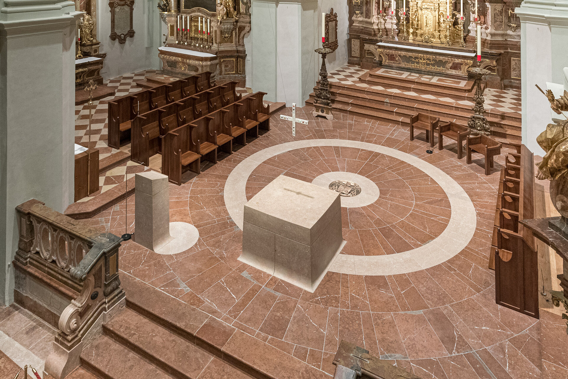 Die Ordnung der Stufenniveaus und die Schaffung des neuen Chorgestühls lassen eine „offene Mitte“ entstehen. Als archaische Elemente organisiert Arch. Thomas Wizany Altar, Ambo und Sedes um das neue Zentrum. Ein Oculus ermöglicht dabei die vertikale Verbindung, die den Raum erstmals bis auf das Niveau der Unterkirche verbindet.