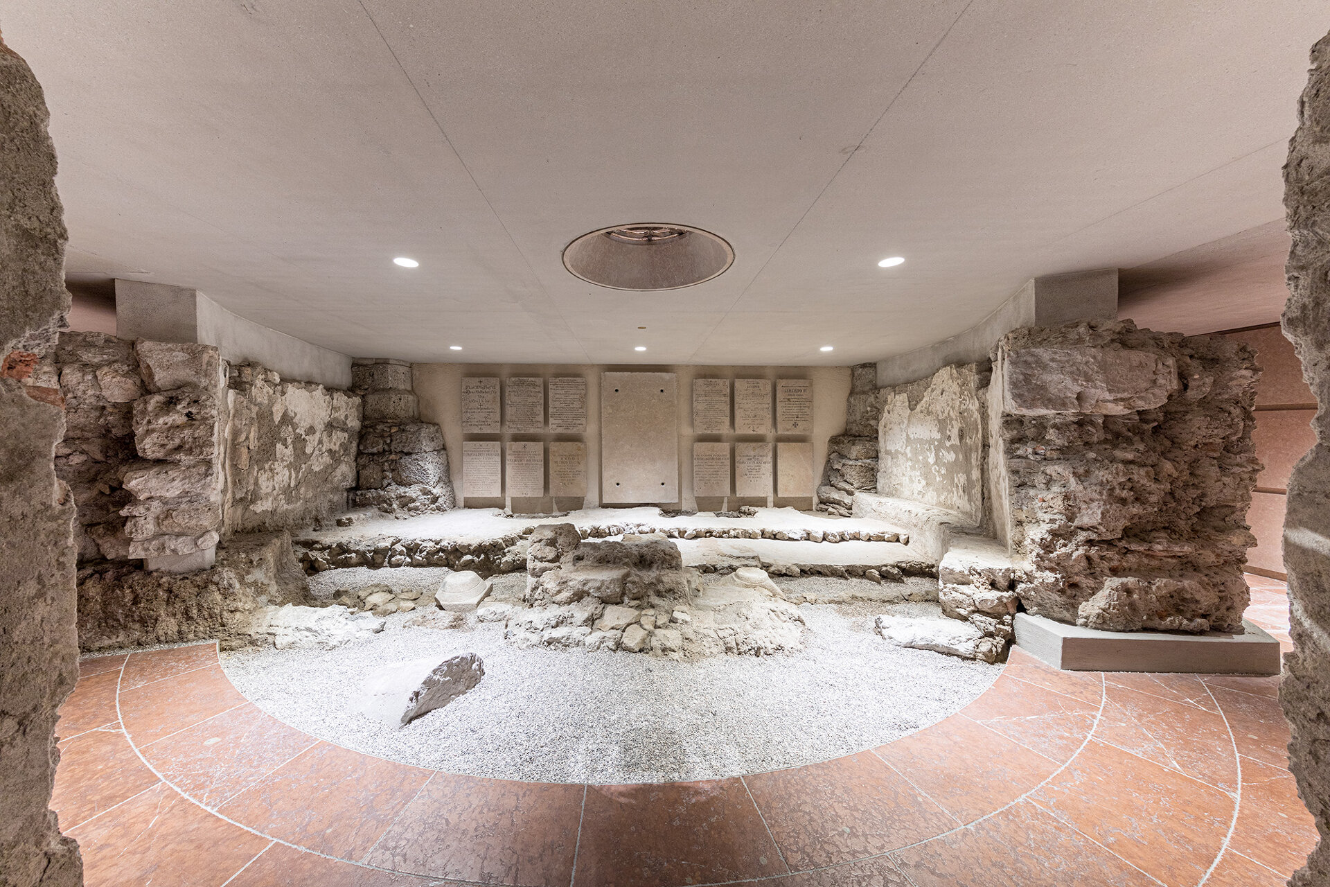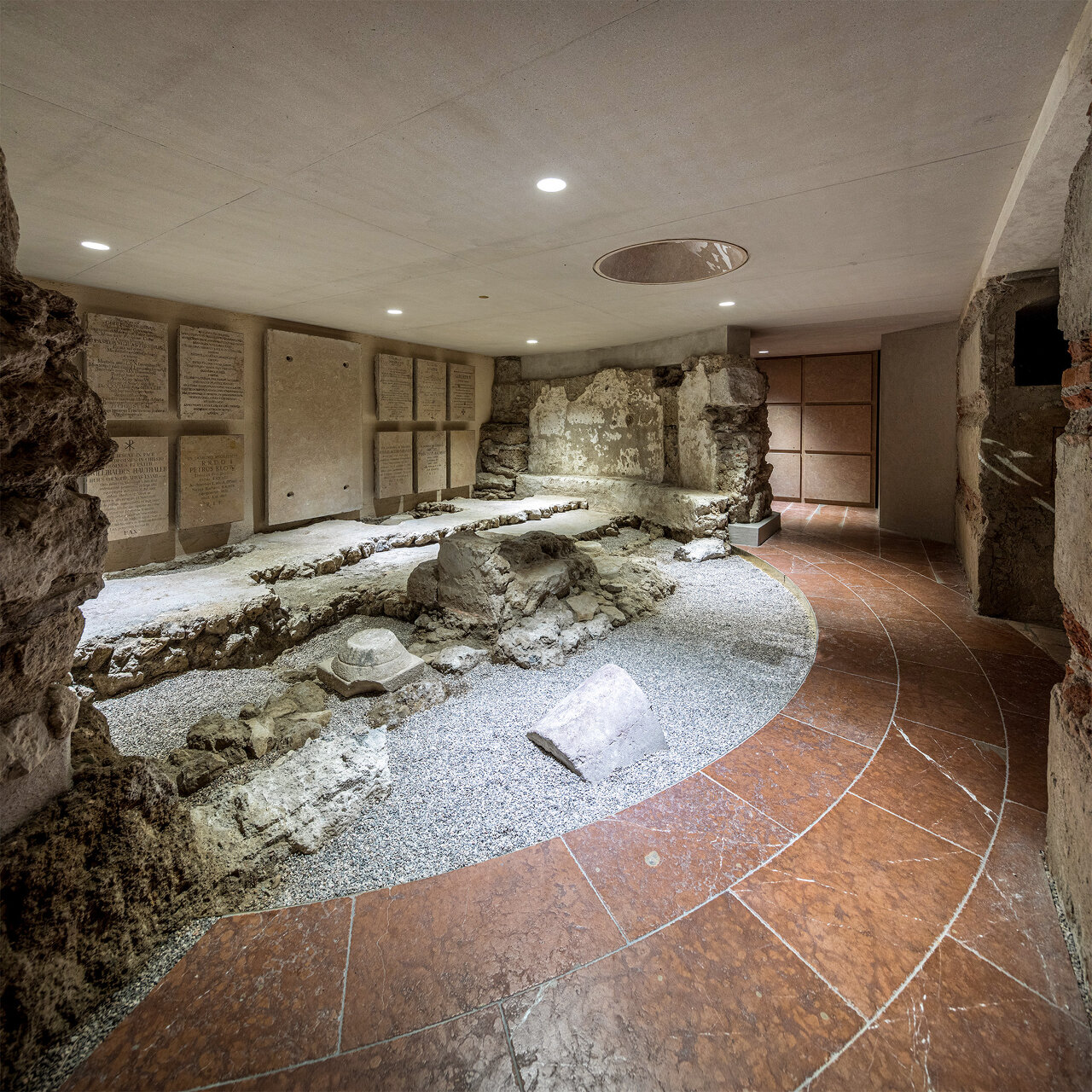 Mit der Sanierung wird die Krypta um einen Abgang und zusätzliche Grablegen erweitert. Durch die Freilegung der über 1000 Jahre alten Apsiswände wirken frühromanische, barocke und zeitgenössische Bauteile gleichermaßen und machen diesen besonderen Ort neu erlebbar. (Text: Architekten)