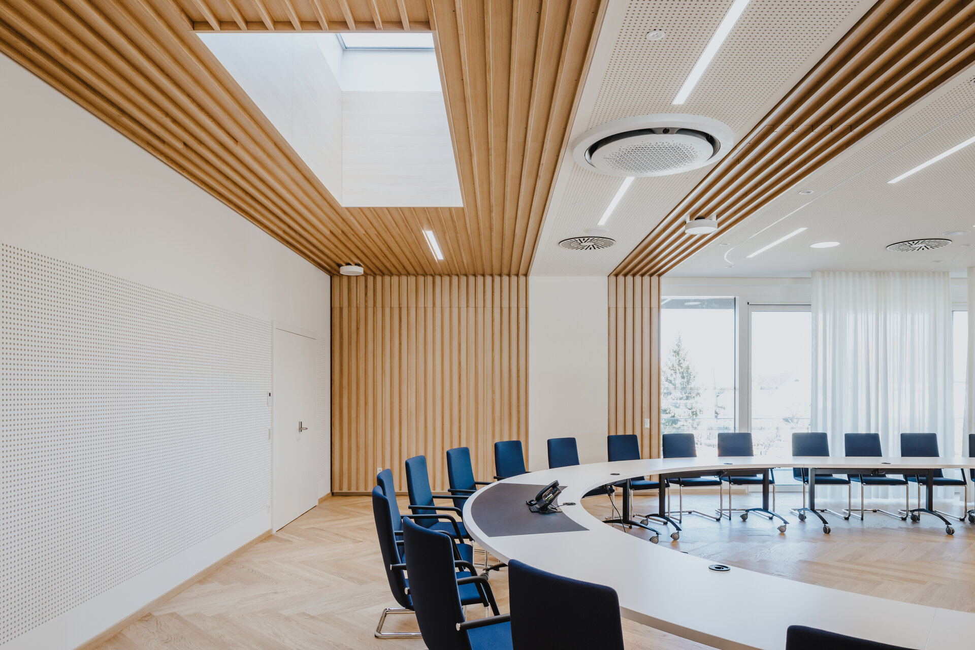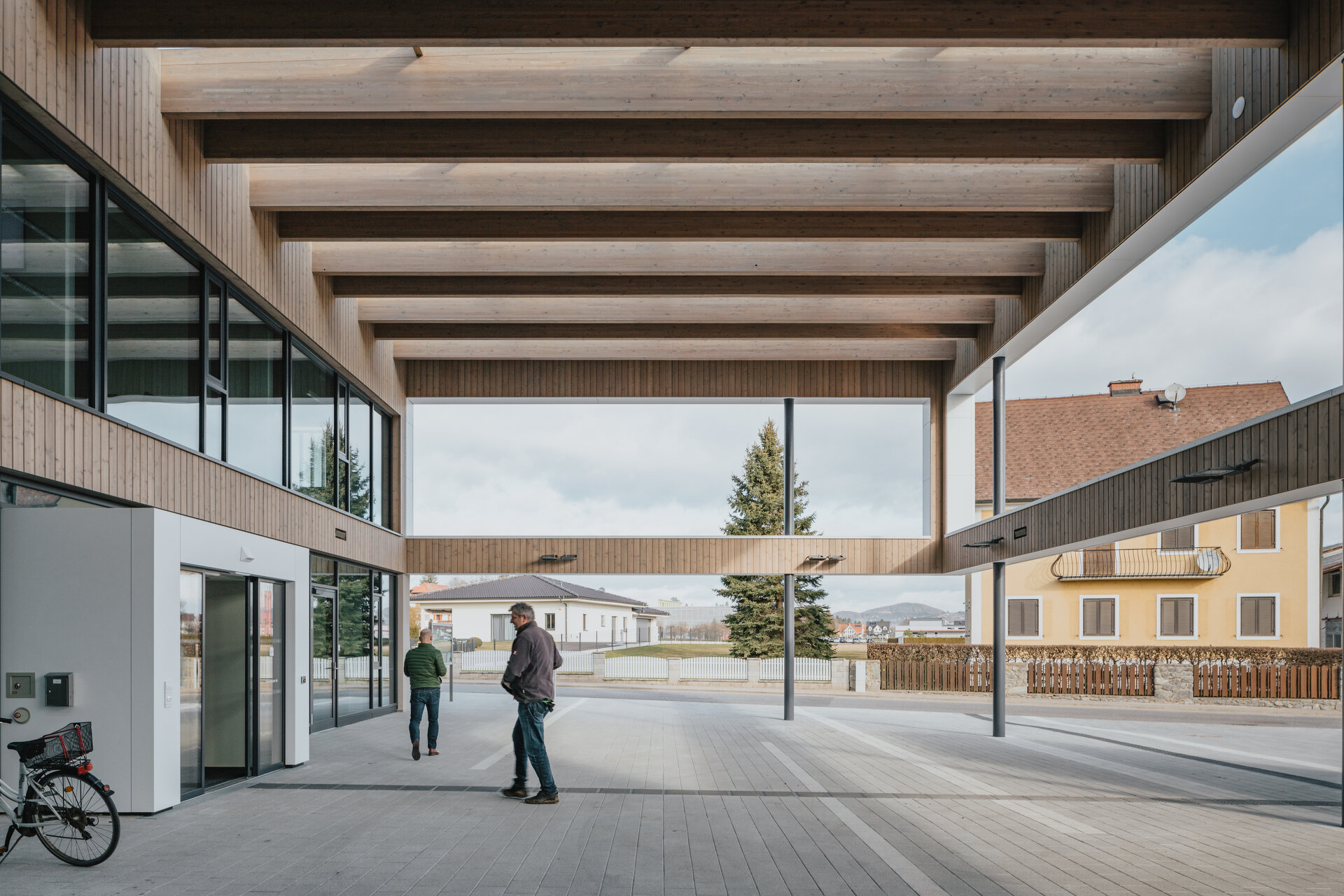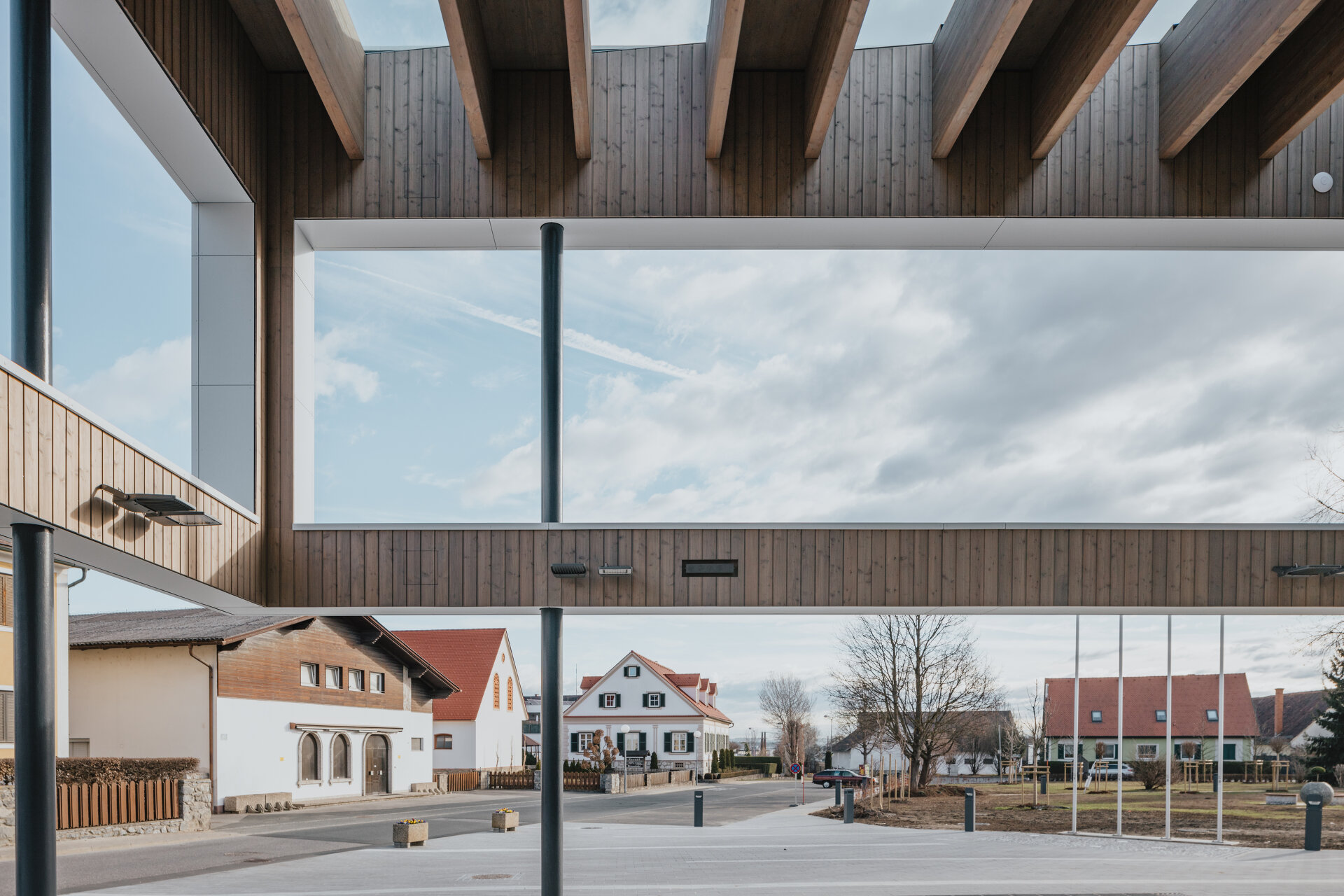 Das jüngste Bauvorhaben der Gemeinde, die seit Jahren eine der drei reichsten in der Steiermark ist, war ein neues Gemeindeamt, das – angesichts der Entwicklung ist man geneigt zu sagen: naturgemäß – den Rang eines Rathauses erhalten sollte. Als solches sollte es auch einen angemessenen zentralen Platz einnehmen. So wurde entschieden, ein frei gewordenes Gewerbeareal am Rand des Parks aufzukaufen, das Amt dorthin umzusiedeln und den umliegenden öffentlichen Raum zum Hauptplatz zu erklären. Der Prozess der Planung wurde vorbildlich durchgeführt. Man hatte von früheren Bauvorhaben gelernt und wollte jeden Anschein von Bevorzugung vermeiden. Mit dem Projektmanagement wurde die Bundesimmobiliengesellschaft BIG beauftragt, ein geladener Architekturwettbewerb mit sieben Teilnehmern ausgeschrieben und der Planungsauftrag an die Erstgereihten, das Grazer Büro Ederer Haghirian vergeben, das mit Bauten für die Universitätsklinik Graz bekannt geworden war.