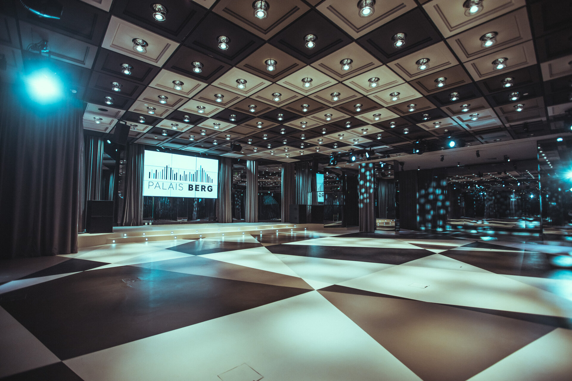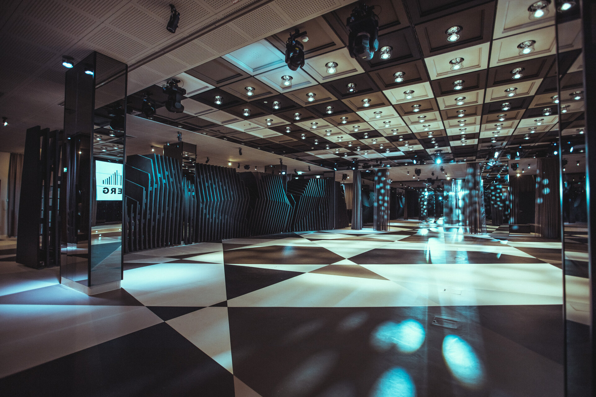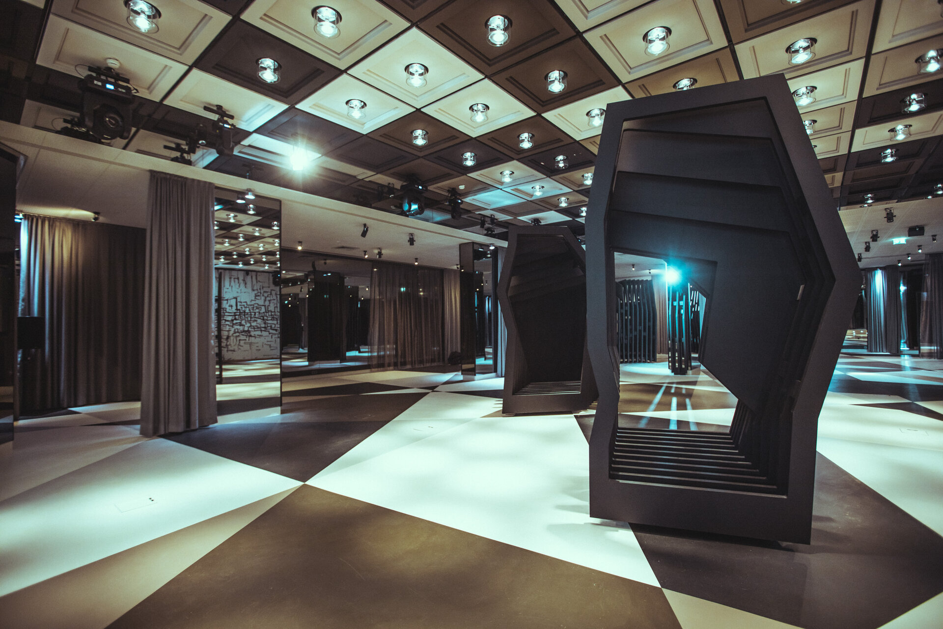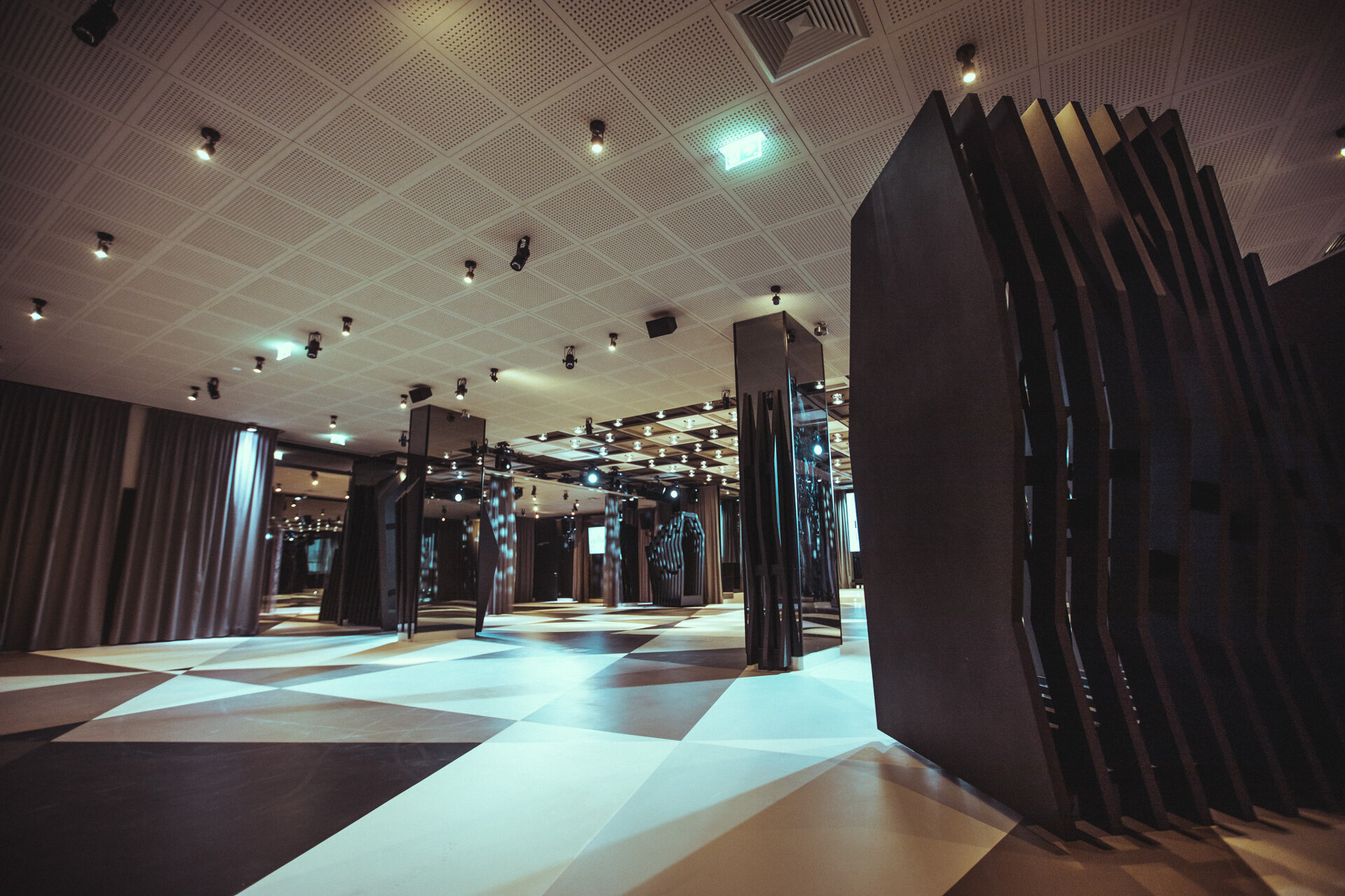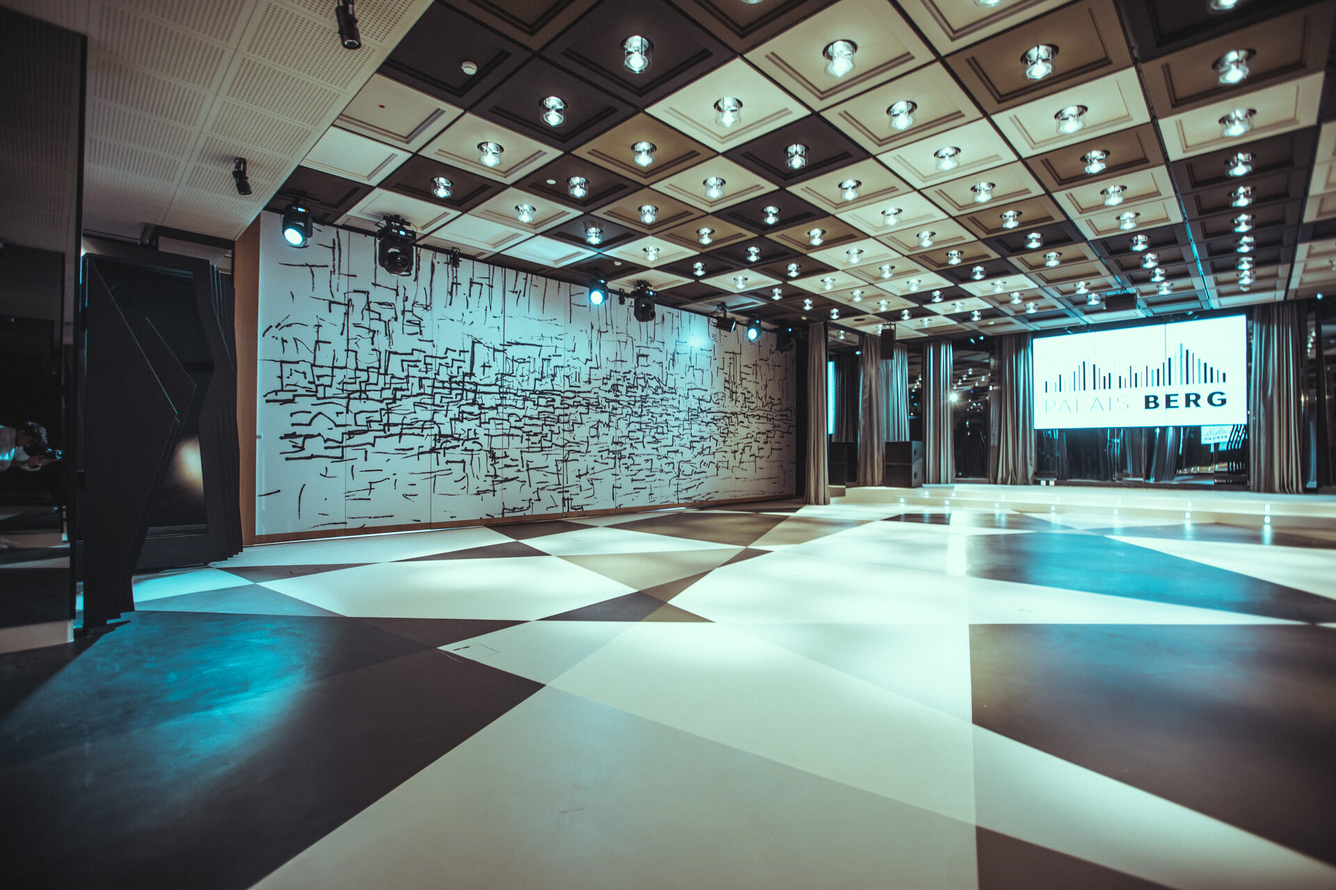 Der Boden des Konferenzsaals spiegelt die Farben der Decke wieder, ein geometrisches Spiel von Formen und Erdtönen. Ein Raumteiler – welcher der Veranstaltungsstätte ihren Namen gibt – ähnelt einem mobilen schwarzen Berg. Er wirkt nicht nur als optisches Highlight, sondern schafft Raum für Varianten. Dreidimensionale, geometrische Blöcke können auf unterschiedlicher Weise kombiniert werden: Sie lassen gebrochenes Licht durch; es entstehen überraschende, auch irritierende optische Effekte. Die graphischen Elemente spiegeln sich in den großformatigen Spiegeln und so wird das Raumerlebnis nahezu ins Unendliche vergrößert. Das Graffiti der Decke bildet den Bezug zur Arecibo-Botschaft – ein binärer Code, der Informationen über die Biologie des Menschen enthält.