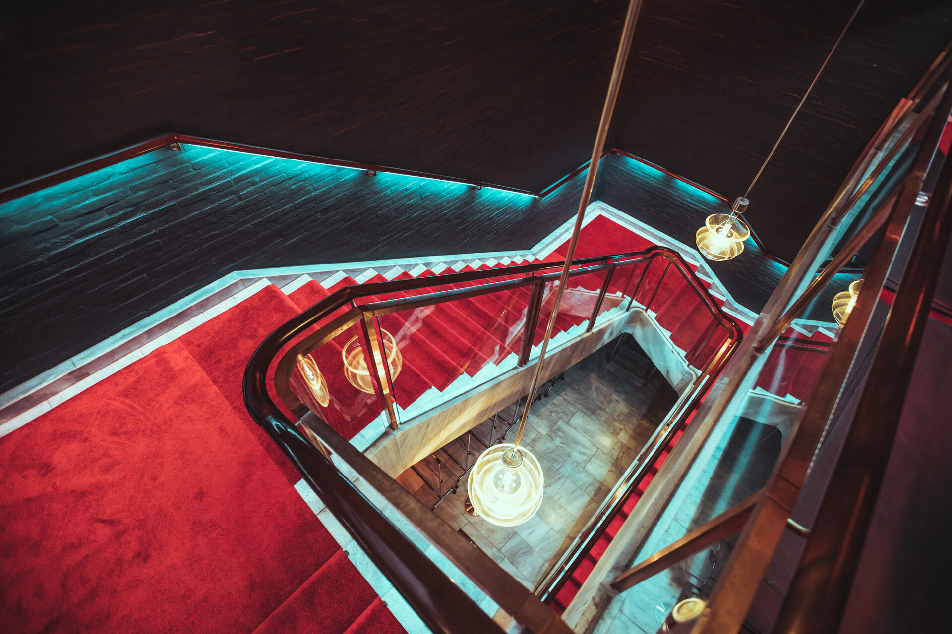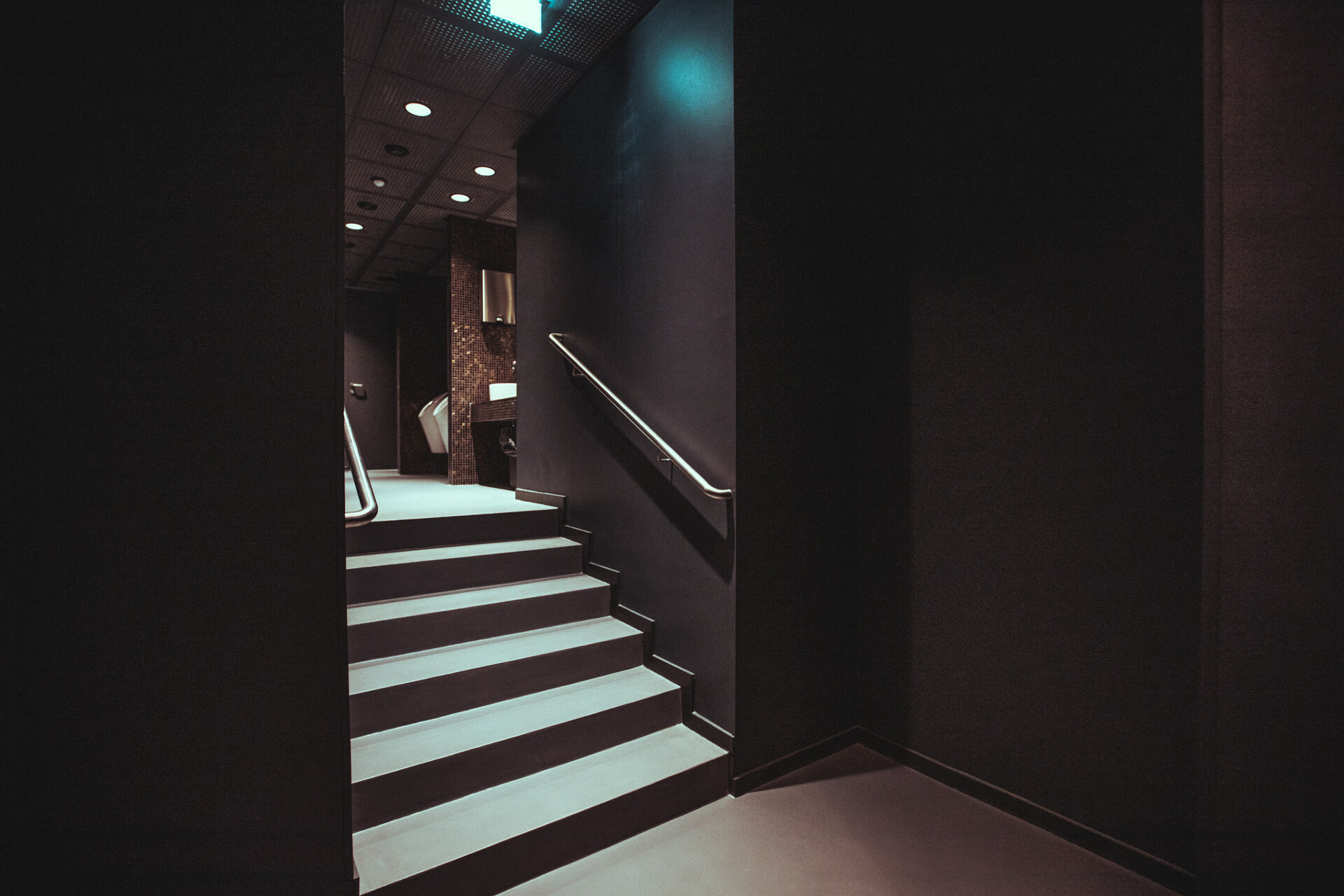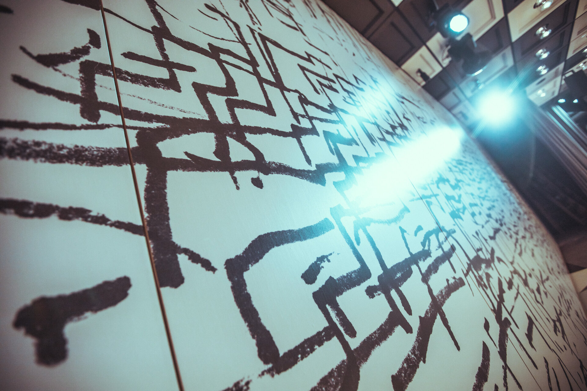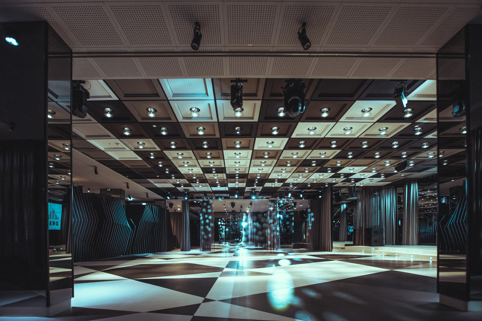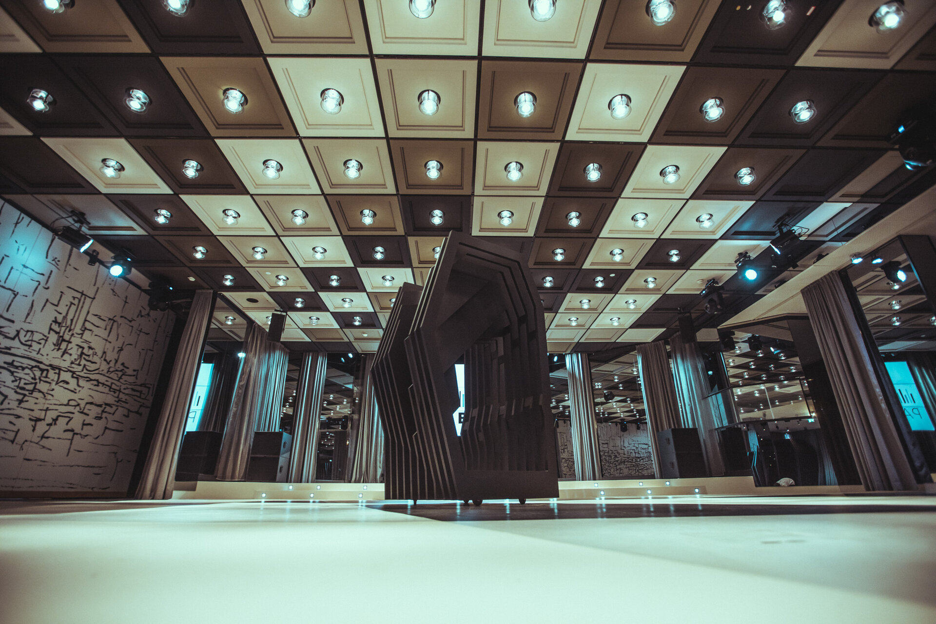 Der Boden des Konferenzsaals spiegelt die Farben der Decke wieder, ein geometrisches Spiel von Formen und Erdtönen. Ein Raumteiler – welcher der Veranstaltungsstätte ihren Namen gibt – ähnelt einem mobilen schwarzen Berg. Er wirkt nicht nur als optisches Highlight, sondern schafft Raum für Varianten. Dreidimensionale, geometrische Blöcke können auf unterschiedlicher Weise kombiniert werden: Sie lassen gebrochenes Licht durch; es entstehen überraschende, auch irritierende optische Effekte. Die graphischen Elemente spiegeln sich in den großformatigen Spiegeln und so wird das Raumerlebnis nahezu ins Unendliche vergrößert. Das Graffiti der Decke bildet den Bezug zur Arecibo-Botschaft – ein binärer Code, der Informationen über die Biologie des Menschen enthält.