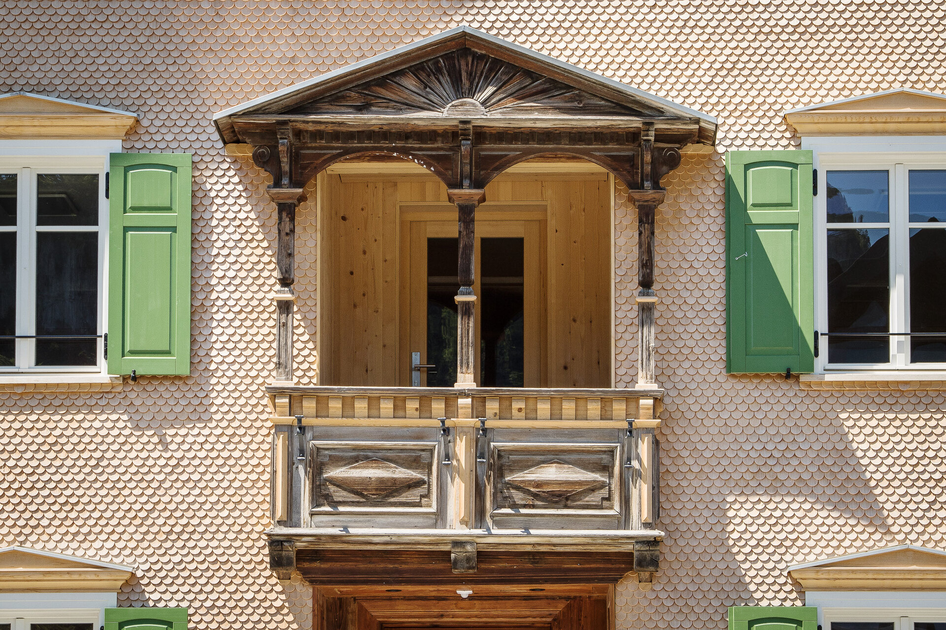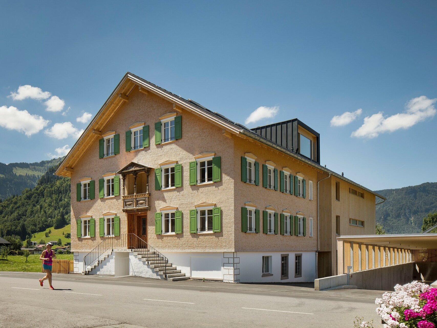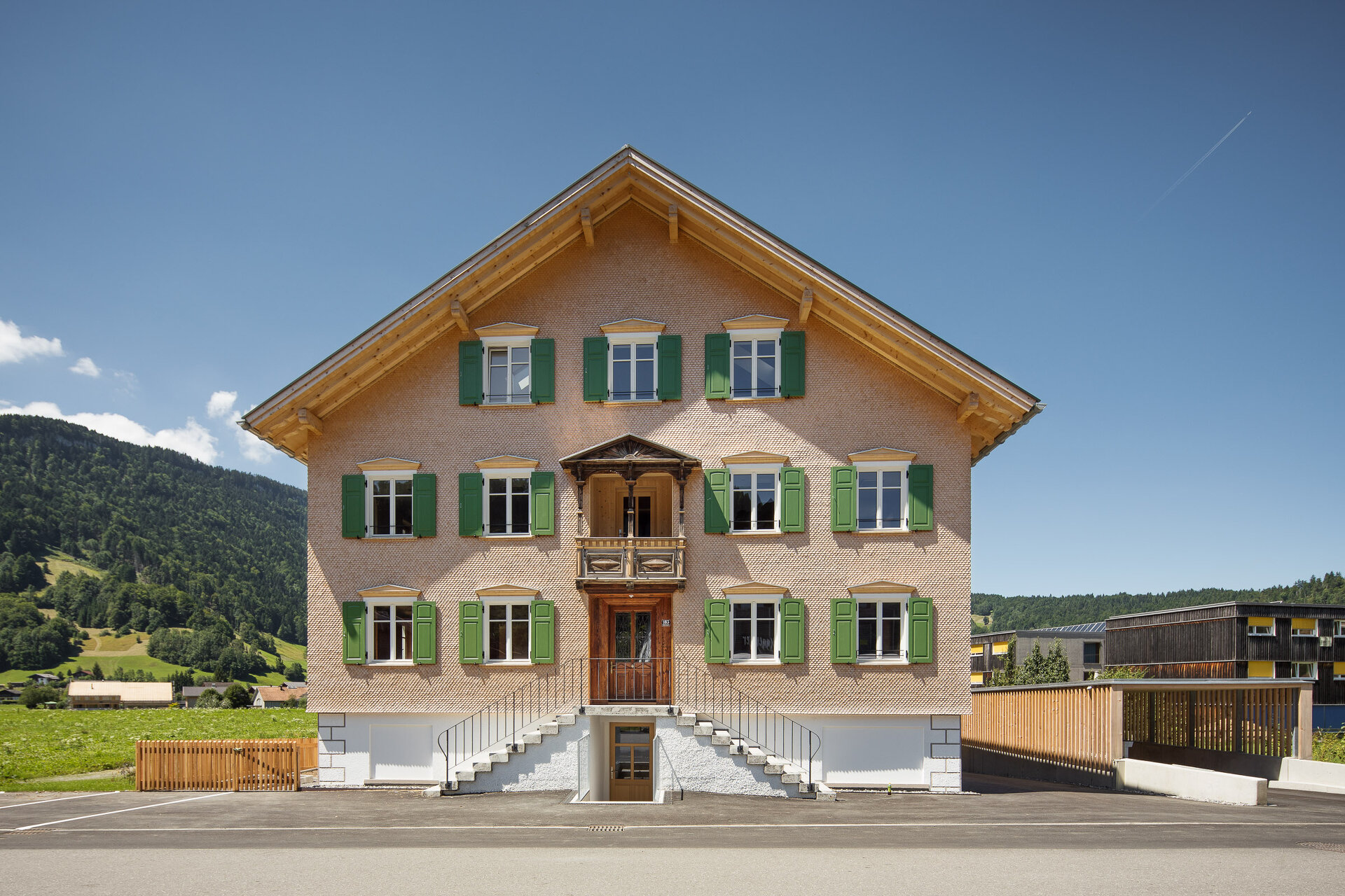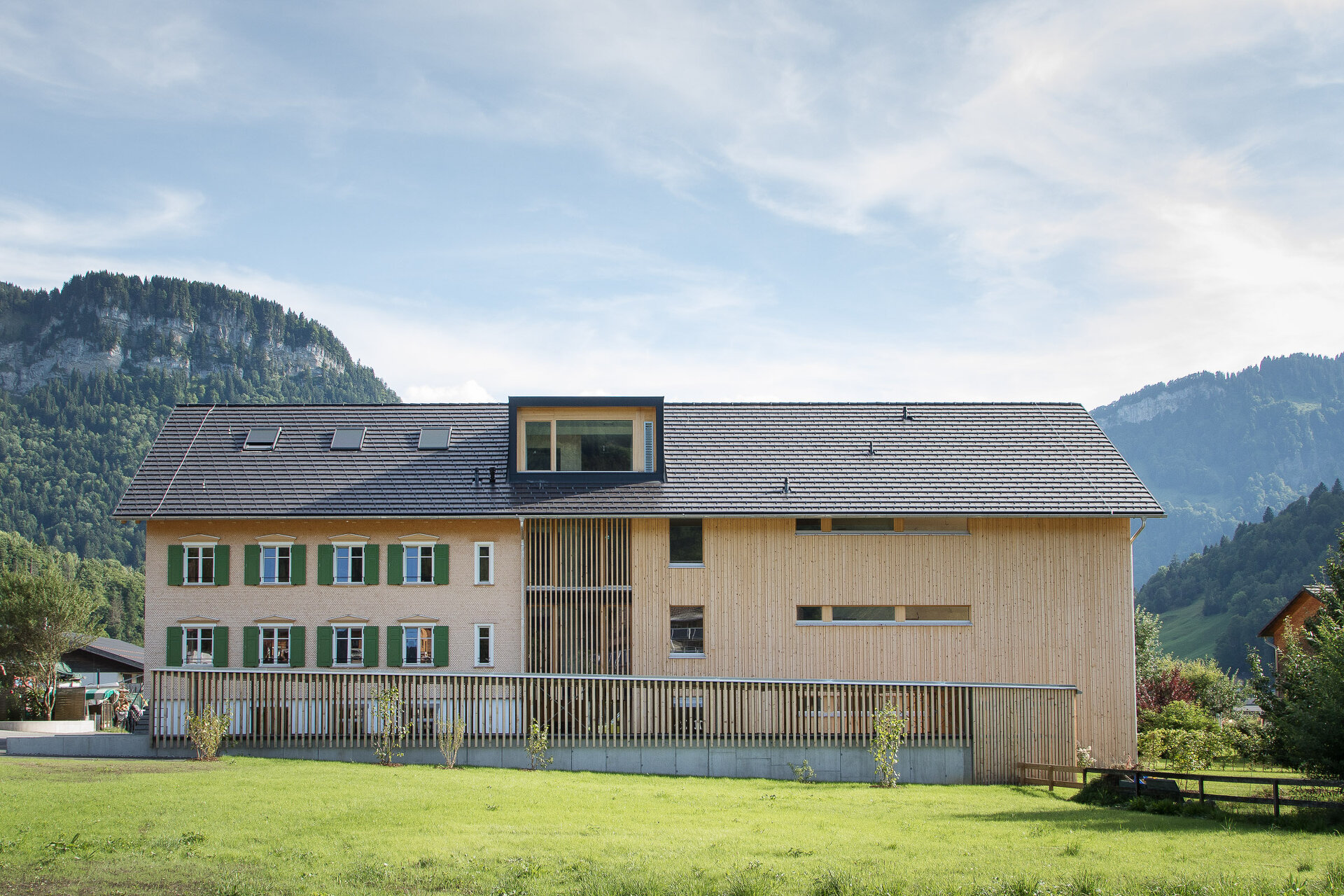 Die traditionelle Zweiteilung des Gebäudetypus sollte erhalten bleiben, so wurde dem geschindelten, durch Lochfenster rhythmisierten Baukörper des Vorderhauses ein kompaktes, senkrechtverschaltes Volumen als Hinterhaus angeschlossen. Der neue Teil ist nach aktuellen ökologischen und bautechnischen Richtlinien als Holzbau im Passivhausstandard errichtet. Er fasst neun klar strukturierte, barrierefreie und großzügig belichtete Wohneinheiten, die sich durch Gartenanteile oder Loggien zur nachhaltig bewirtschafteten Kulturlandschaft öffnen.