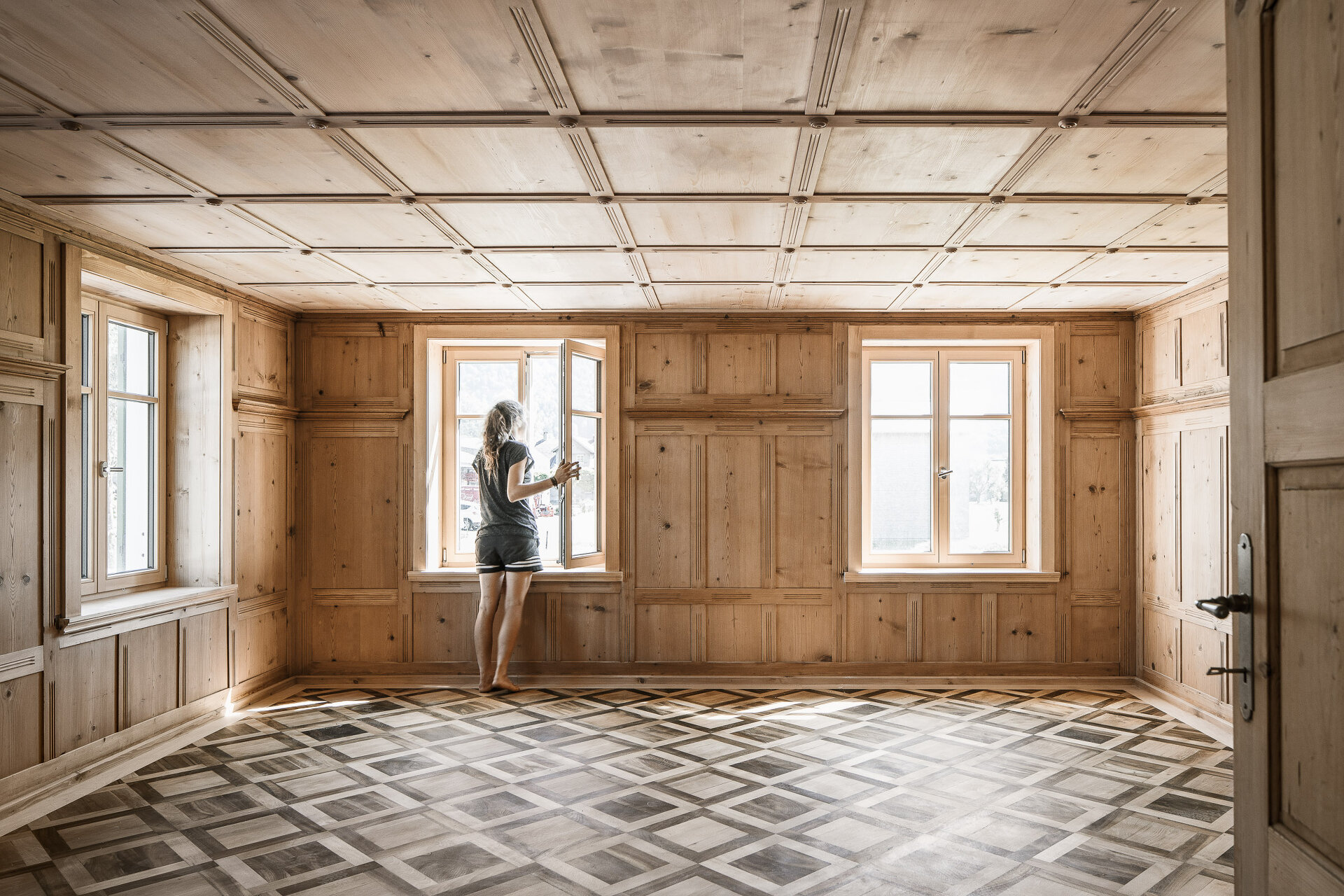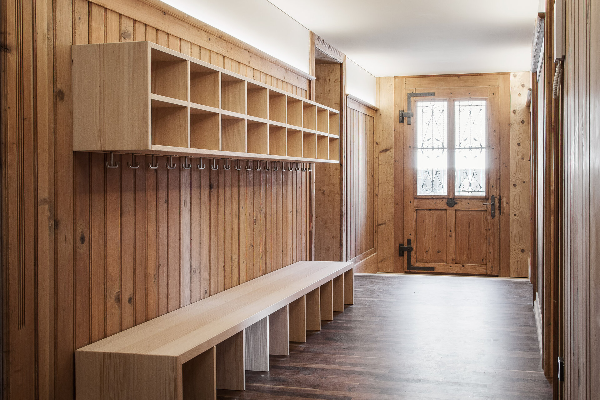Der Bestand wird behutsam renoviert und thermisch saniert und bietet verschiedenen sozialen Einrichtungen Platz. Nach Rücksprache mit dem Bundesdenkmalamt wurden originale Türen, Stubentäfer und Parkettböden ausgebaut, restauriert und sorgfältig wieder an ihren Platz gefügt, die Fenster hingegen durch Neuanfertigungen in Weißtanne ersetzt.