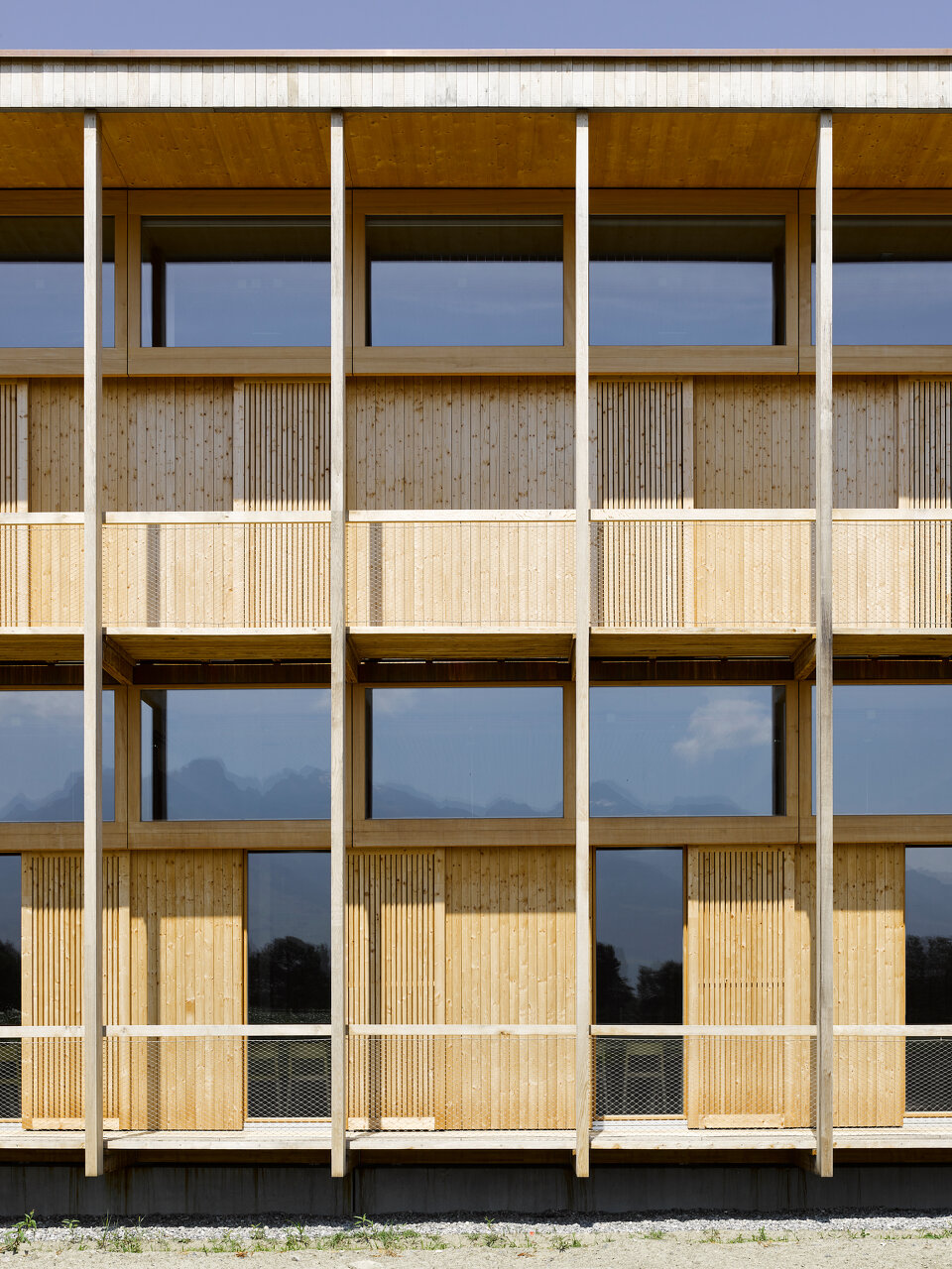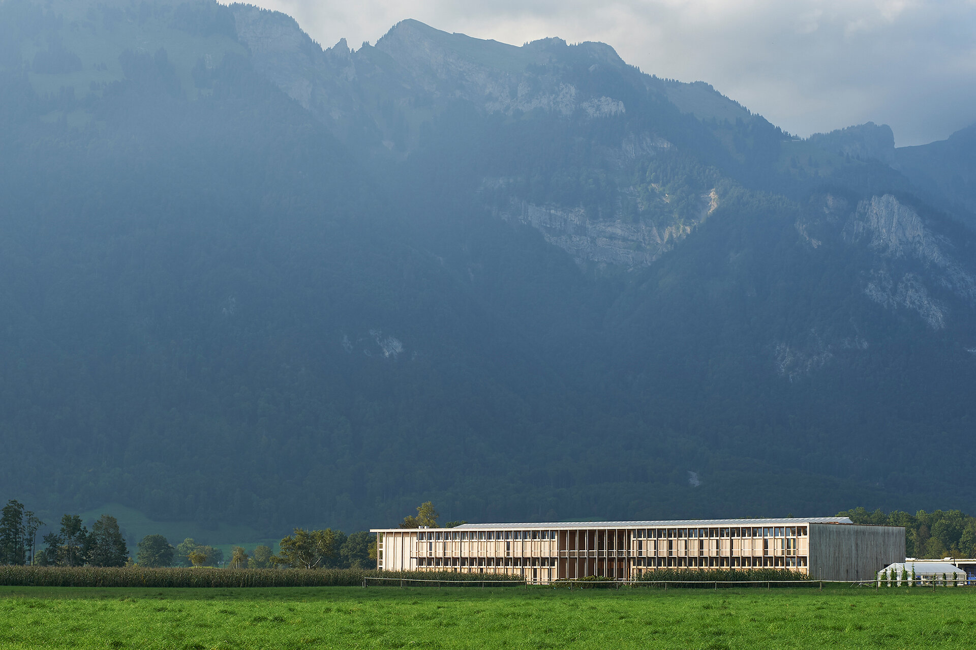 Der langgezogene Schultrakt ist zweigeschossig, der Internatstrakt steht dazu quer, ist gleich hoch, hat jedoch drei Stockwerke. Ein durchgezogener Raster ermöglicht große Flexibilität im Grundriss. Beim Betreten des Foyers geht der Blick durch das Gebäude hindurch über den Hof in die Weite des Rheintals. Von hier erreicht man den lichtdurchfluteten, zweigeschossigen Mensaraum, anschließend die Aula und den Küchenbereich sowie einige Unterrichtszimmer. Weitere Klassen befinden sich im ersten Obergeschoss, diese sind beidseitig belichtet.
