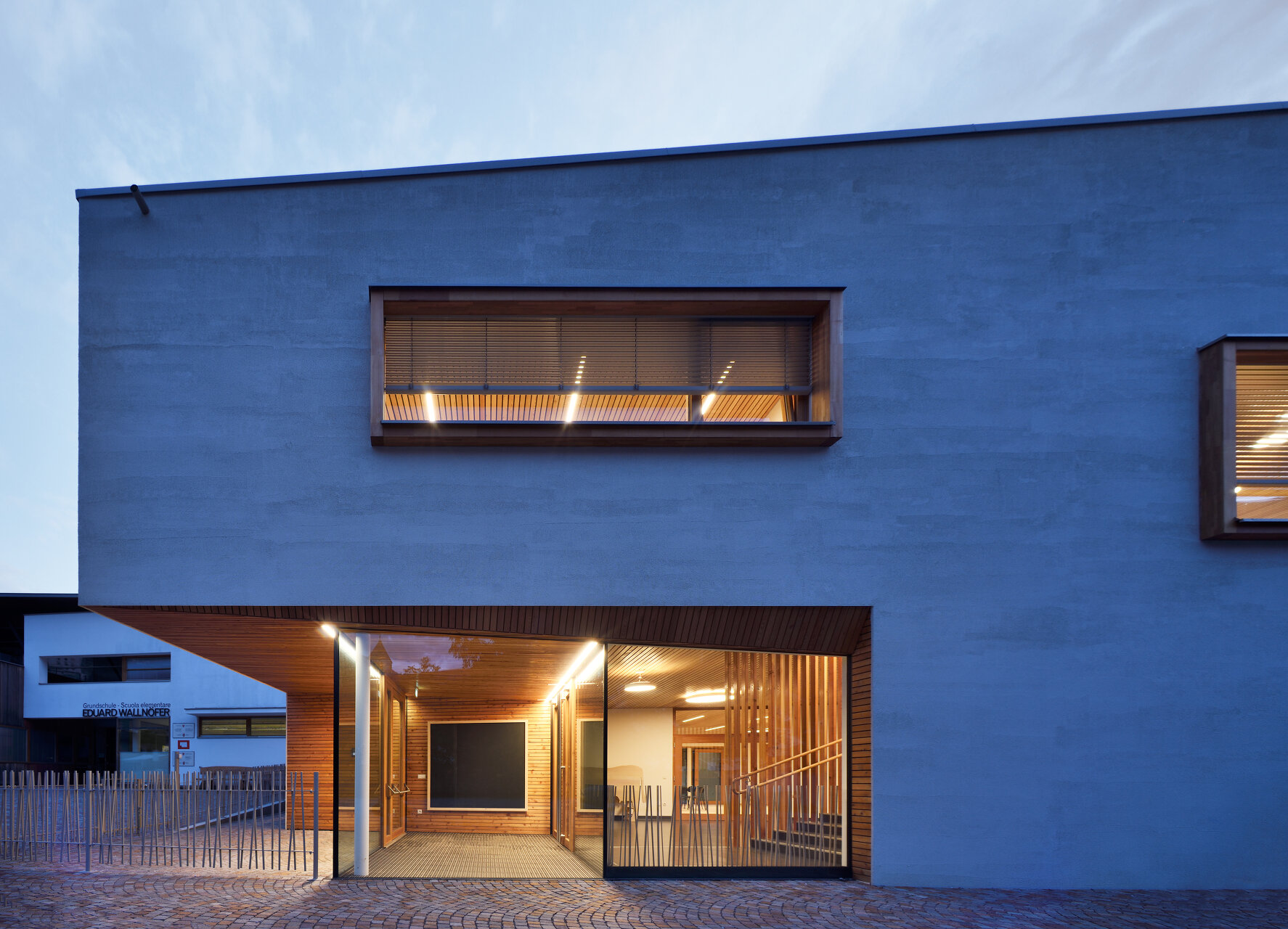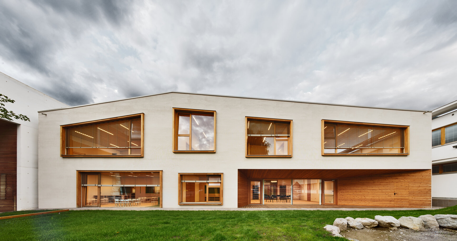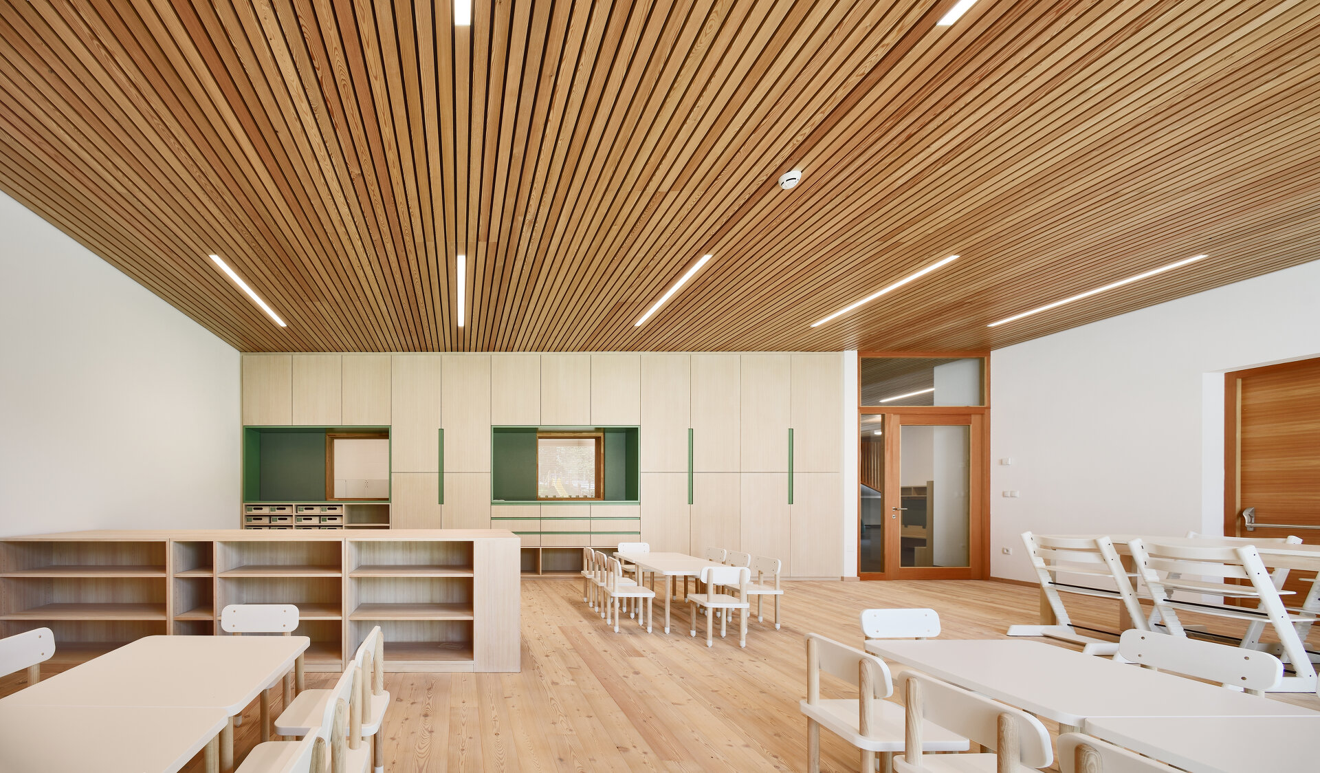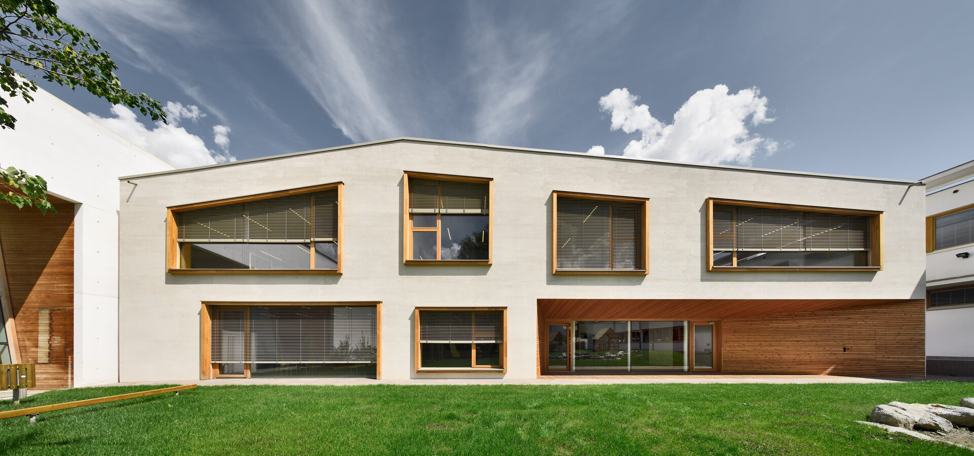 Maßgefertigte Holzmöbel wie Hocker, Tische und Schränke vermitteln mit bewusst eingesetzten Farben Geborgenheit. Im Obergeschoss zeichnet sich das Satteldach in den Raumhöhen ab. Konstruktiv ist das Gebäude als Holzbau errichtet. Der Wechsel zwischen Holz und verputzten Oberflächen ist innen wie außen durchgezogen, wobei das Holz (Latten der Akustikdecken, Türen) dominiert. Dieses Natur-Material wiederholt sich außen bei den Einschnitten der weiteren Zugänge und den Fensterelementen. Ein Gründach und Klimahaus-Standard A sind Anliegen die Nachhaltigkeit des Gebäudes zu erhöhen. (Text: Martina Pfeifer Steiner, nach einem Text der Architekten)