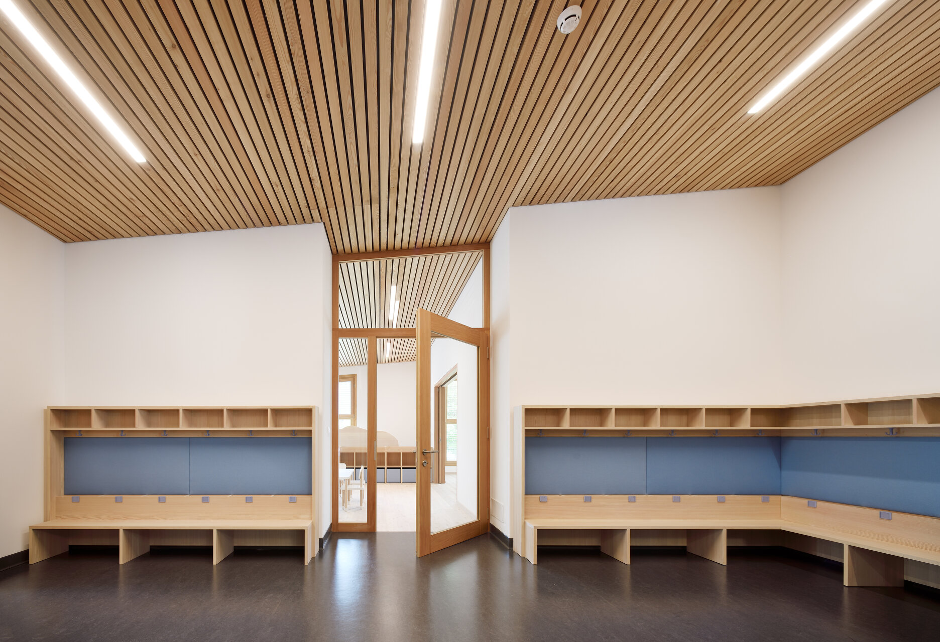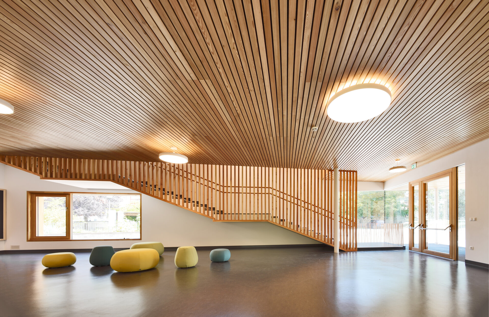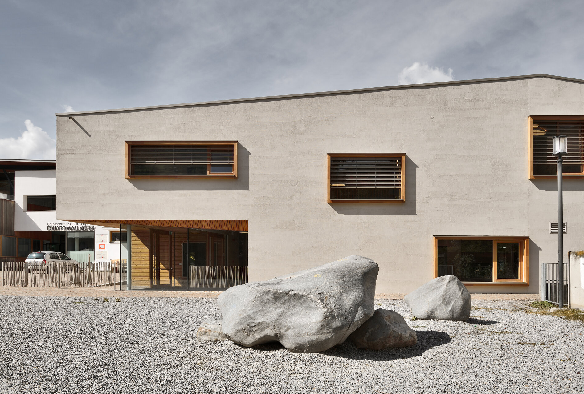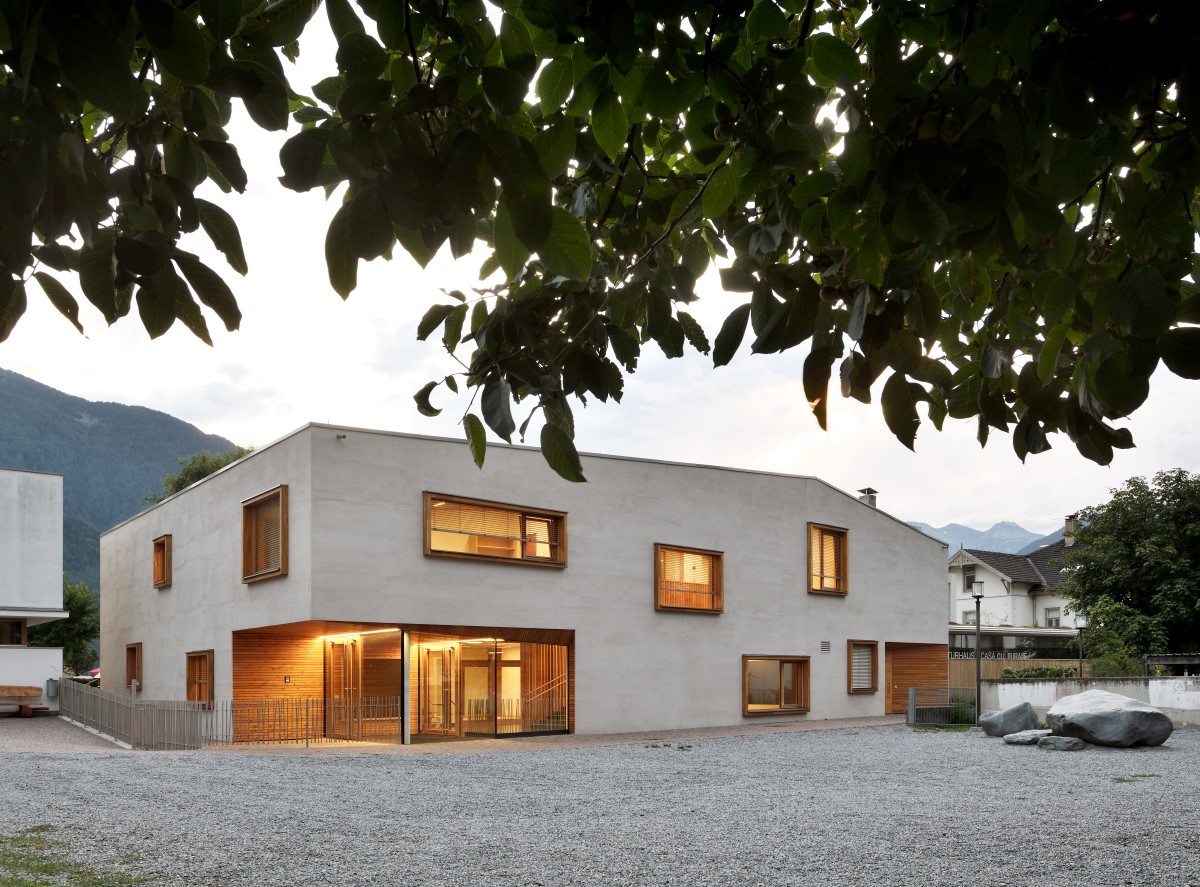 Maßgefertigte Holzmöbel wie Hocker, Tische und Schränke vermitteln mit bewusst eingesetzten Farben Geborgenheit. Im Obergeschoss zeichnet sich das Satteldach in den Raumhöhen ab. Konstruktiv ist das Gebäude als Holzbau errichtet. Der Wechsel zwischen Holz und verputzten Oberflächen ist innen wie außen durchgezogen, wobei das Holz (Latten der Akustikdecken, Türen) dominiert. Dieses Natur-Material wiederholt sich außen bei den Einschnitten der weiteren Zugänge und den Fensterelementen. Ein Gründach und Klimahaus-Standard A sind Anliegen die Nachhaltigkeit des Gebäudes zu erhöhen. (Text: Martina Pfeifer Steiner, nach einem Text der Architekten)
