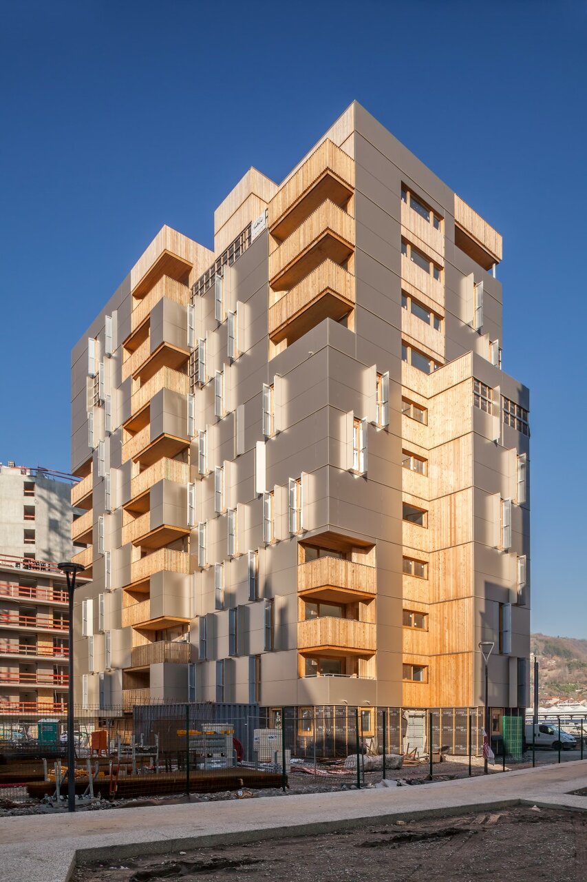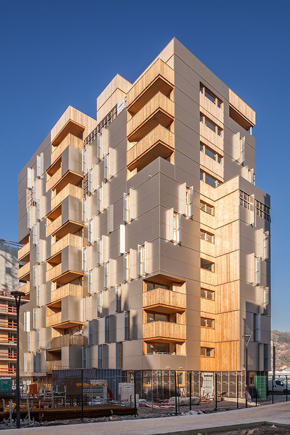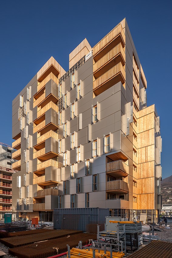 Si les planchers et les murs de refends sont en béton, l'ensemble des murs d'enveloppe sont des murs manteaux bois rempli d'isolant biosourcés de type laine de bois. Le dernier étage en attique est entièrement en bois. Le choix de deux vêtures : l'aluminium et le bardage bois mélèze permet de composer une modénature de façade qui façonne l'identité du bâtiment dans le grand paysage.