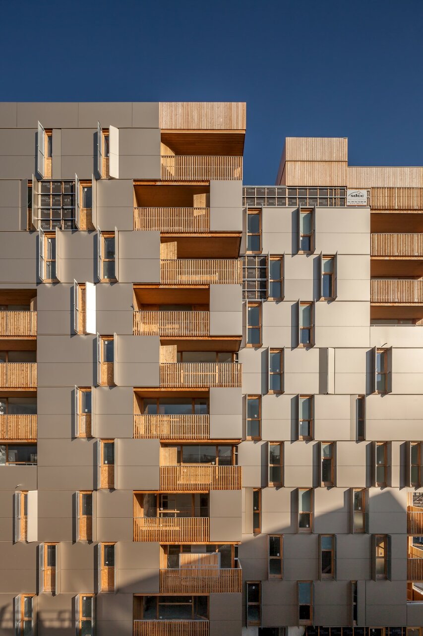 L'ensemble des menuiseries extérieures sont en bois de pays et sont protégées contre le vieillissement par une lazure. Tout les logements sont au minimum en double orientation et 40% sont même en triple orientation. cette variété d'orientation enrichit la qualité spatiale des logements et facilite leur ventilation naturelle pendant la saison chaude.