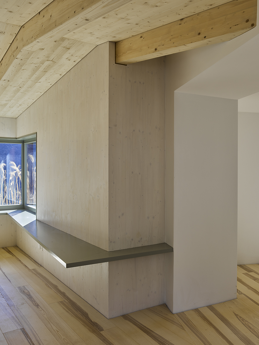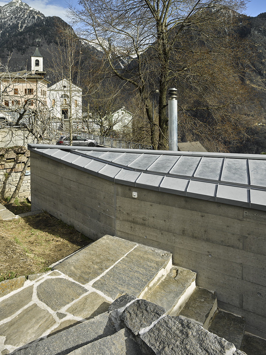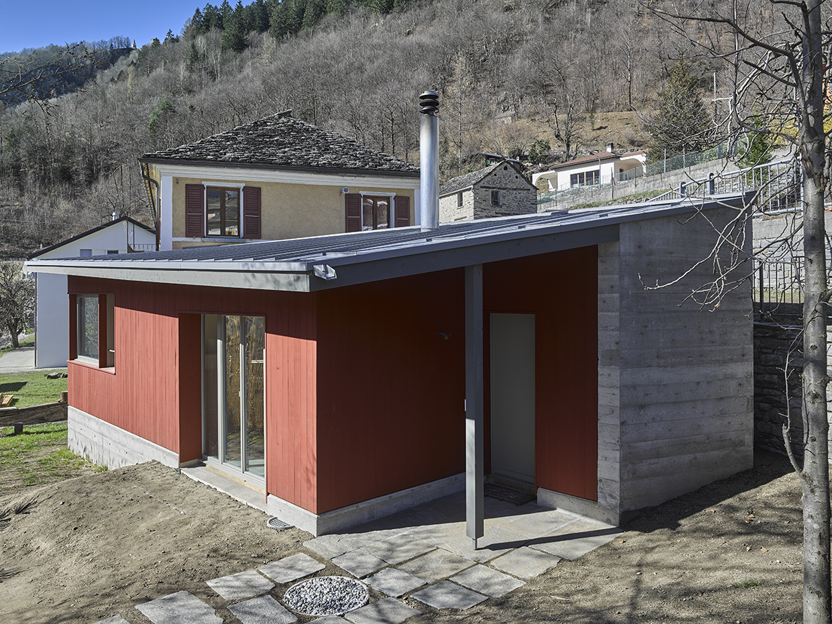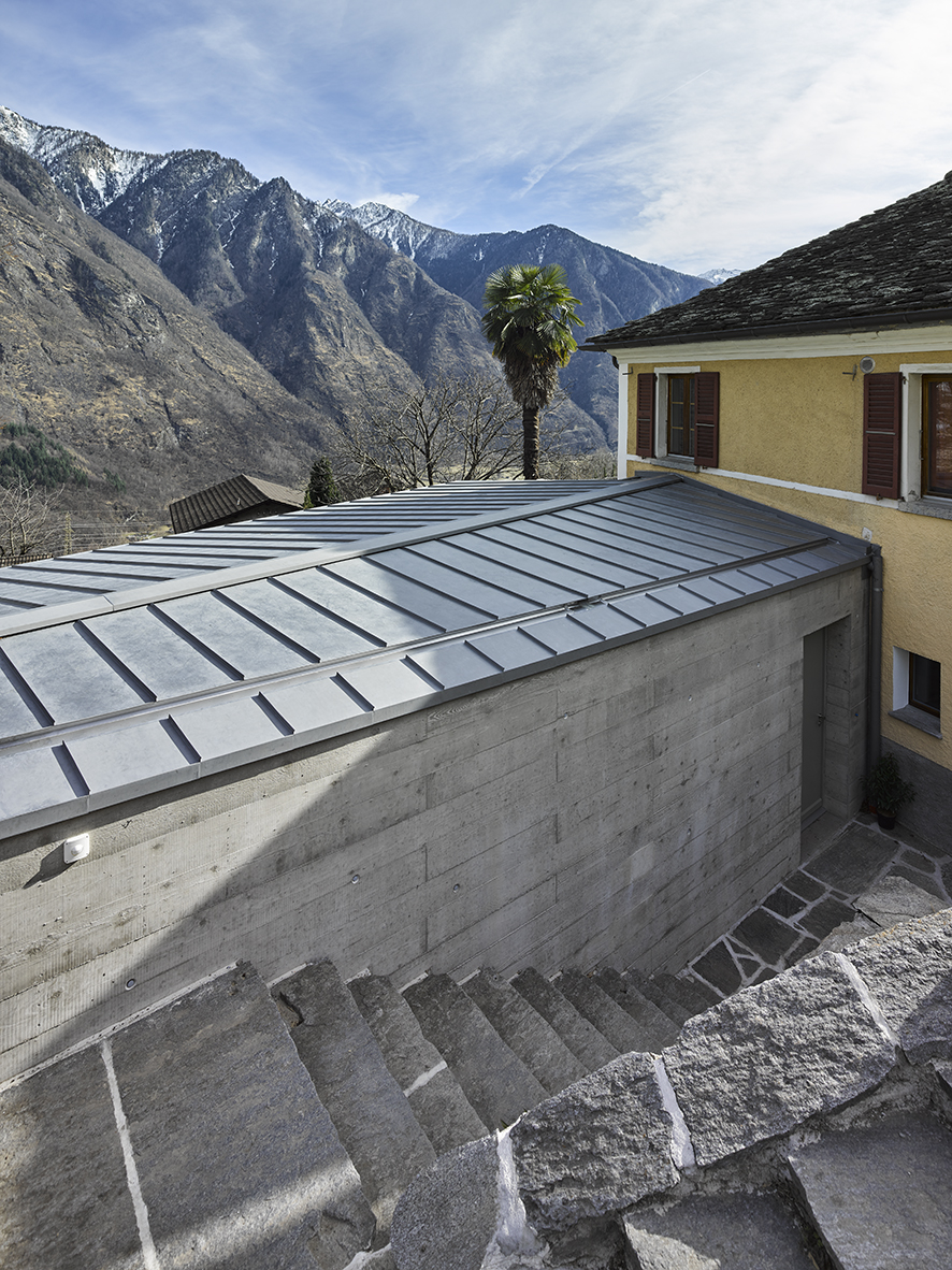Der Anbau wird von Süden her erschlossen, über eine Aussentreppe gelangt man in die zentrale Eingangshalle. Durch das Abdrehen des Volumens wird die Sichtachse Alt–Neu angelegt, auch der Dachfirst zeichnet diese diagonale Linie nach. Im Kontrast zum Bestand ist der Anbau ein Hybrid aus Beton und Holz. Die massive Rückseite folgt dem Mauerlauf der bestehenden Bruchsteinmauern, die Gartenfassade ist Holzrahmenbauweise. Damit wird das Haupthaus mit neuen Qualitäten und interessanten Raumabfolgen erweitert. (Text: Architektin, bearbeitet)