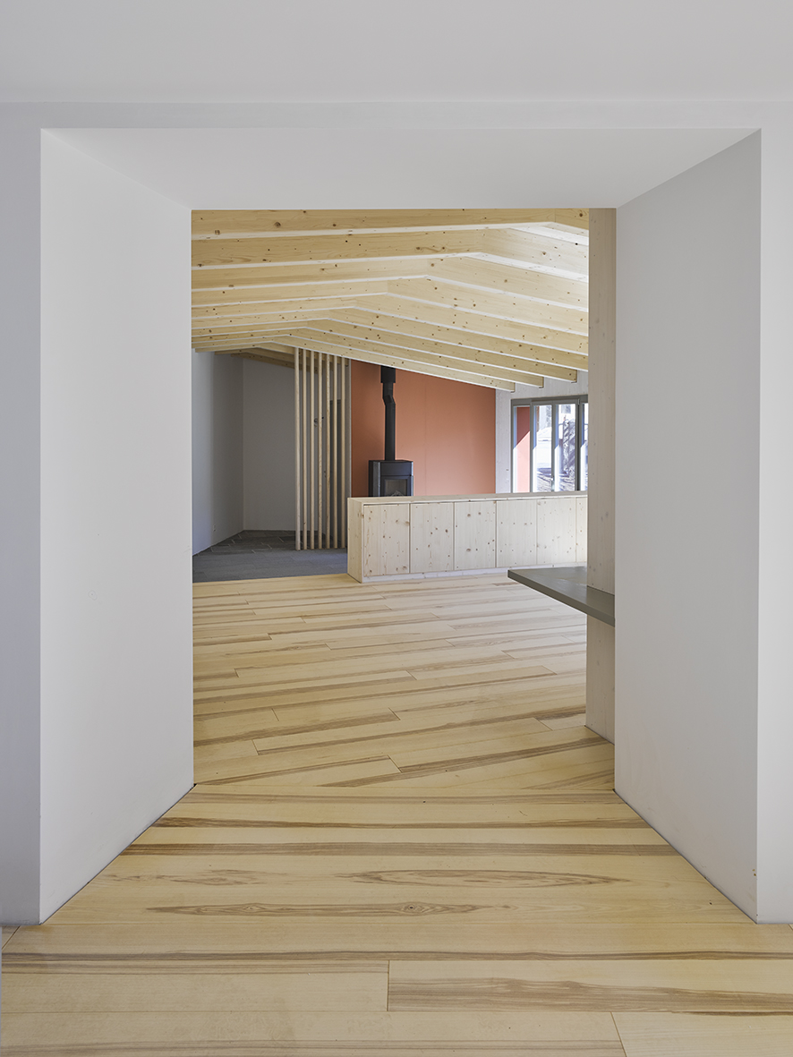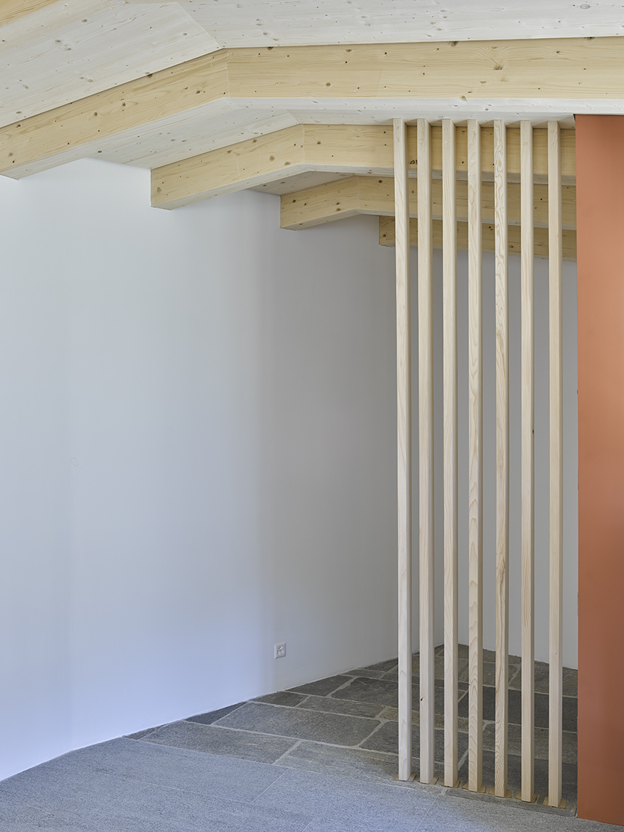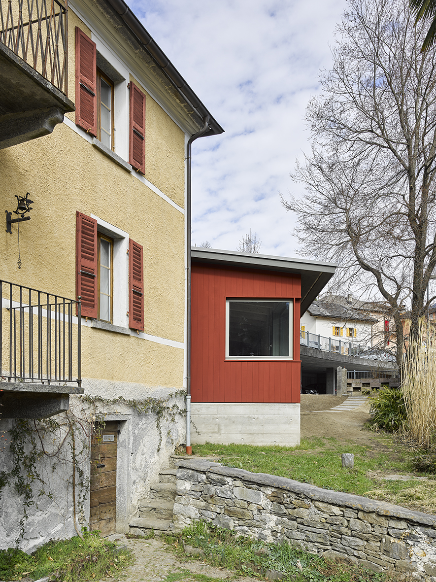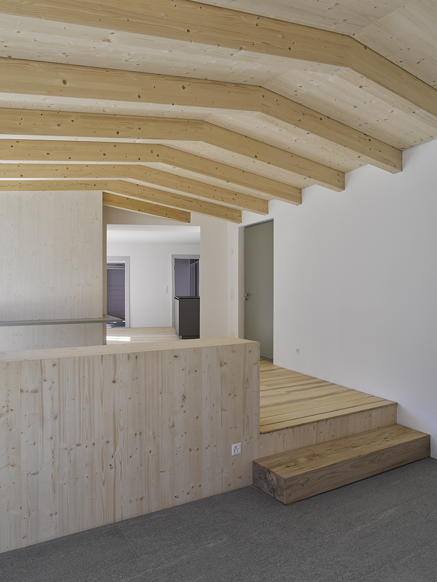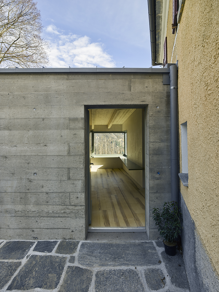 Längst als Wohnhaus genutzt, wollte der Bauherr das Haus erweitern und zwei unabhängige Wohnungen mit separaten Eingängen schaffen. Von der Denkmalpflege her war es wichtig das Haupthaus mit einem Anbau nicht zu konkurrenzieren und auf eine harmonische Einbettung zu achten. Das Haupthaus wurde wieder auf das ursprüngliche Volumen zurück gebaut und nordseitig der kleine Treppenhaus-Anbau abgebrochen. Die obere Einliegerwohnung ist nun über eine kleine Brücke aus Ortbeton direkt von der Kantonsstrasse zugänglich.