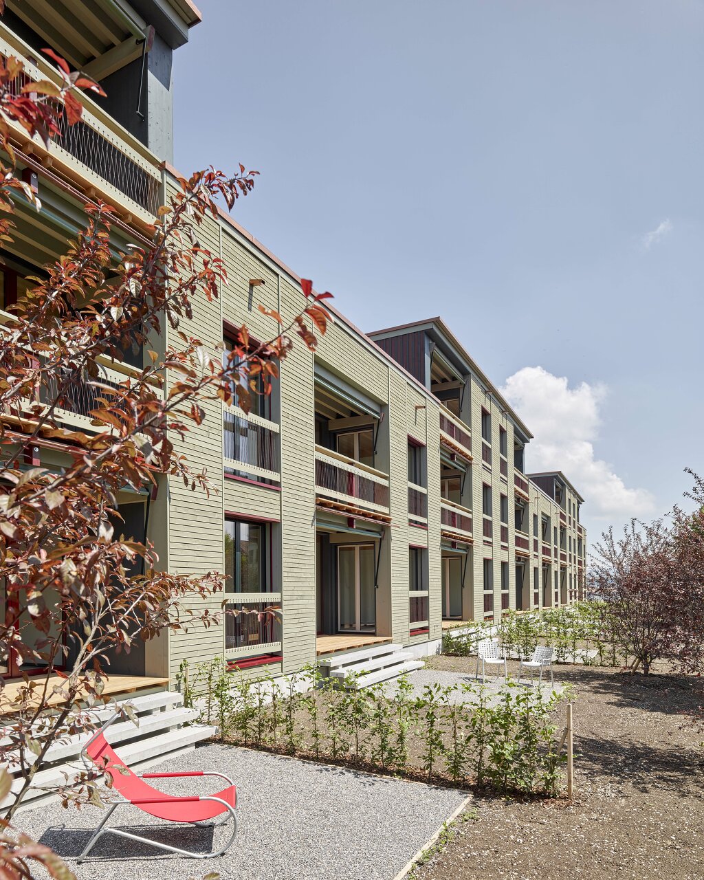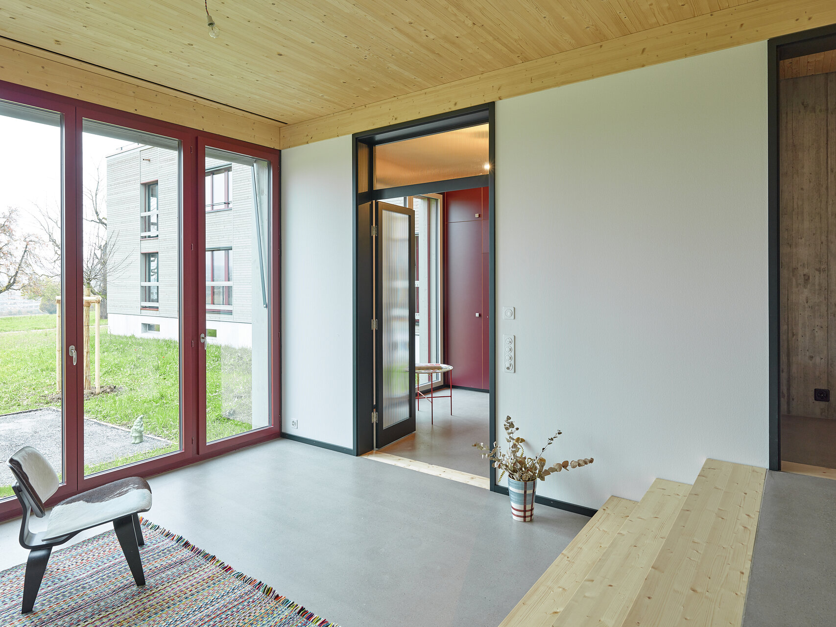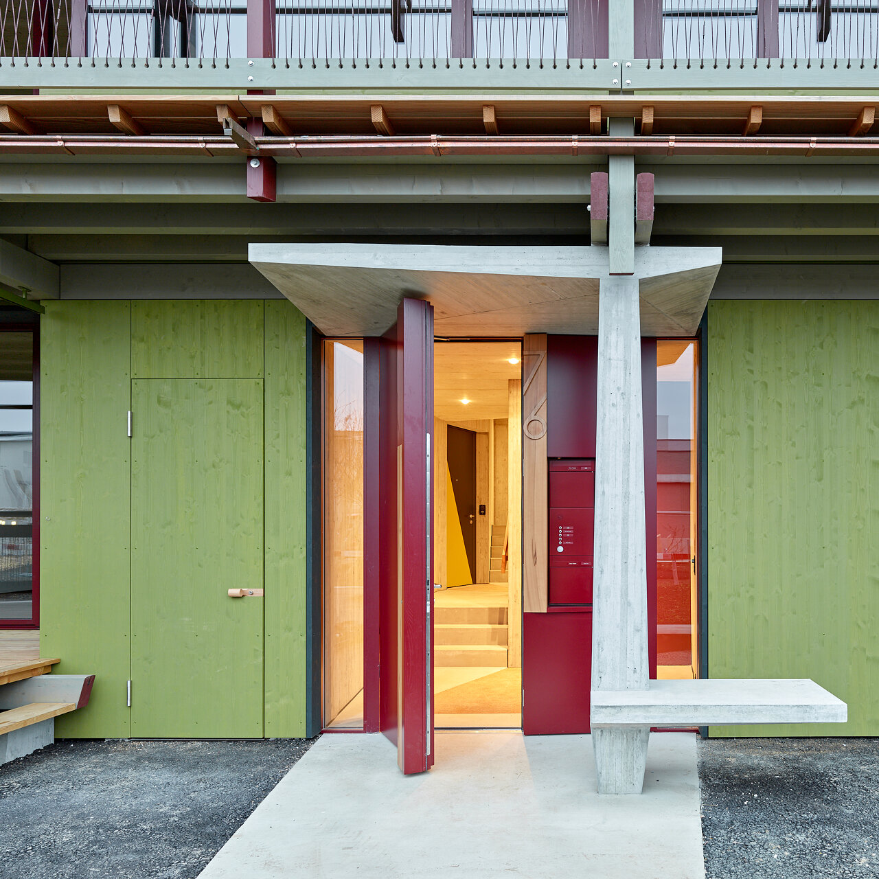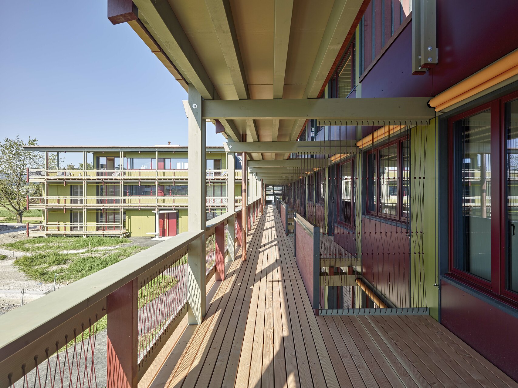 Die 48 Wohnungen in den dreigeschossigen Wohnbauten schaffen preiswerten Wohnraum mit unterschiedlichen Wohnungsgrößen für eine breite Zielgruppe. Das Kellergeschoss und die Treppentürme sind in Ortbeton gegossen und bilden das aussteifende Skelett für die Wohnebenen in Holzbauweise. Aus akustischen und ökonomischen Gründen sind die Geschossdecken als kompakte Holz-Beton-Verbunddecken ausgeführt. Mit Gipsplatten verkleidete Holzständerwände bilden die tragenden und nichtragenden Innenwände. (Text: Architekt:innen, bearbeitet)