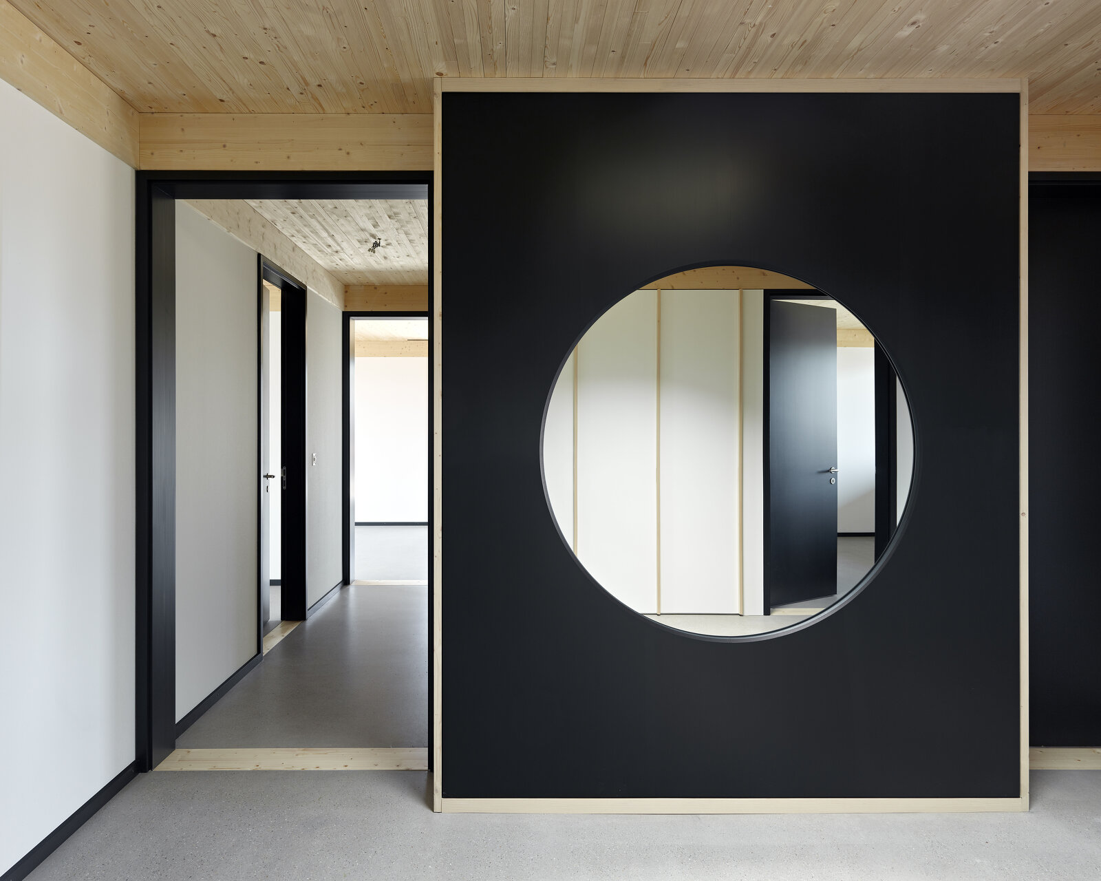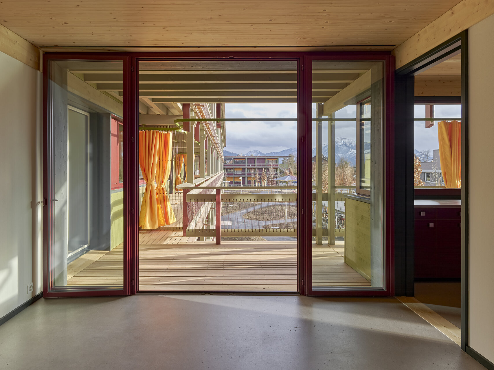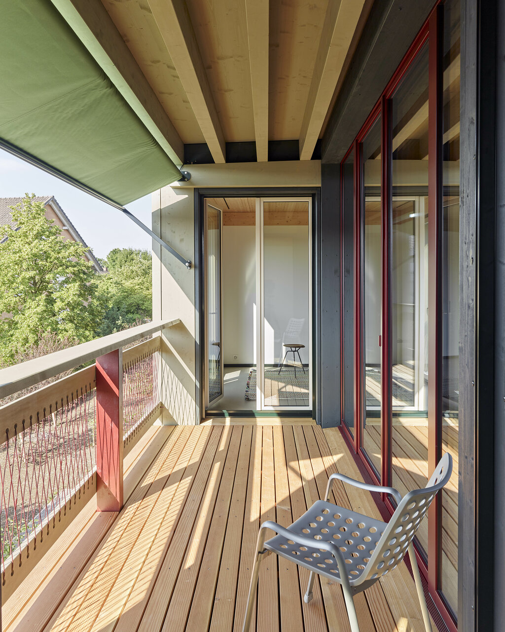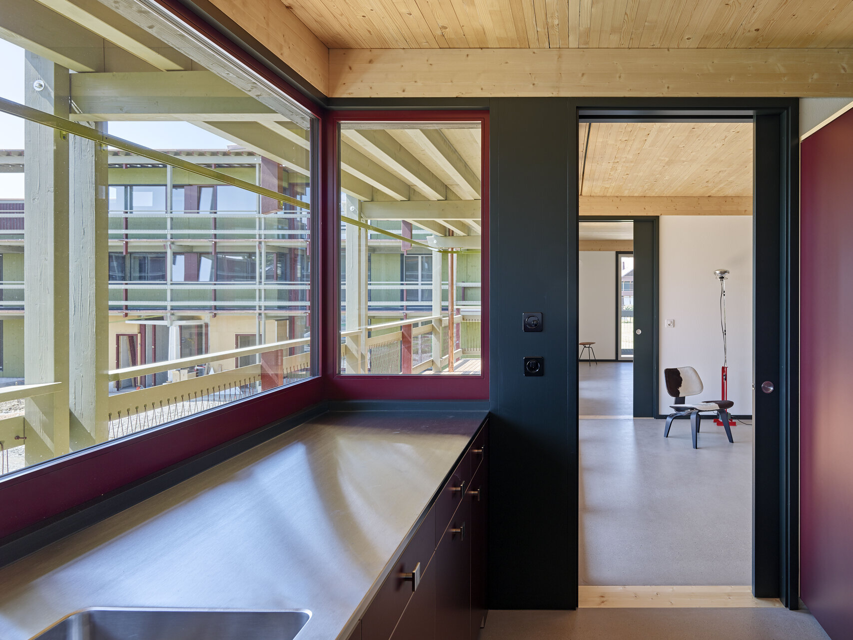 Die 48 Wohnungen in den dreigeschossigen Wohnbauten schaffen preiswerten Wohnraum mit unterschiedlichen Wohnungsgrößen für eine breite Zielgruppe. Das Kellergeschoss und die Treppentürme sind in Ortbeton gegossen und bilden das aussteifende Skelett für die Wohnebenen in Holzbauweise. Aus akustischen und ökonomischen Gründen sind die Geschossdecken als kompakte Holz-Beton-Verbunddecken ausgeführt. Mit Gipsplatten verkleidete Holzständerwände bilden die tragenden und nichtragenden Innenwände. (Text: Architekt:innen, bearbeitet)
