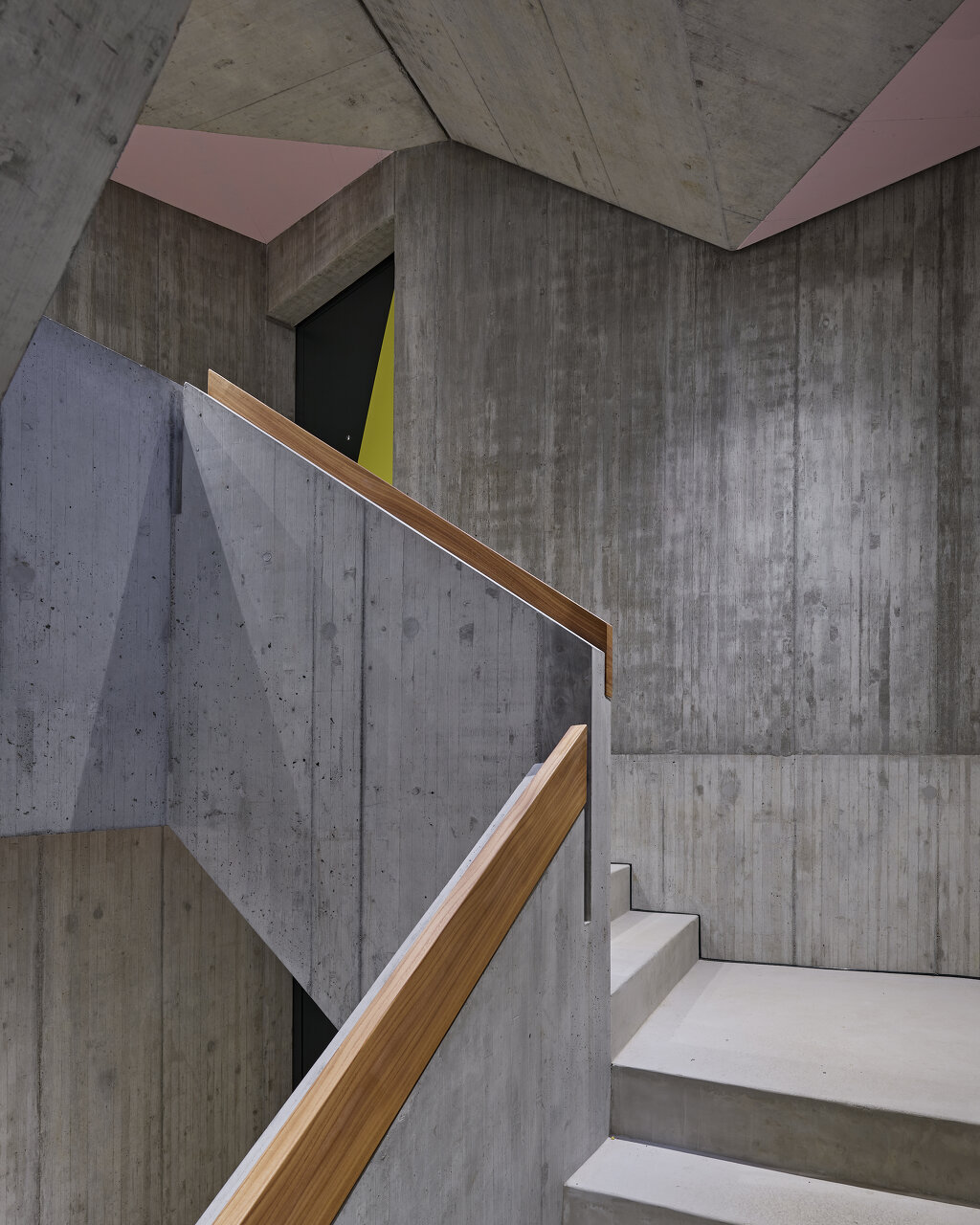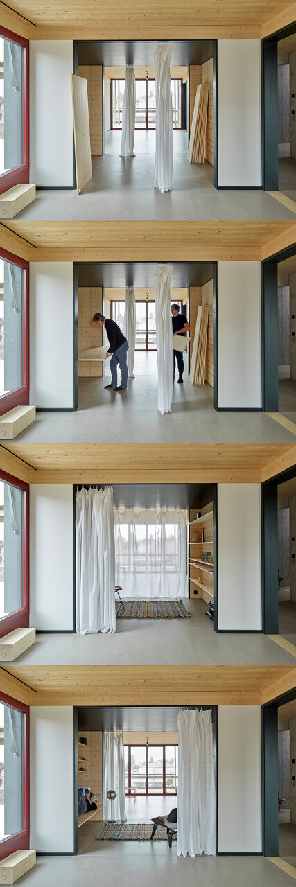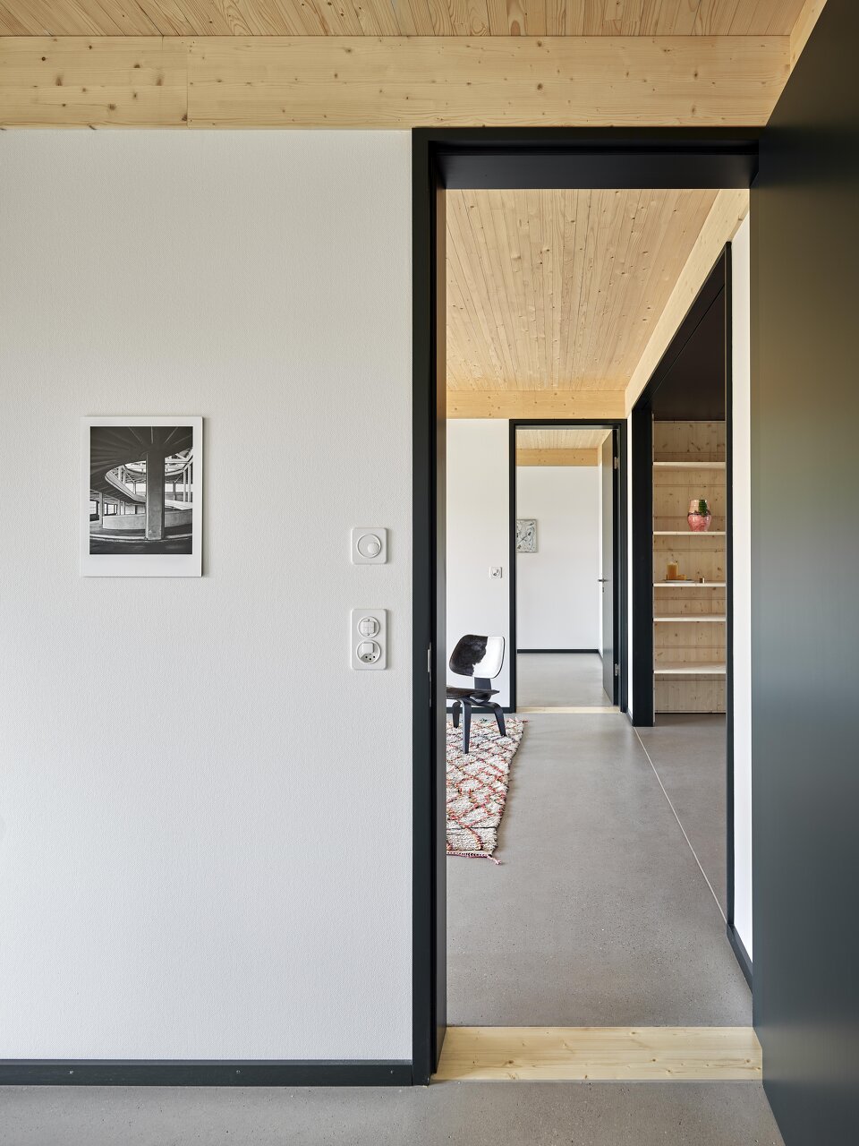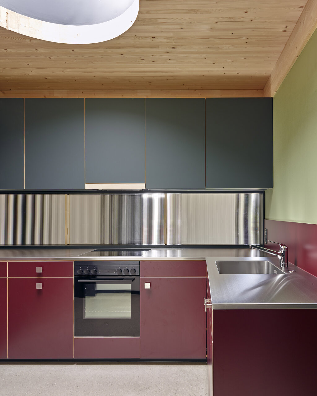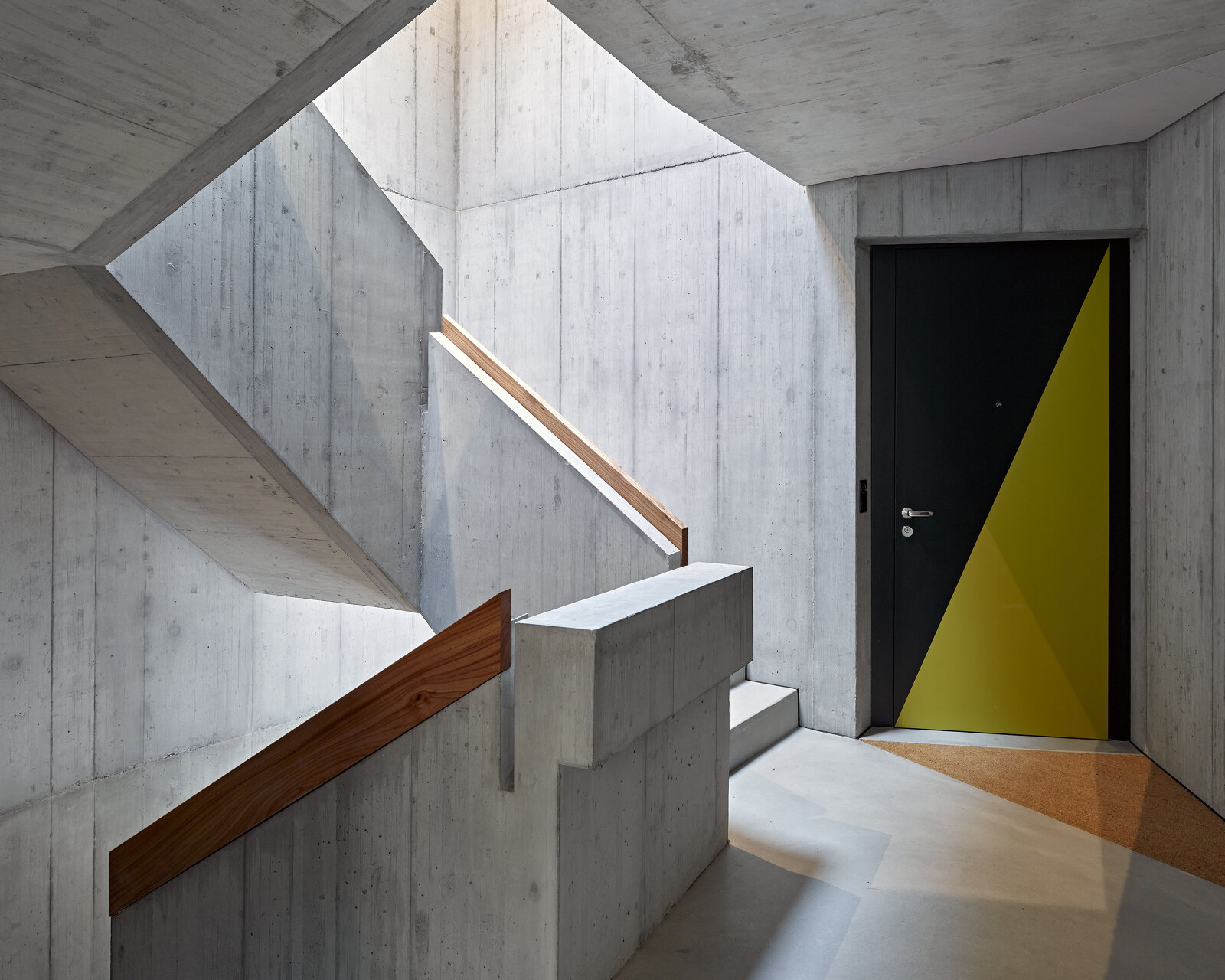 Die 48 Wohnungen in den dreigeschossigen Wohnbauten schaffen preiswerten Wohnraum mit unterschiedlichen Wohnungsgrößen für eine breite Zielgruppe. Das Kellergeschoss und die Treppentürme sind in Ortbeton gegossen und bilden das aussteifende Skelett für die Wohnebenen in Holzbauweise. Aus akustischen und ökonomischen Gründen sind die Geschossdecken als kompakte Holz-Beton-Verbunddecken ausgeführt. Mit Gipsplatten verkleidete Holzständerwände bilden die tragenden und nichtragenden Innenwände. (Text: Architekt:innen, bearbeitet)