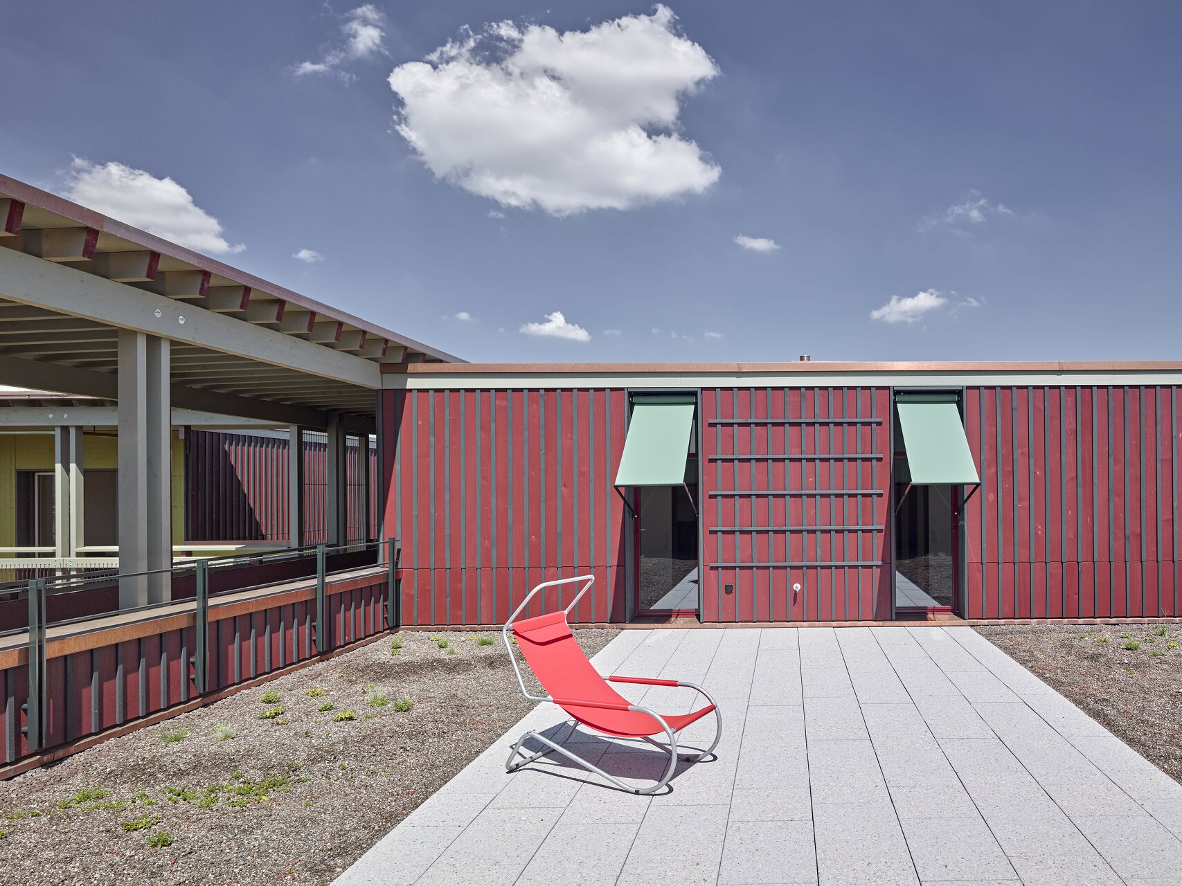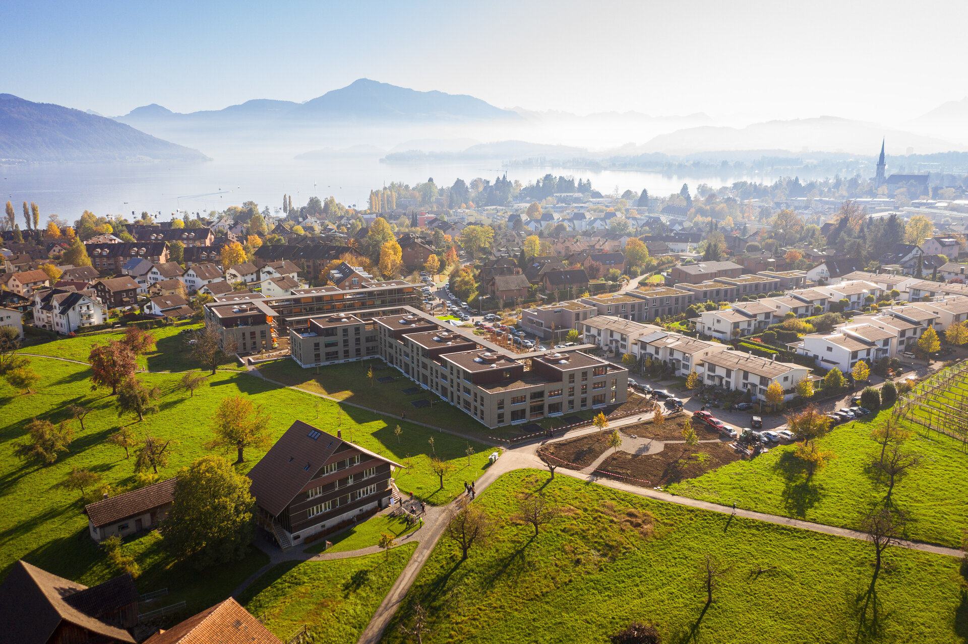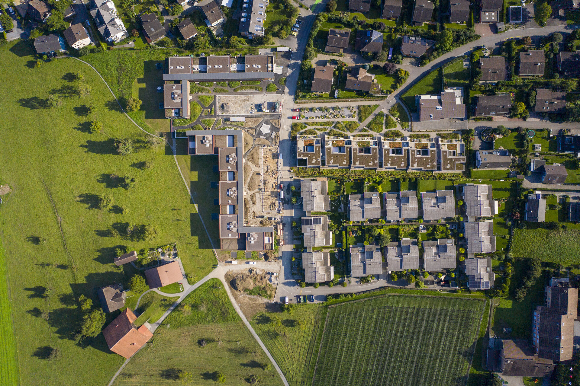 Ein S- und ein L-förmiges Volumen bilden zusammen zur siedlungsseitigen Mugerenstraße einen halboffenen Hofraum und zur Landschaft eine klare Grenze. Auf die unterschiedlichen Nachbarschaften wird mit dem Fassadenbild geantwortet. Eine den Gebäuden vorgestellte dreigeschossige, luftige Loggien- bzw. Laubengangschicht bildet den belebten und auch schützenden Filter zum gemeinschaftlichen Hofraum und der privaten Welt des Wohnens. Zur Landschaftsseite wenden sich großzügige Glasflächen mit Fernblick für die Bewohner:innen.