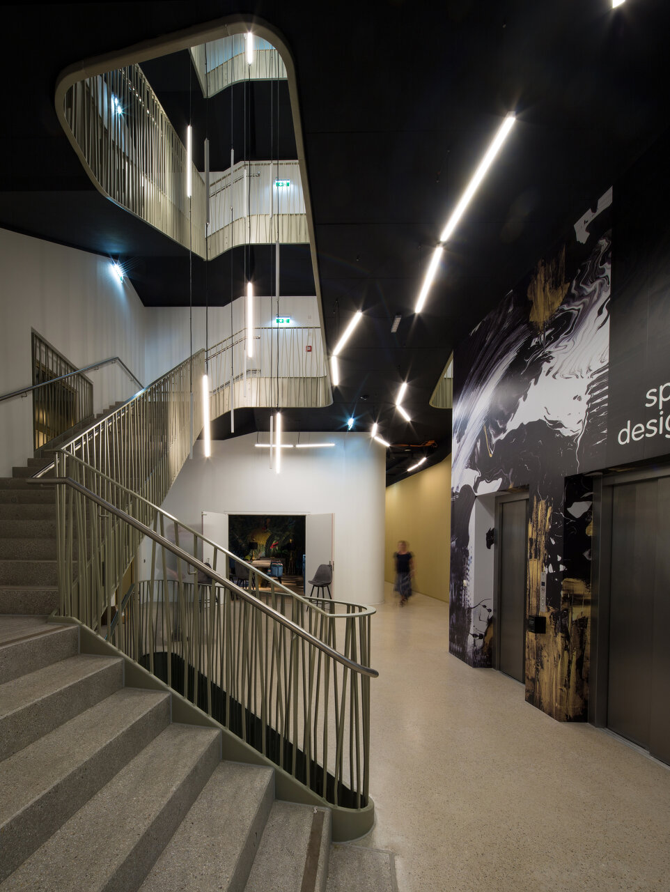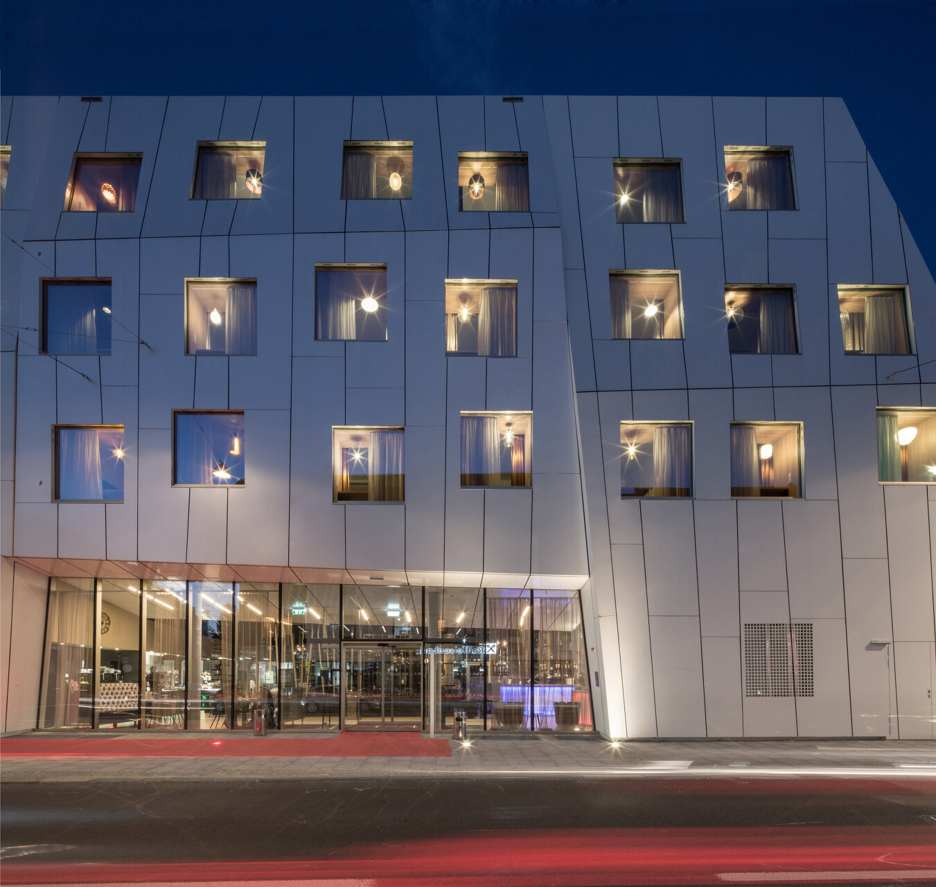 Die beiden Arme des U-förmigen Baukörpers verschmelzen mit dem bewaldeten Berg. Im Erdgeschoß gibt es eine Durchfahrt für PKW, Feuerwehr und Anlieferung. Das Hotel wird über einen gedeckten Zugang von der Straße betreten. Links sind Anmeldedesk und Nebenräume zu finden, geradeaus geht es in den Innenhof, rechts liegt der Frühstücksraum. Daran vorbei geht es in Seminarräume, Sauna und in die Obergeschoße. Die Hotelzimmer sind hangwärts einhüftig, zur Straße hin zweihüftig ausgeführt. Im obersten Geschoß sind die Zimmer durchgängig zum Hof orientiert. Der introvertierte, von der Straße abgewandte Innenhof wird vom Hotel als sommerliche Erweiterung des Frühstücksraums ins Freie genutzt. Um diesen Bereich nicht mit parkenden Autos zu beeinträchtigen, sind die Stellplätze hier unter einer begrünten Platte mit abgeböschtem Gelände versteckt. Die schlanke Organisationsstruktur des Betriebs mit wenigen Angestellten spiegelt sich im Raumprogramm: Der große Frühstücksraum wird tagsüber als Lobby genutzt, der Empfang ist zugleich Bar.