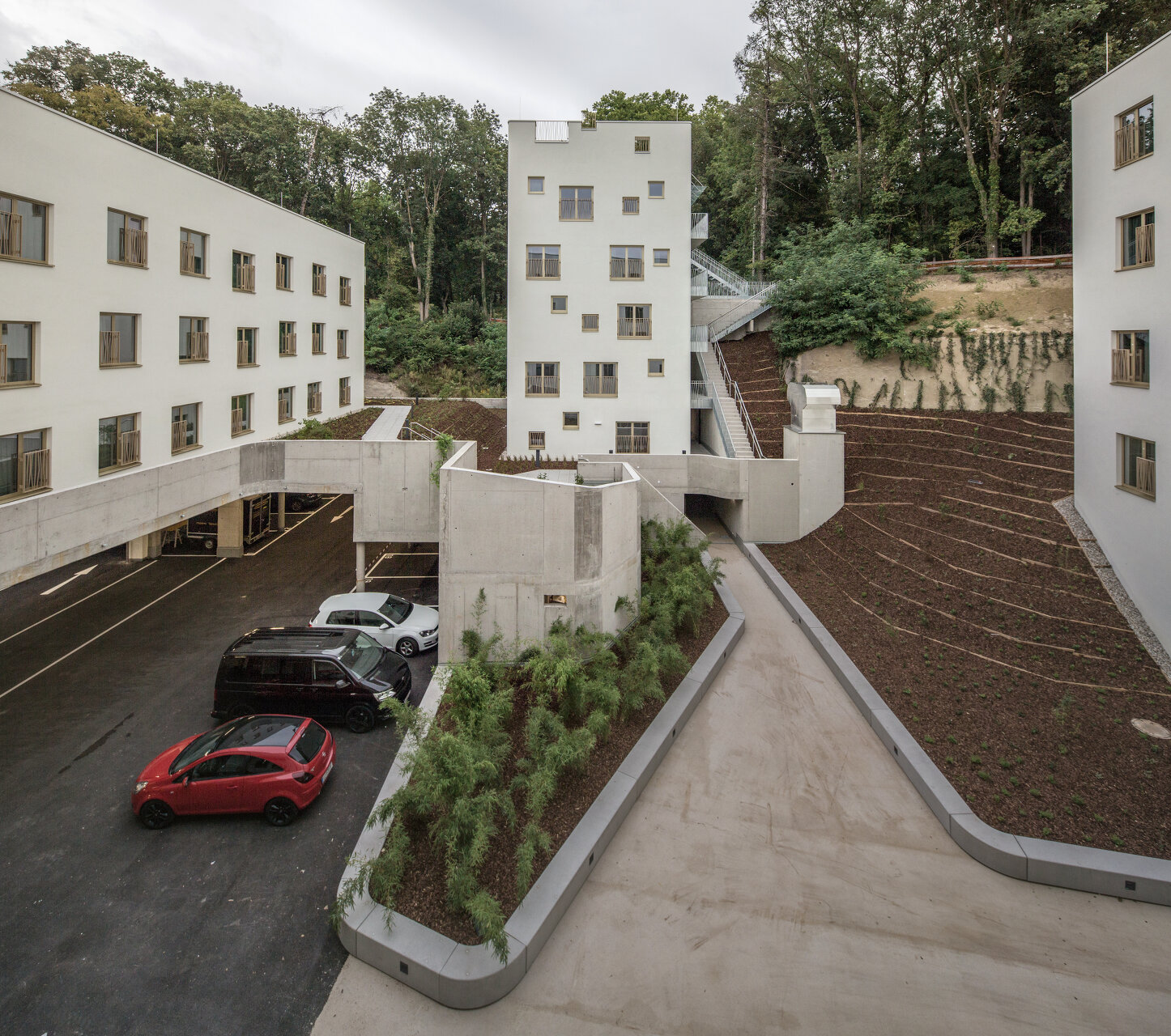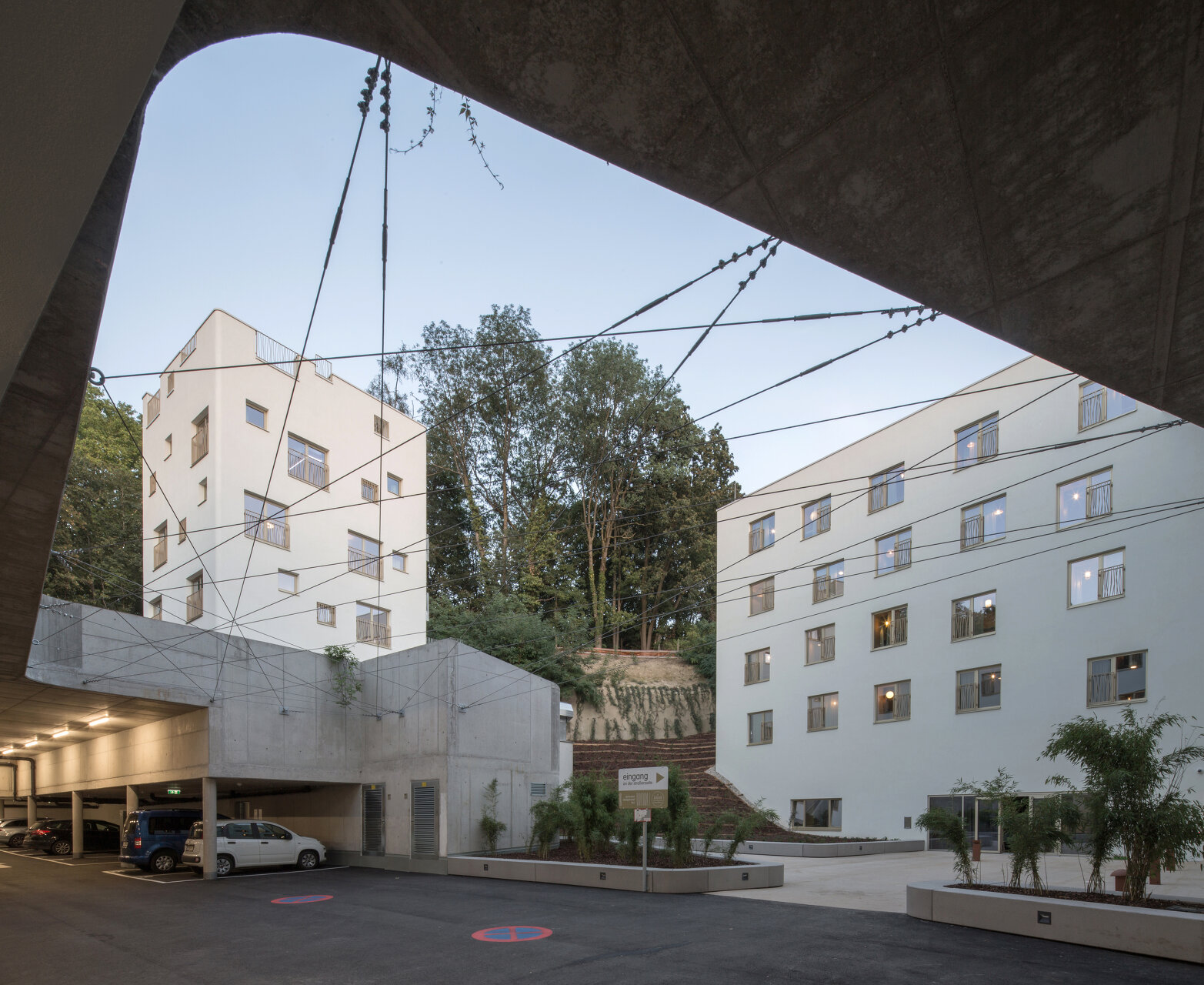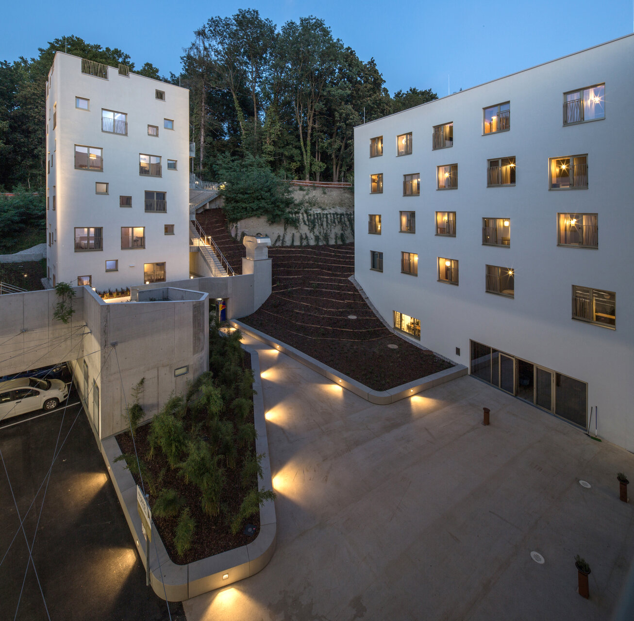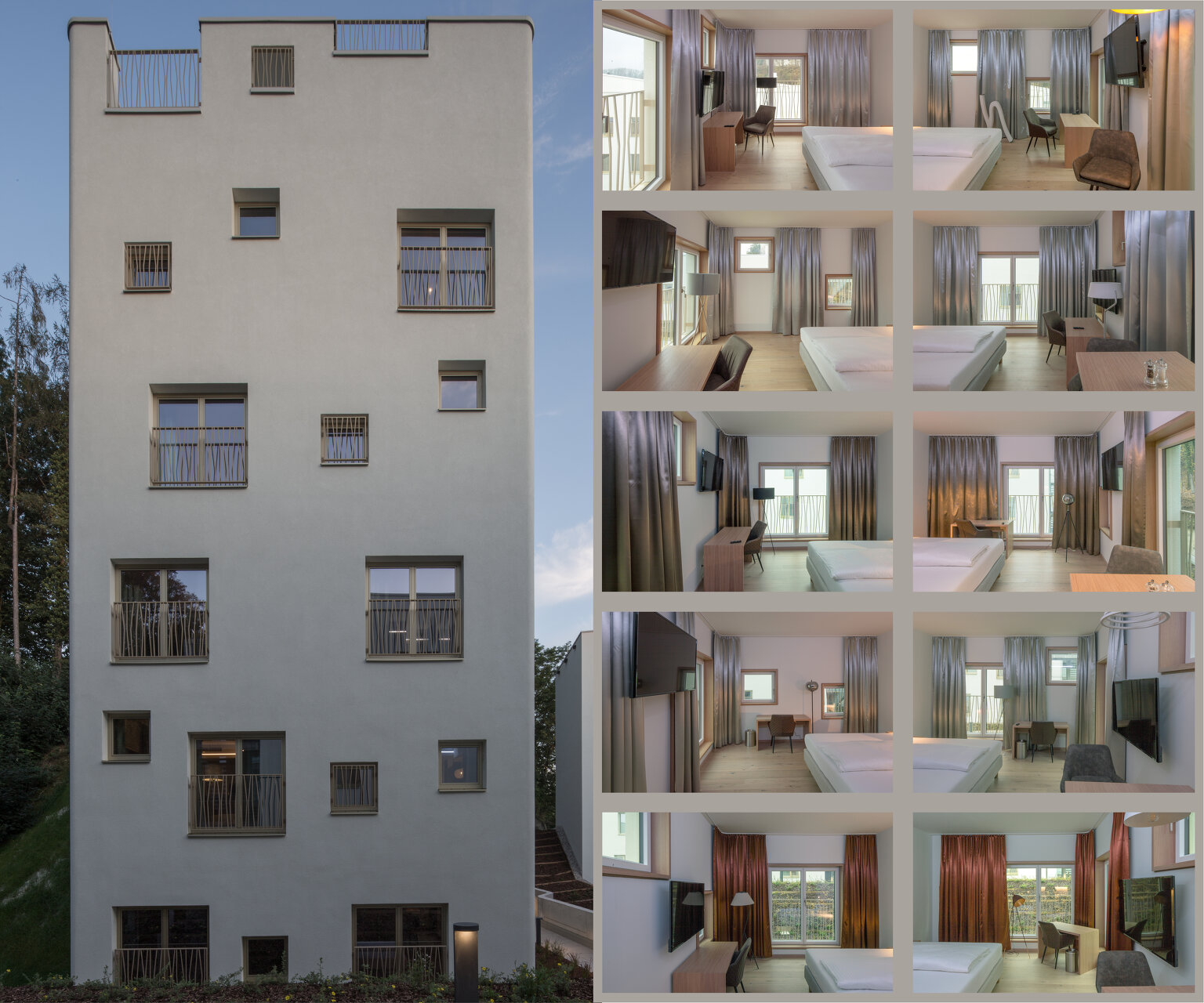 Zusätzlich zum Hotel wurde ein Wohnbau gehobener Kategorie realisiert, dessen Eingänge über den bewaldeten Hang auf der Rückseite bzw. über einen Lift direkt aus der Tiefgarage erreichbar sind. Der schlanke Turm entwickelt sich aus dem Berg und überblickt das Hotel um ein Geschoß. Hochformatige Fensteröffnungen und Putzfassade charakterisieren diesen Baukörper. Die Verwandtschaft zum Hotel wird gezeigt und variiert. (Text: Architekt:innen, bearbeitet)