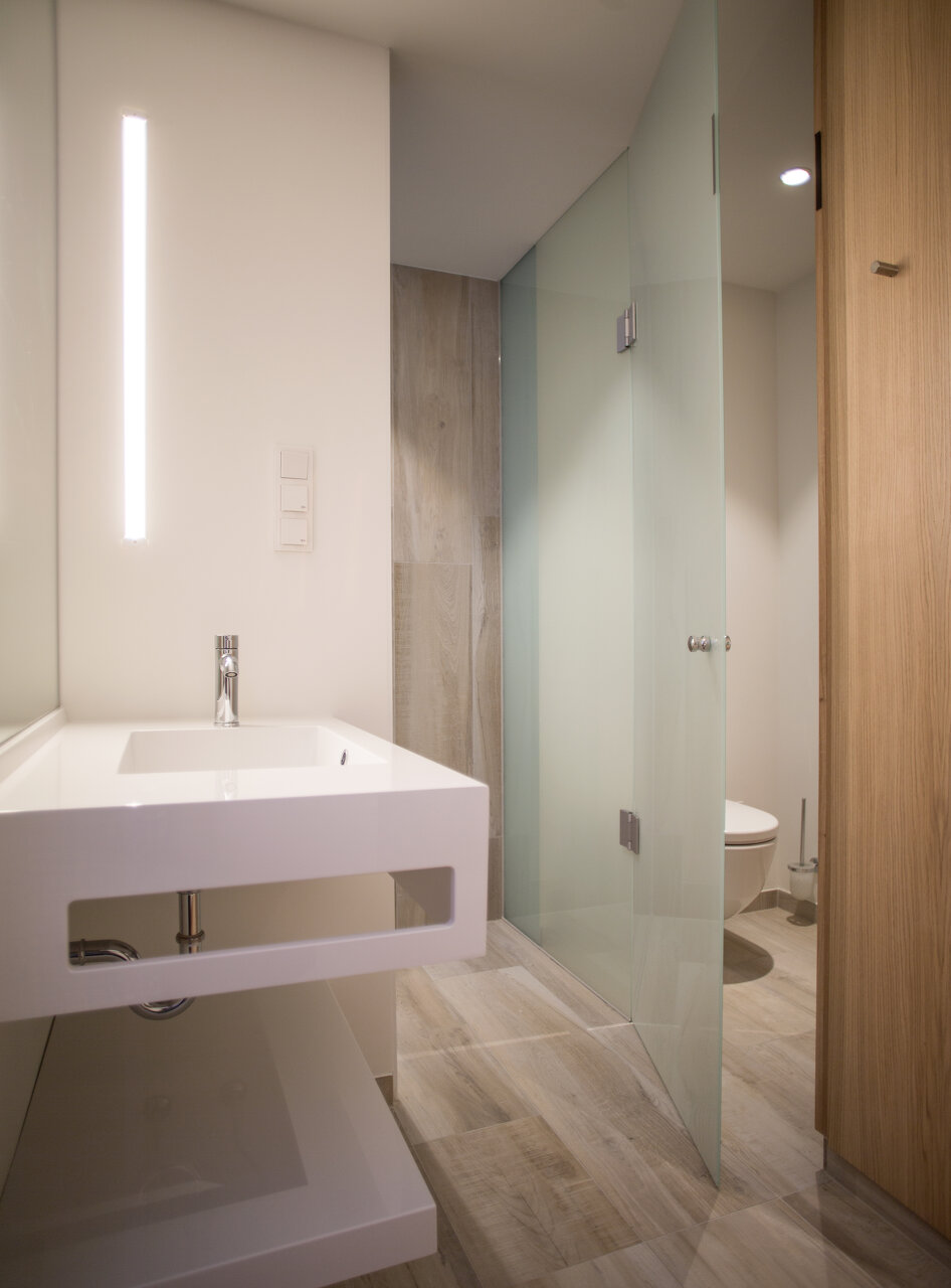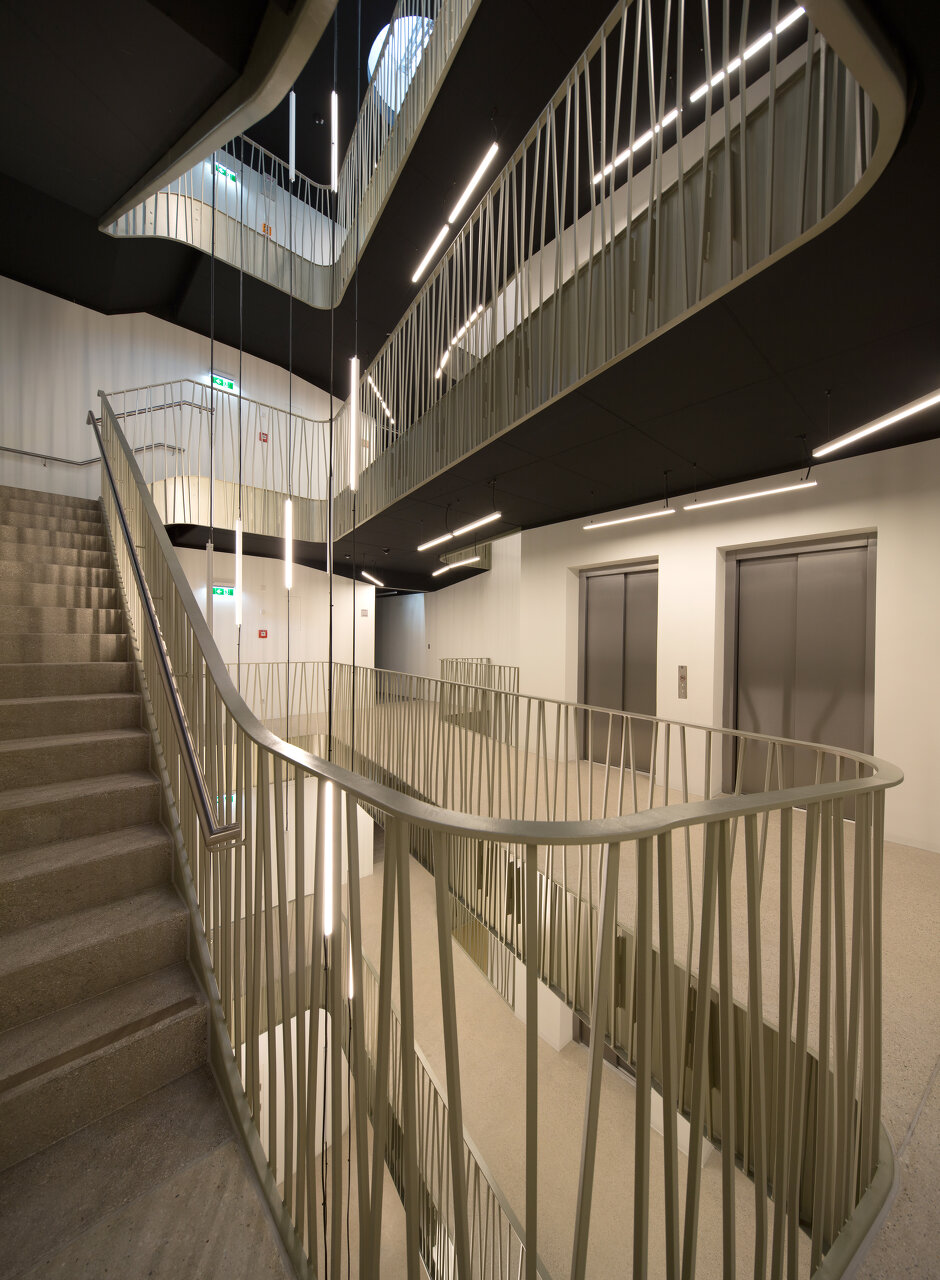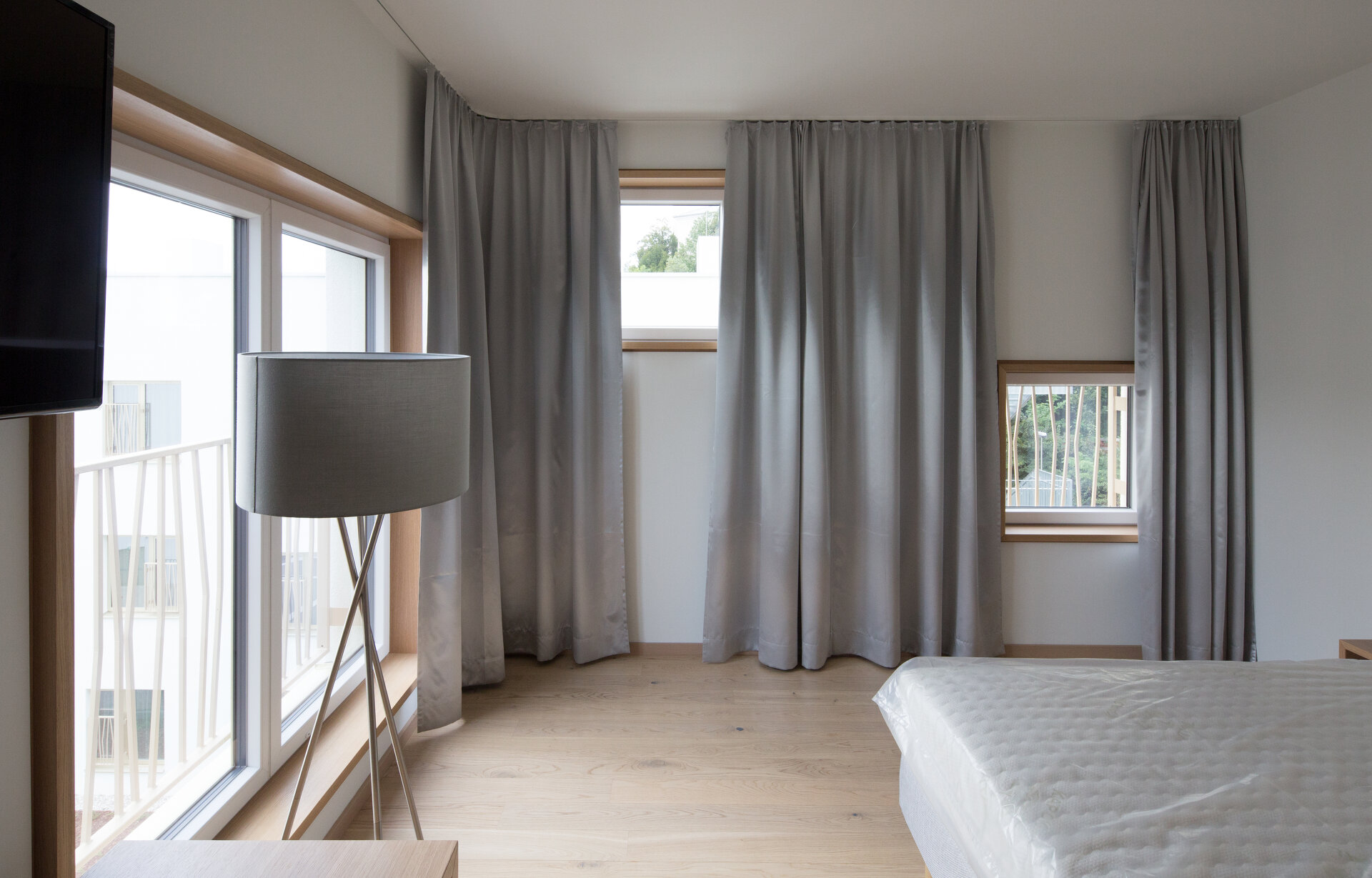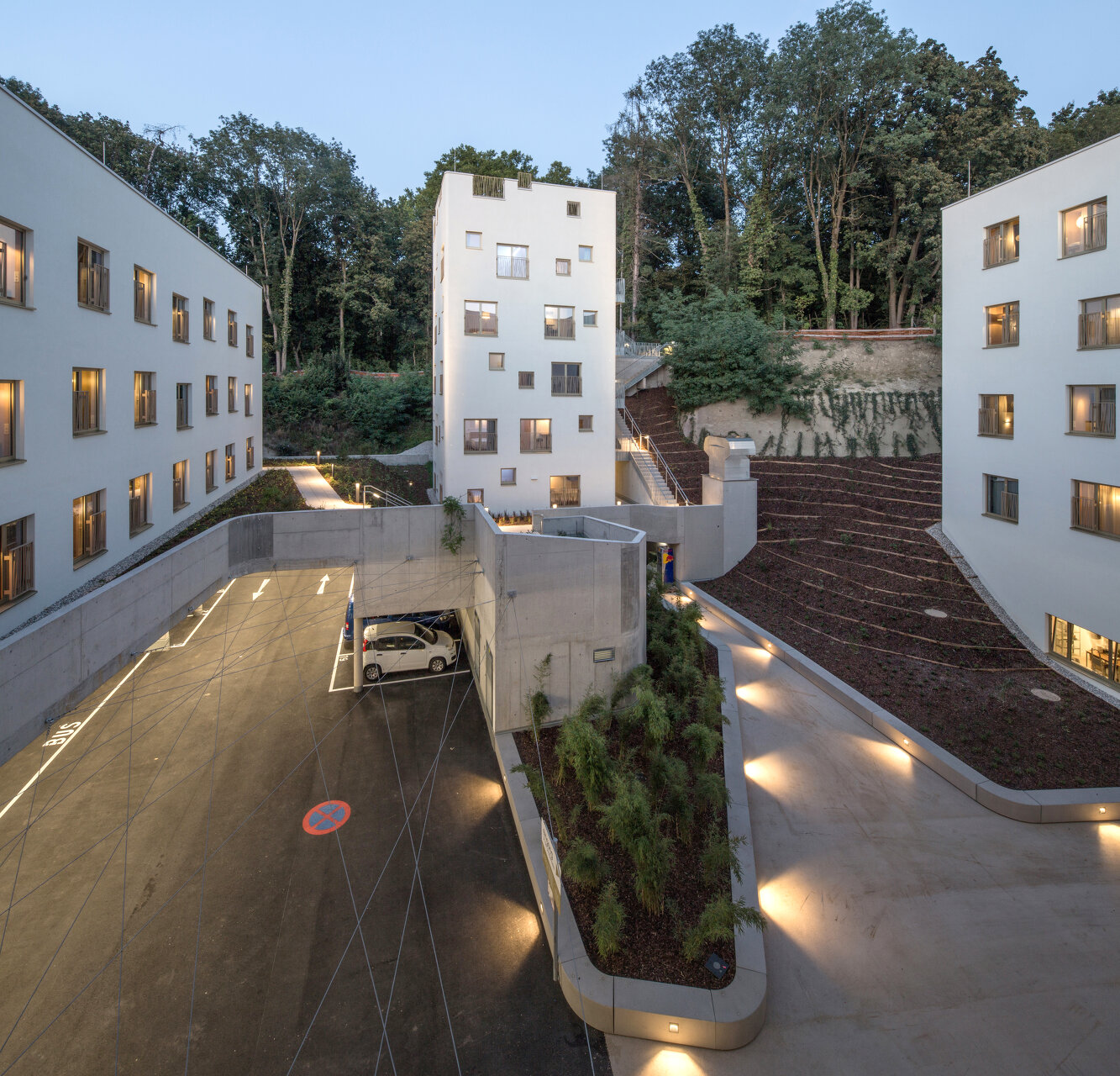Zusätzlich zum Hotel wurde ein Wohnbau gehobener Kategorie realisiert, dessen Eingänge über den bewaldeten Hang auf der Rückseite bzw. über einen Lift direkt aus der Tiefgarage erreichbar sind. Der schlanke Turm entwickelt sich aus dem Berg und überblickt das Hotel um ein Geschoß. Hochformatige Fensteröffnungen und Putzfassade charakterisieren diesen Baukörper. Die Verwandtschaft zum Hotel wird gezeigt und variiert. (Text: Architekt:innen, bearbeitet)