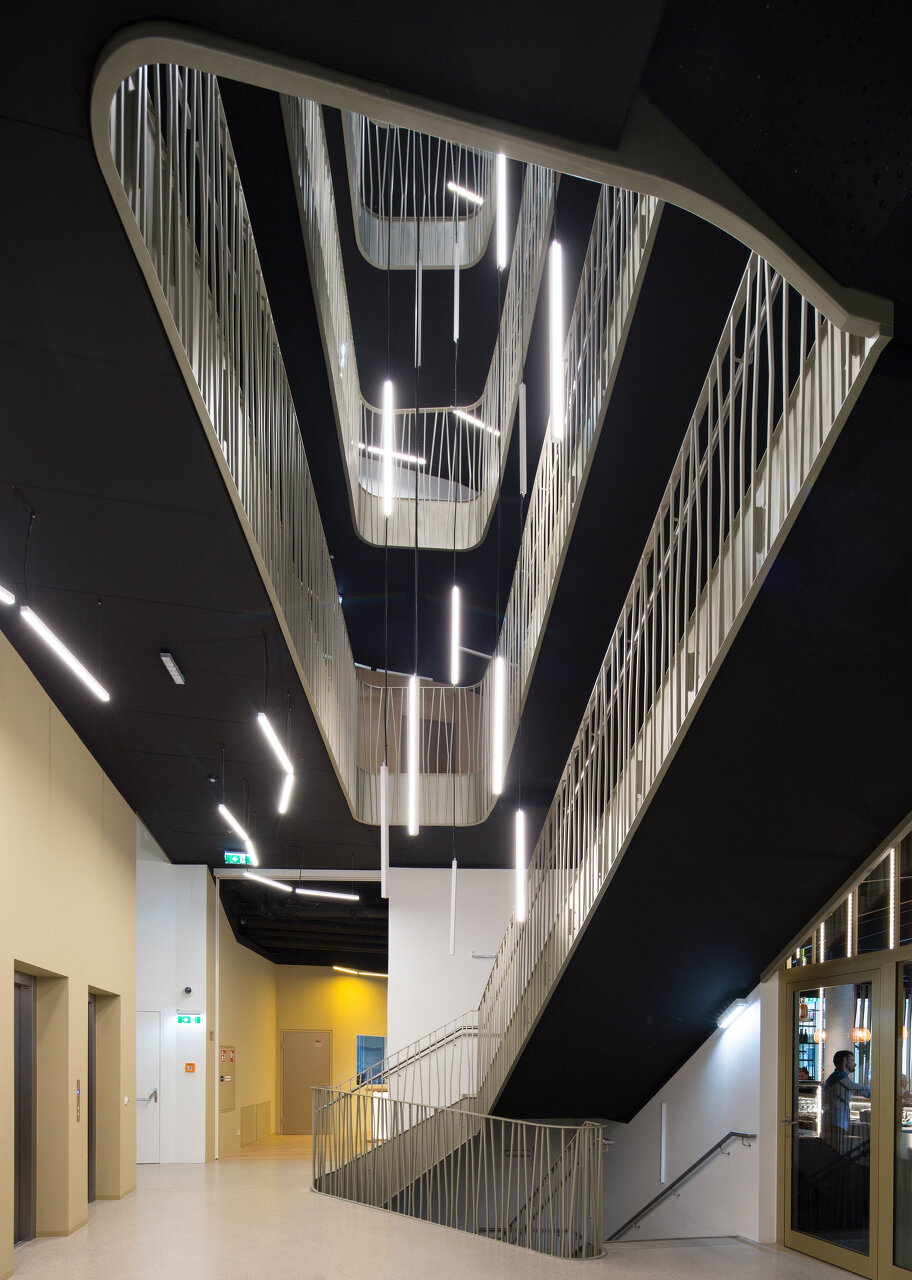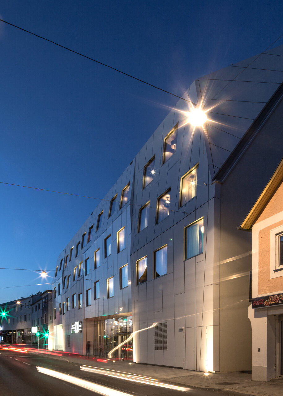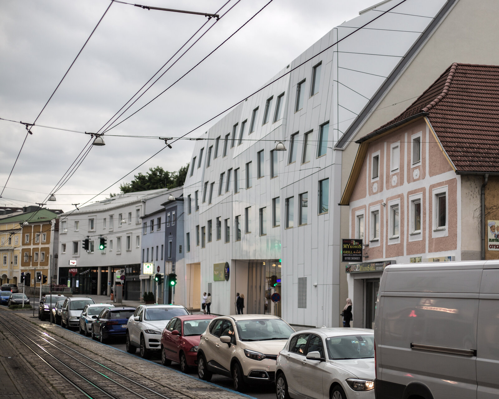Um das große Volumen verträglich in den Stadtgrundriss Ebelsbergs einzupassen, wurde der Baukörper zur Straße „abgeschliffen“. Mit Knicken in der Fassade wurden Bezüge zur Nachbarbebauung hergestellt. Die seitlichen Brandwände wurden zurückgeknickt und als Frontfassade ausgebildet. Das relativ flache oberste Geschoß bleibt im Straßenraum weitgehend unsichtbar. Vertikale Teilungen gliedern den Baukörper in vier Unterbaukörper. Eine hinterlüftete Fassade aus Aluminium-Verbundplatten mit matter Oberfläche bestimmt das hochwertige Erscheinungsbild nach außen. Richtung Hof bilden ruhige, leicht variierte Fensteröffnungen zusammen mit einer Putzfassade einen dezenten Rahmen.