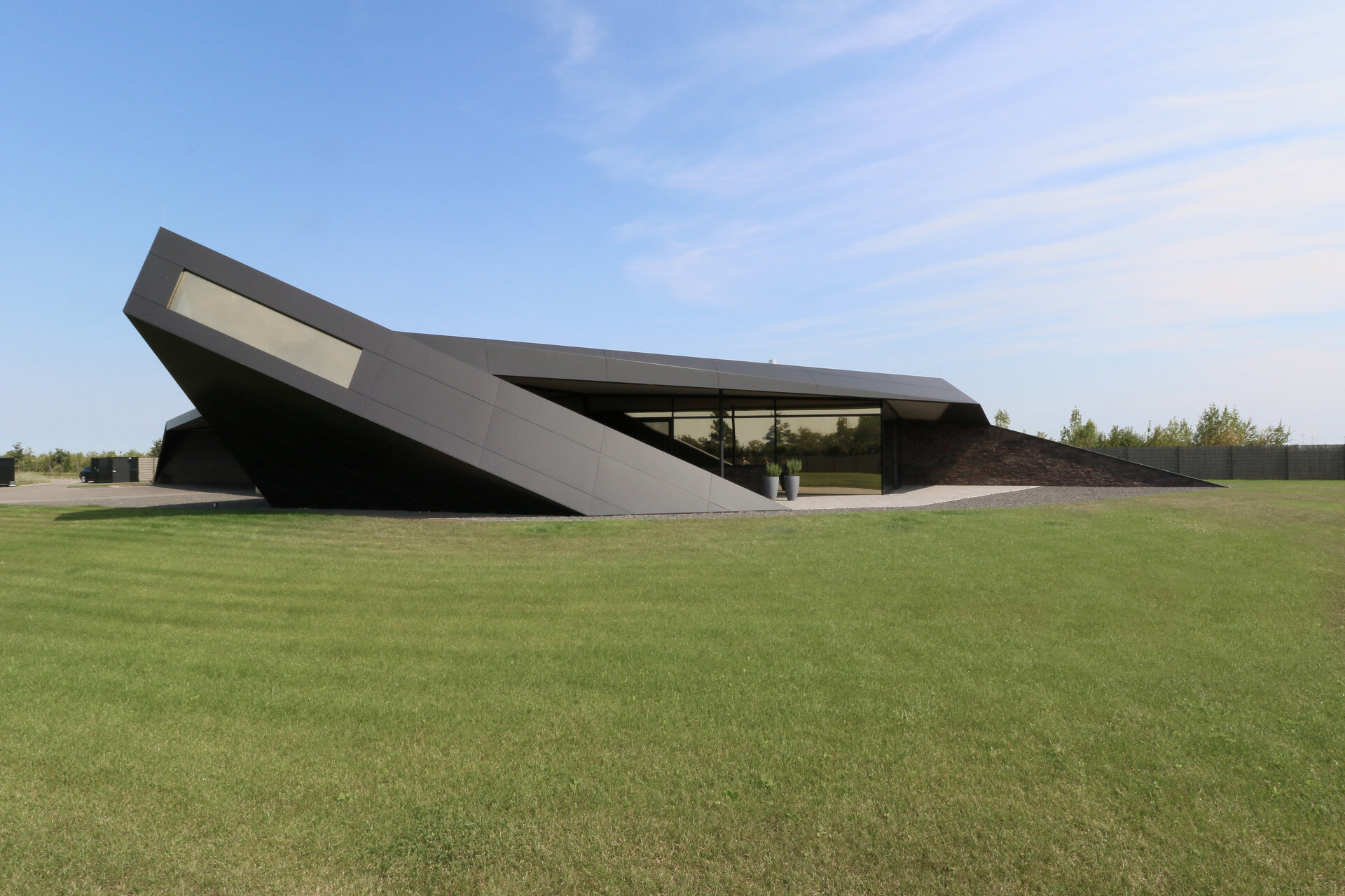 Diese Aufgabe kam bis vor wenigen Jahren den Starfighter-Flugzeugen zu. Diese setzten sich wagemutig den aus tausenden Staren bestehenden dunklen Wolken am Himmel aus. Gut gelandet, im dunklen Fassadenkleid, wie der Vogel Star selbst, ist seit Ende 2017 das ebenerdige, wehrhaft anmutende Wohngebäude auf einer mit Rasen bepflanzten Ebene. Mitten in der Naturlandschaft steht es auf einem Grundstück außerhalb des Ortskerns annähernd in Alleinlage und schützt die Bewohner vor der fast schon unheimlichen Weite. Der Wunsch nach einer schützenden Behausung war die Initialzündung dafür, eine wehrhafte, außergewöhnliche Architektur, eine Art Tarnkappenbomber, für eine spezielle Bauherrenschaft in dieser ausdrucksstarken und vom ganzjährigen Naturschauspiel geprägten pannonischen Ebene zu schaffen. Aufgrund regionaler Wetterverhältnisse - kaum ein Tag vergeht ohne Wind - sitzen die privaten Freiflächen direkt an der Gebäudehülle angedockt und werden durch auslaufende Fassaden- und Dachteile schützend eingefasst. Eine gefaltete Alublechstruktur ist dem Schlafbereich vorgelagert und bildet eine begehbare intime Hofzone vor dem eigentlichen Ruheraum mit angeschlossenem Bad- und Fitnessbereich. Die Aussicht von Innen auf das Naturschauspiel ist durch die Lochstruktur gegeben.