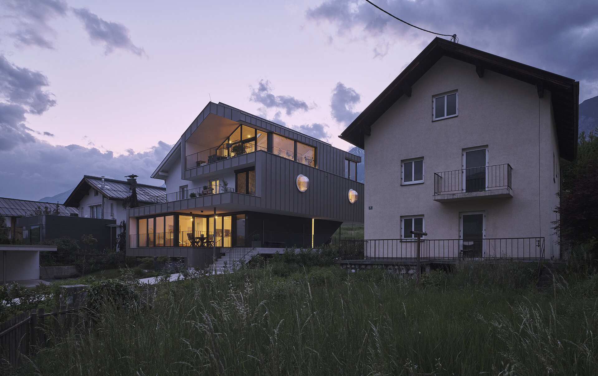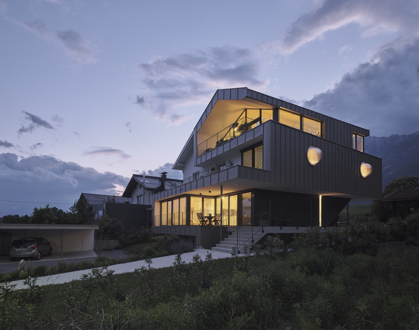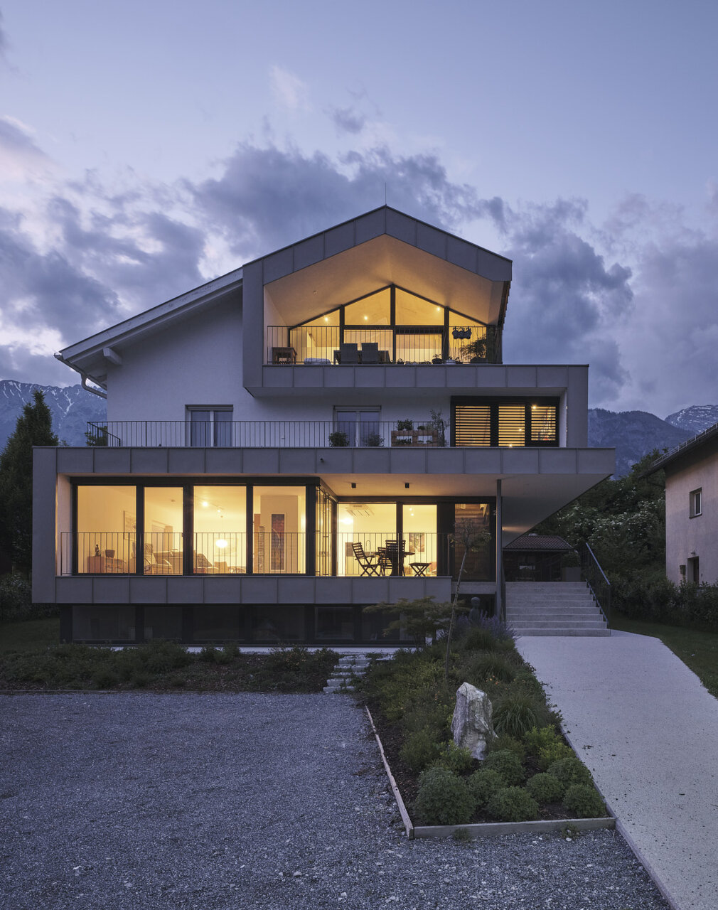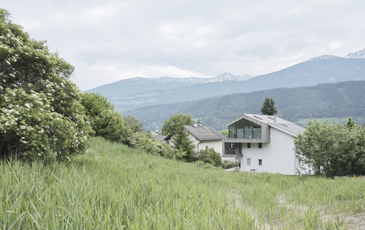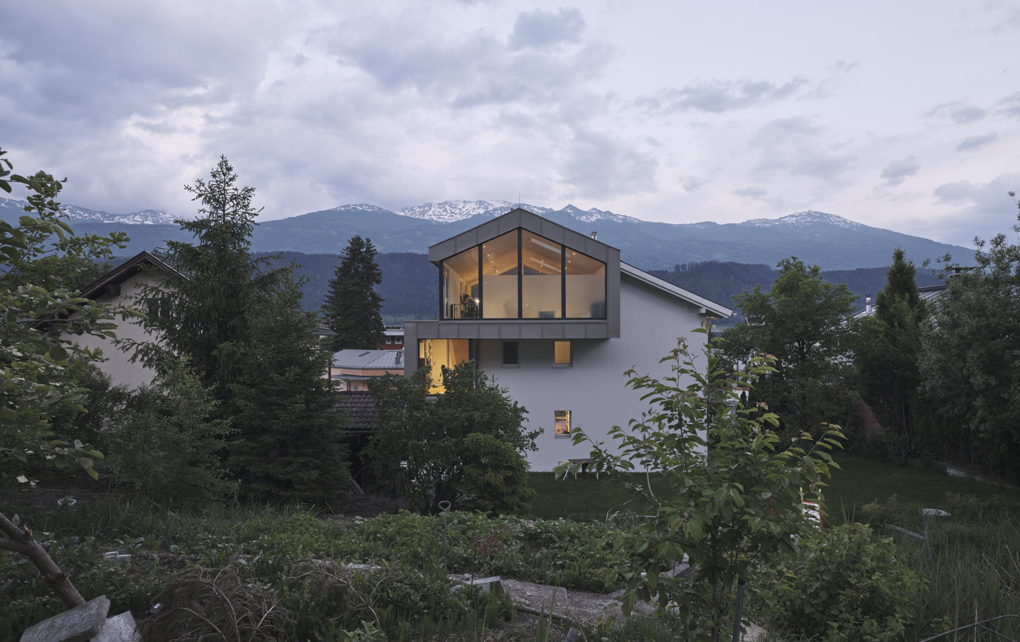 Die Wohnung im Erdgeschoß wurde Richtung Süden in Form eines großzügig verglasten Zubaus erweitert, der – wie auch die Zubauten in den Obergeschoßen – Sichtbezüge zur umgebenden Landschaft herstellt. Diese gezielt gesetzten Eingriffe in den Bestand sind über ein kontinuierliches Band und die einheitliche Materialität der Metall-Außenhülle zu einer gestalterischen Einheit zusammengefasst, die die Grundform des Satteldachs als formale Metapher beibehält und neu interpretiert. Damit konnte ein spannender Dialog zwischen Alt und Neu entstehen, der sich in den Innenräumen mit ihren unterschiedlichen Raumqualitäten und Atmosphären fortsetzt. (Text: Claudia Wedekind, nach einem Text der Architekten)