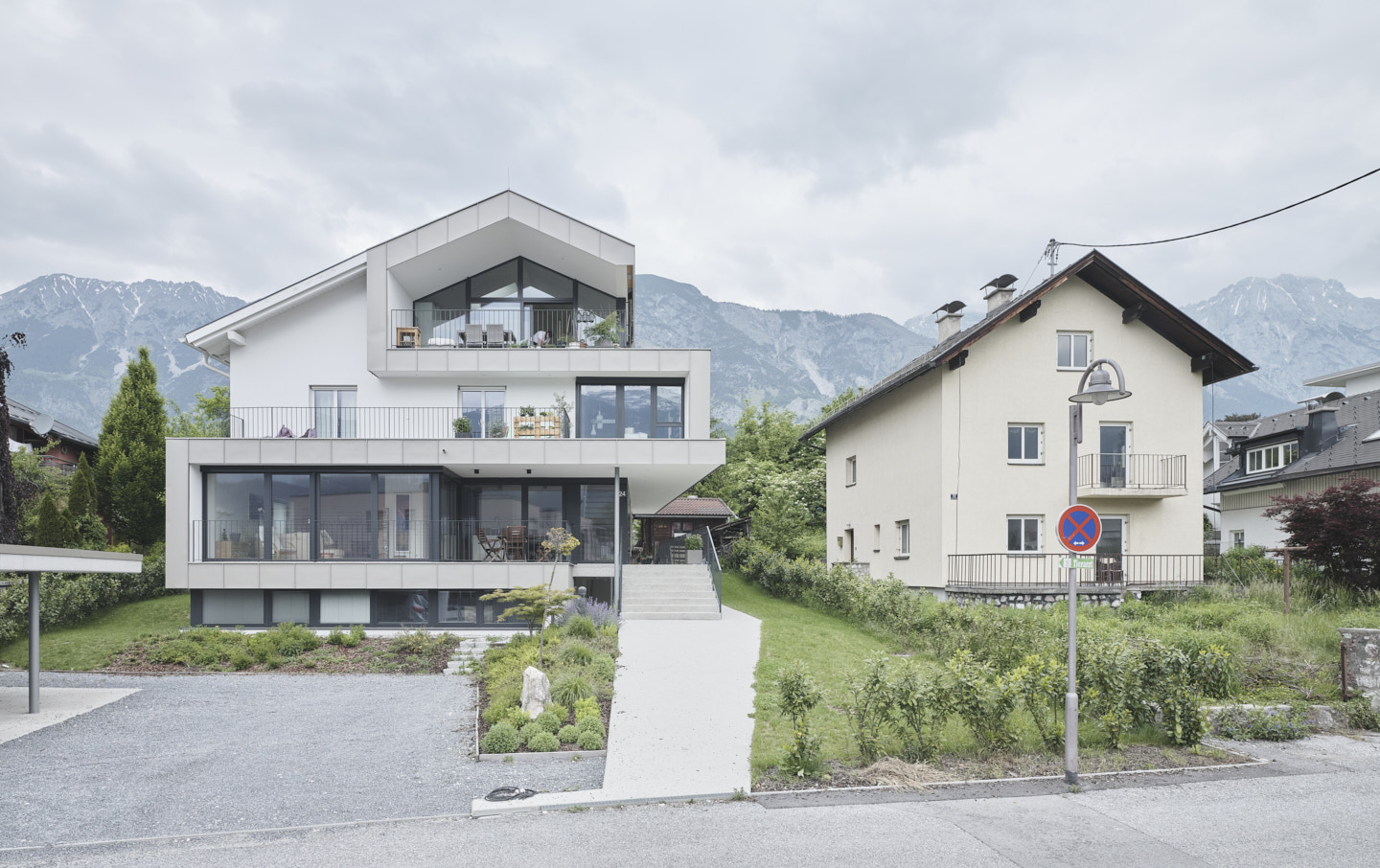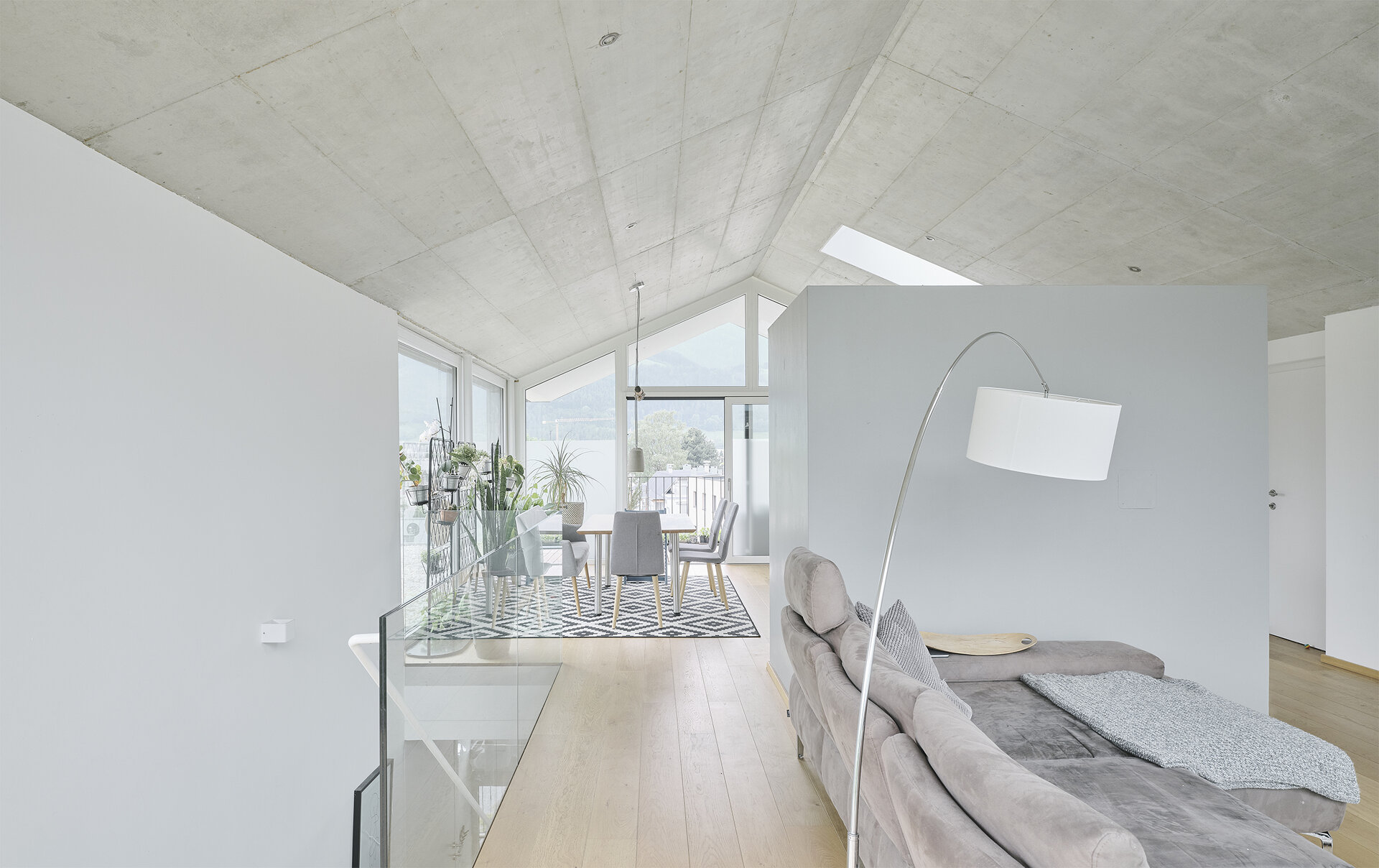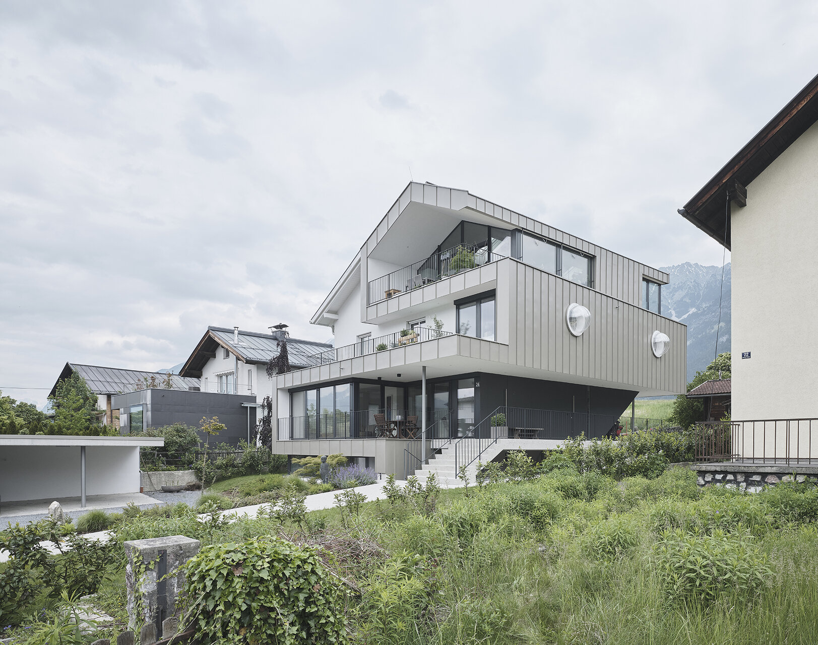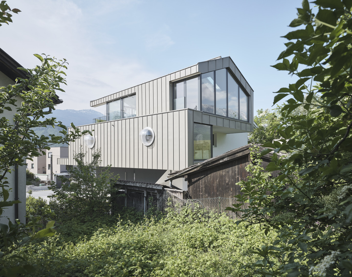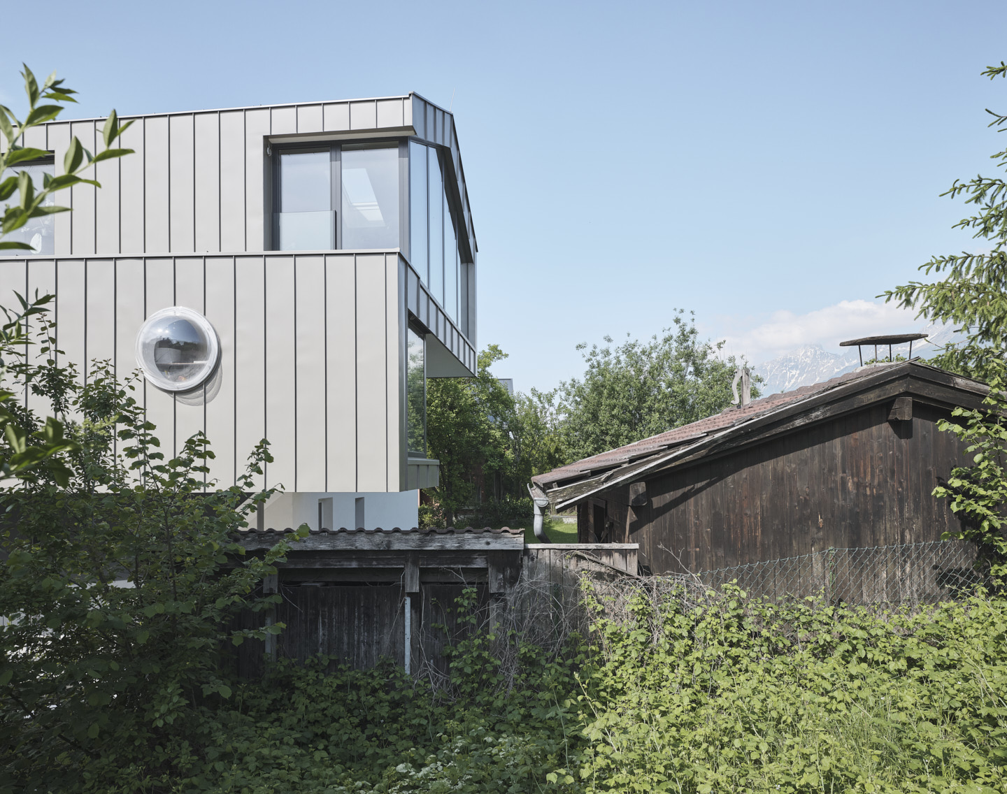 Die Wohnung im Erdgeschoß wurde Richtung Süden in Form eines großzügig verglasten Zubaus erweitert, der – wie auch die Zubauten in den Obergeschoßen – Sichtbezüge zur umgebenden Landschaft herstellt. Diese gezielt gesetzten Eingriffe in den Bestand sind über ein kontinuierliches Band und die einheitliche Materialität der Metall-Außenhülle zu einer gestalterischen Einheit zusammengefasst, die die Grundform des Satteldachs als formale Metapher beibehält und neu interpretiert. Damit konnte ein spannender Dialog zwischen Alt und Neu entstehen, der sich in den Innenräumen mit ihren unterschiedlichen Raumqualitäten und Atmosphären fortsetzt. (Text: Claudia Wedekind, nach einem Text der Architekten)