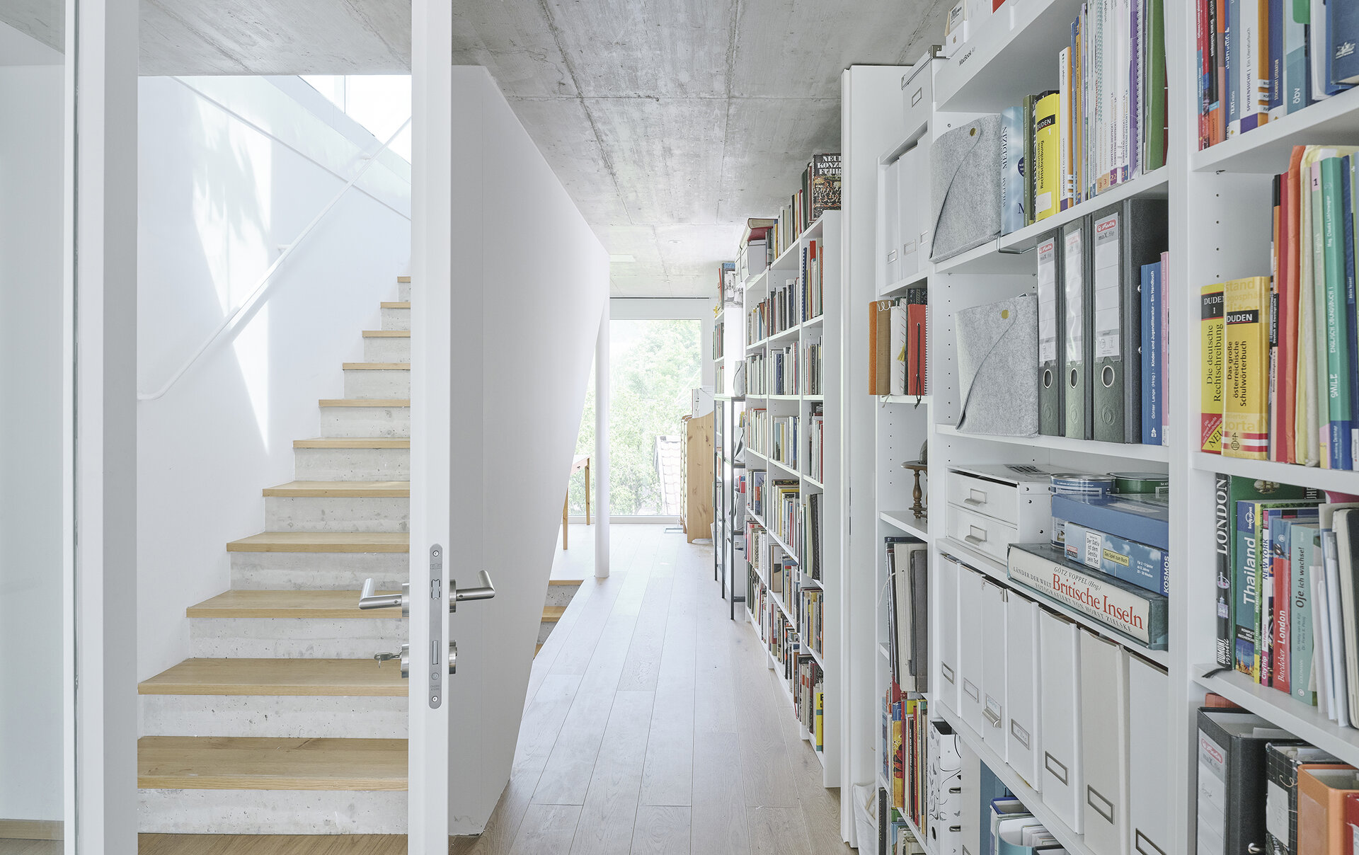 Ein wesentlicher Eingriff bestand darin, die Erschließung der beiden Wohnungen – jene der Mutter im Erdgeschoß und die der Tochter in den Obergeschoßen – über eine einläufige Treppe komplett neu zu organisieren. Im Erdgeschoß konnte durch die Reduktion der Treppenhausfläche eine großzügige Veranda geschaffen werden, die von dem im Obergeschoß ergänzten, auskragenden Raum überdacht wird. Hinter den Bullaugenfenstern liegt das Kernstück der Umbaumaßnahmen, eine gemeinsame Bibliothek, die einerseits als Kommunikationsraum für Mutter und Tochter dient, andererseits an den Stirnseiten jeweils einen Arbeitsbereich für die beiden Lehrerinnen beinhaltet, die bei Bedarf über die Wohnungstür der Tochter getrennt werden können.
