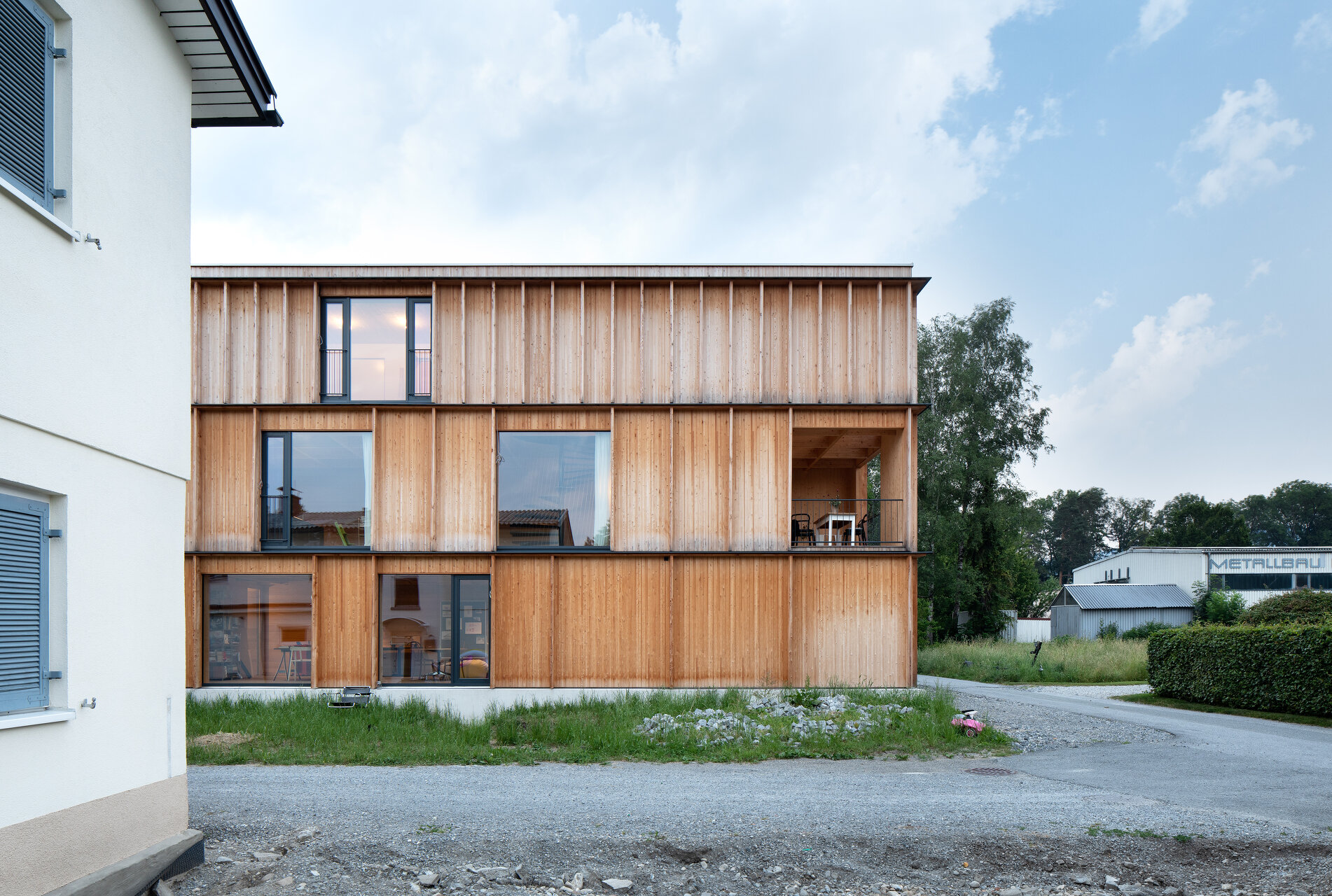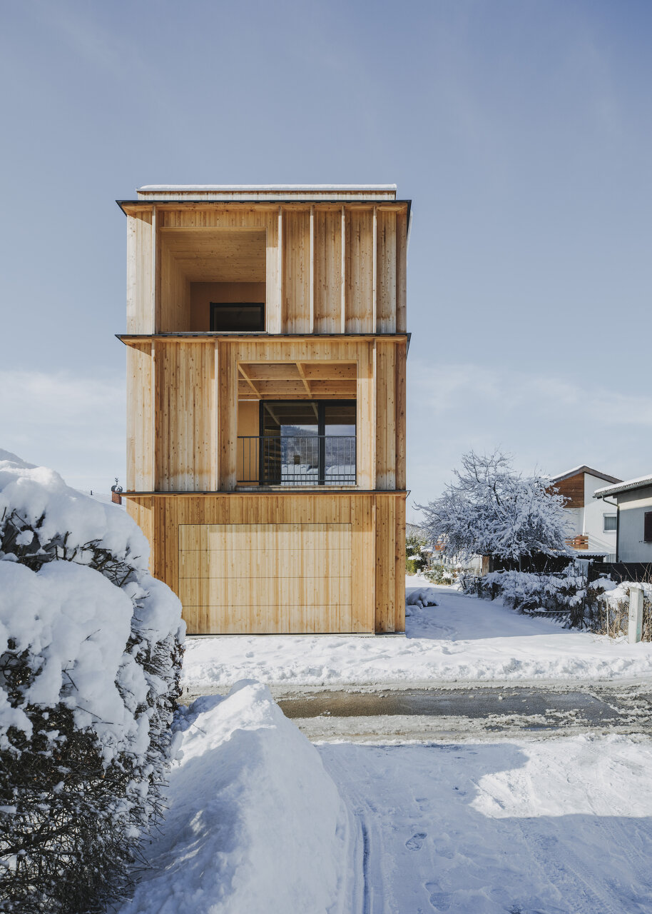 Die dreigeschoßige Struktur und funktionale Gliederung des Baukörpers ist an der Südfassade deutlich ablesbar – offener und transparenter unten, oben geschlossener und somit privater. Zwei in die Kubatur integrierte Loggien bieten gefasste, wettergeschützte Wohnlichkeit im Außenraum.