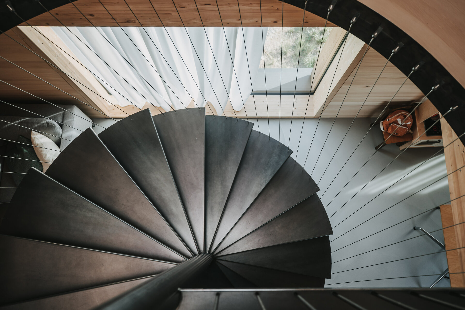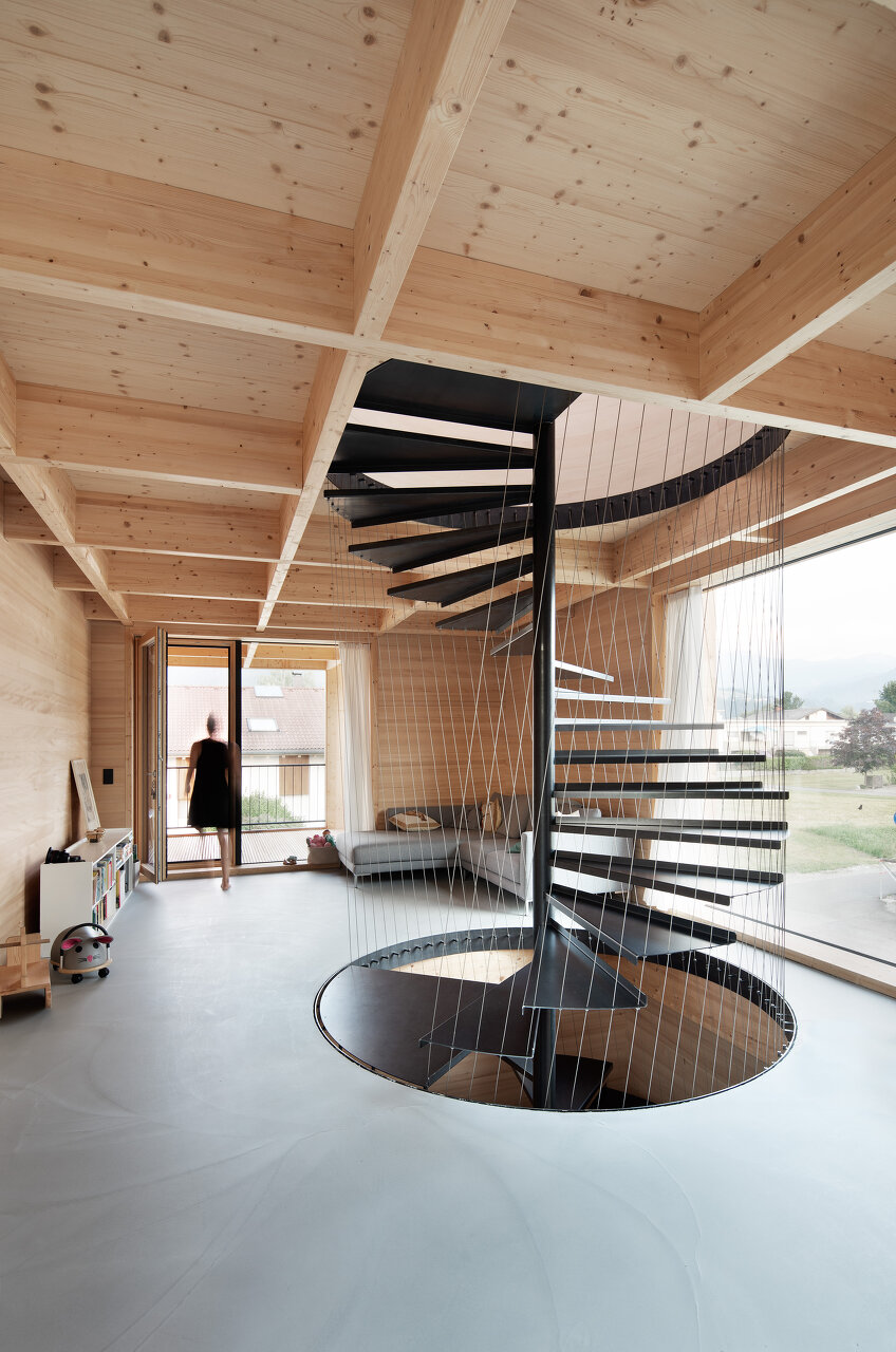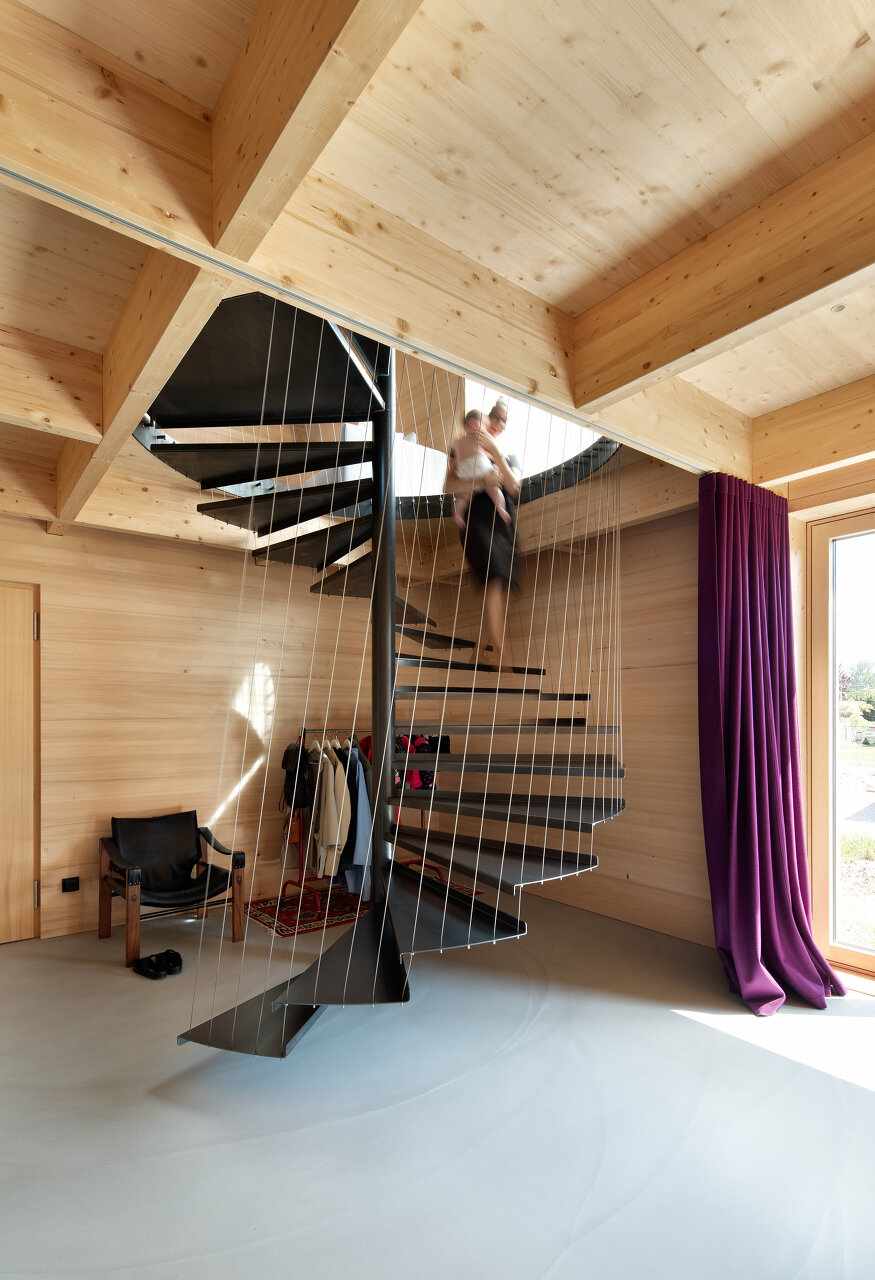 Wenige Materialien und klare Raumkompositionen bestimmen das Haus, das von einer raffiniert konzipierten Wendeltreppe durchstoßen und strukturiert wird.
