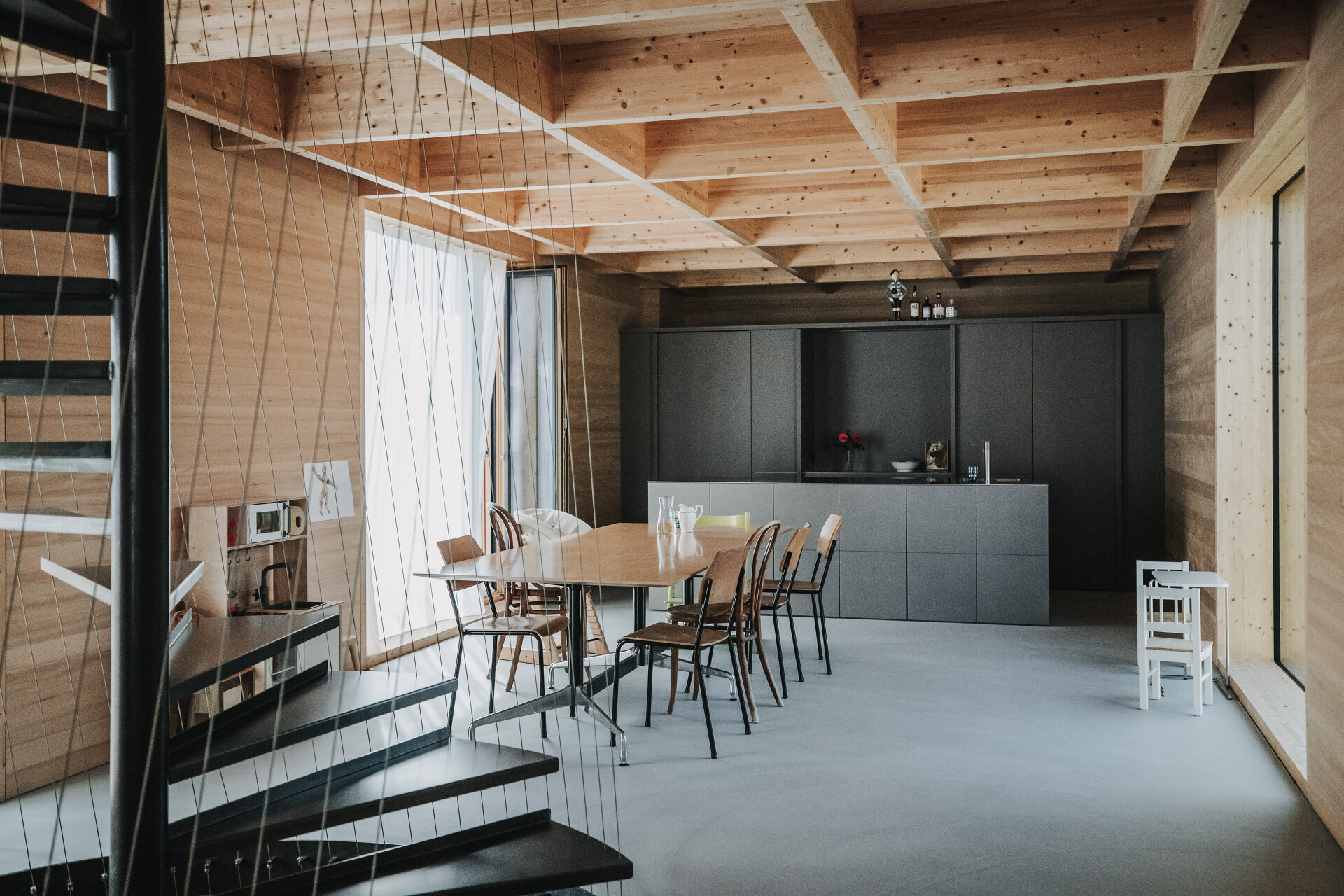 Das für die Konstruktion genutzte Holz zeigt sich offen, sowohl im Deckenbereich als auch als Wandbeplankung. Zementbestrichener Estrichboden schafft in angenehmer Konstrastierung mit den lebendigen Holzoberflächen eine ausgewogene Raumatmosphäre. (Text: Architekt, bearbeitet)