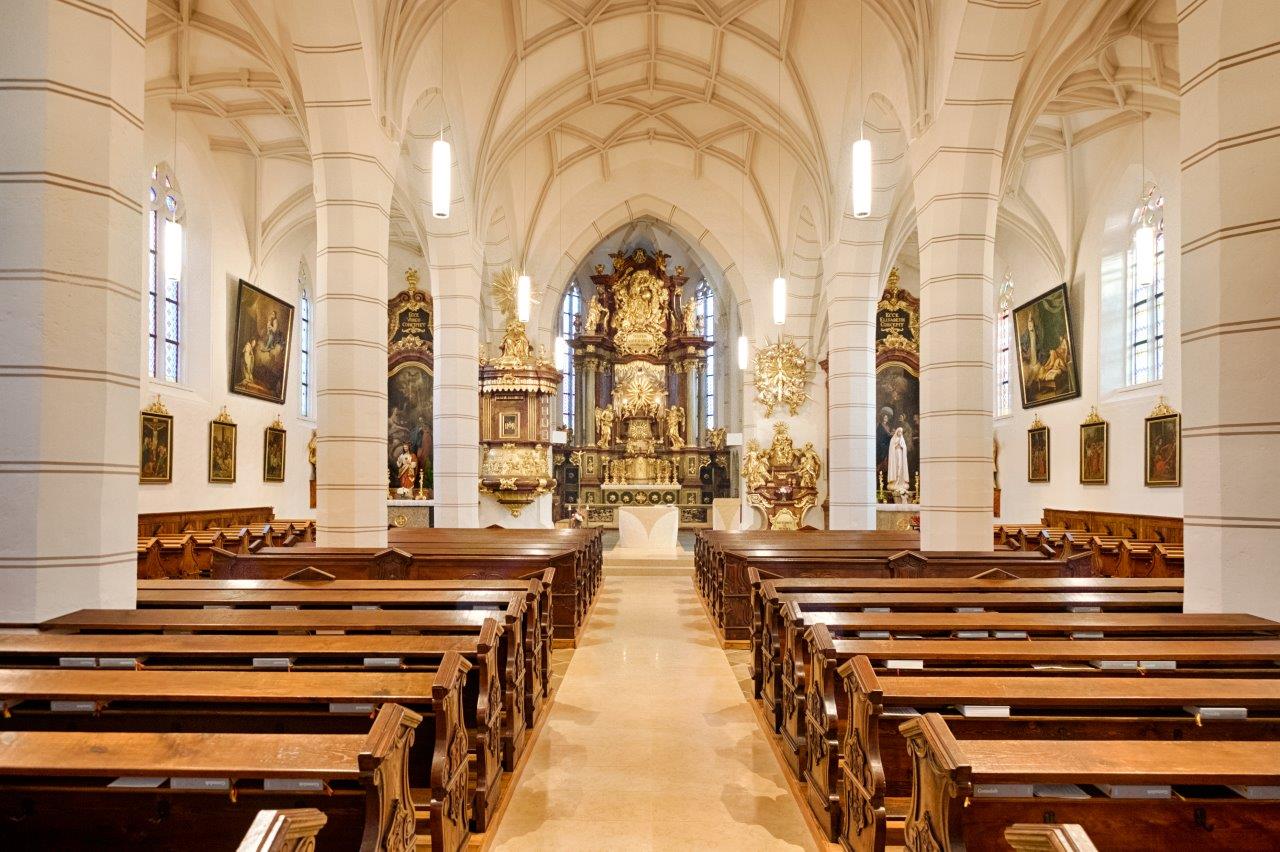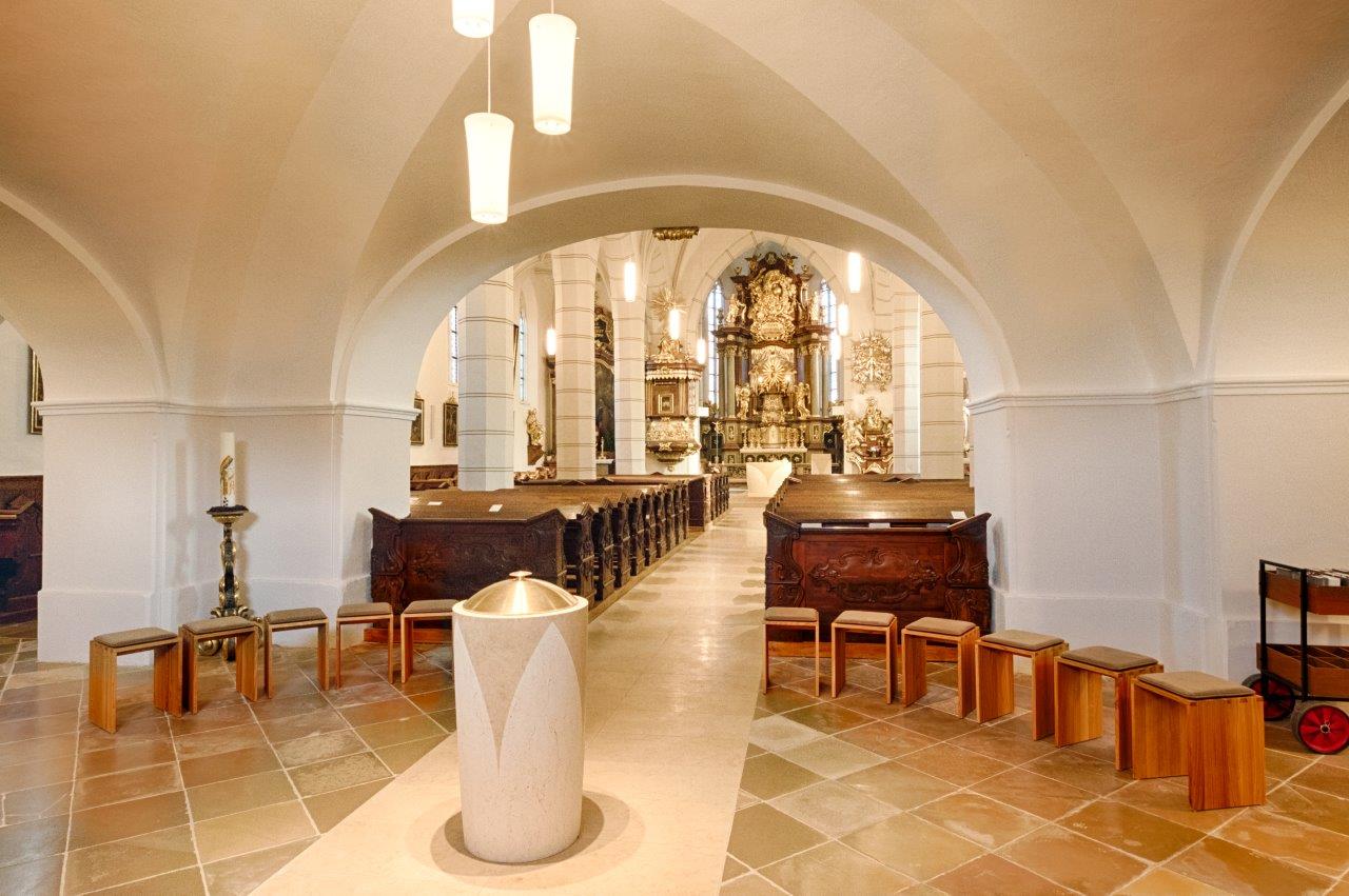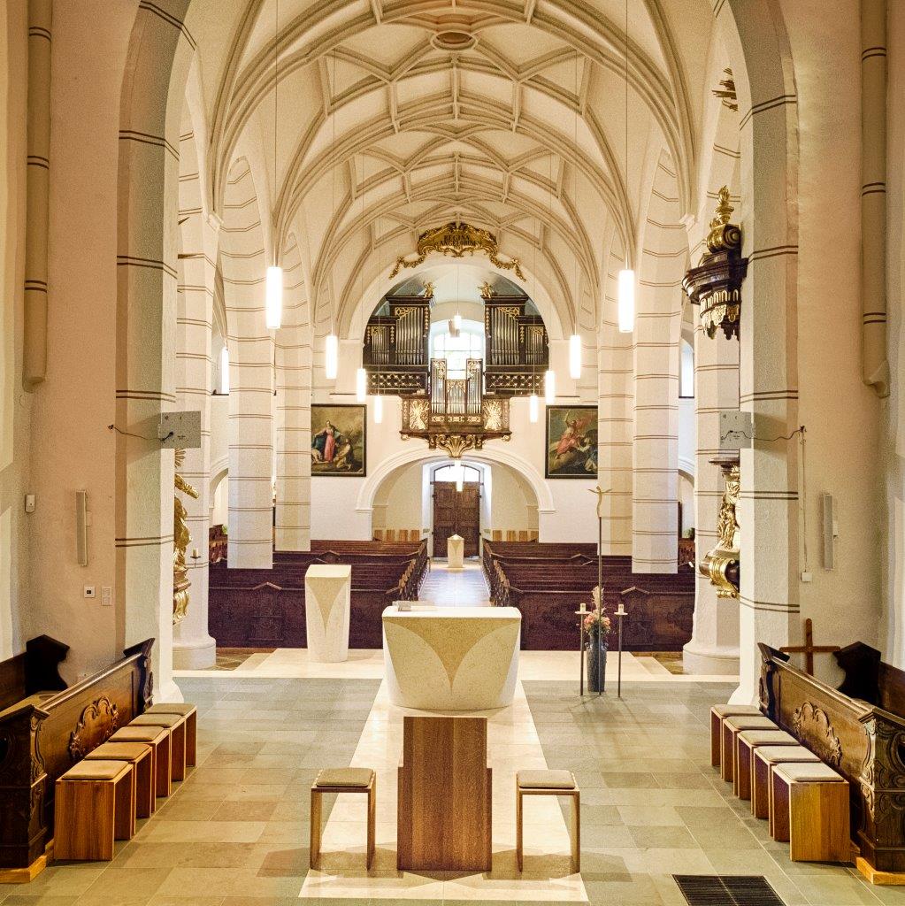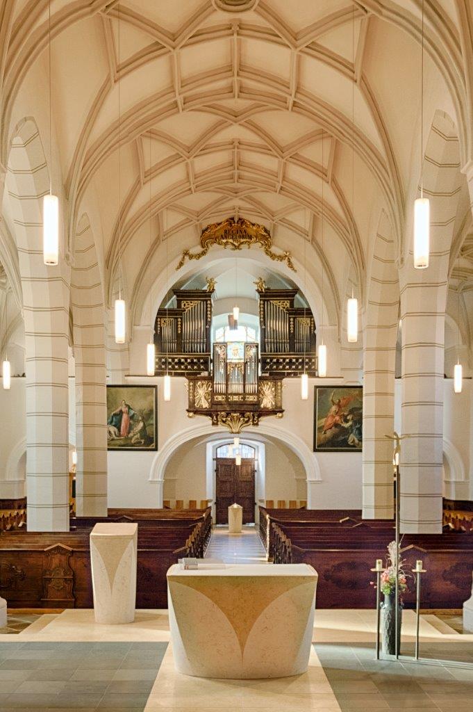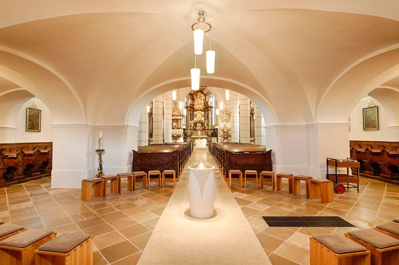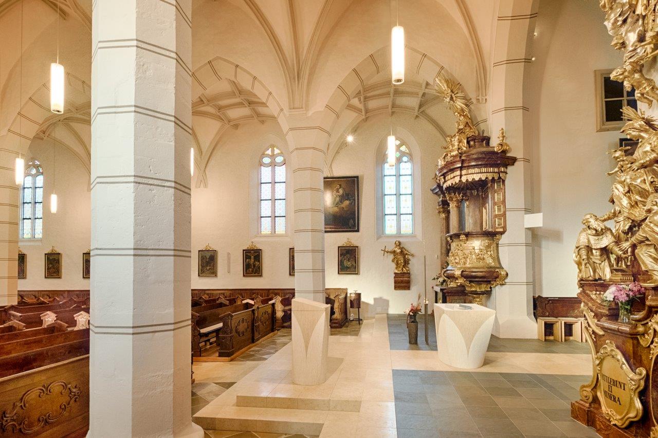 Die einzige Fläche ohne gestalterische Determination war der Boden der Kirche. Liturgische Gegenstände wie Altar, Ambo und Sessio sowie das Vortragskreuz, die Osterkerze und das Taufbecken hatten Potential für Erneuerung. Dem Boden des Kirchenraums wird also eine Figur eingeschrieben, die sämtliche liturgische Orte enthält und längs durch den Kirchenraum läuft. Die Gemeinde versammelt sich auf dieser neuen Figur zur Taufe, zur Kommunion und zum Abschied der Verstorbenen. Baukünstlerisch ergänzt die Bodenfigur mit den liturgischen Orten die räumliche Koexistenz von Gotik und Barock mit einer Intervention auf der Fläche. Der Kirchenraum komplettiert sich, eine neue Bedeutungsschicht wird eingelagert. Dem Konzept entsprechend werden Altar, Ambo, Taufbecken und die Bodenfigur mit demselben Stein ausgeführt. (Text: Architekt:innen, bearbeitet)