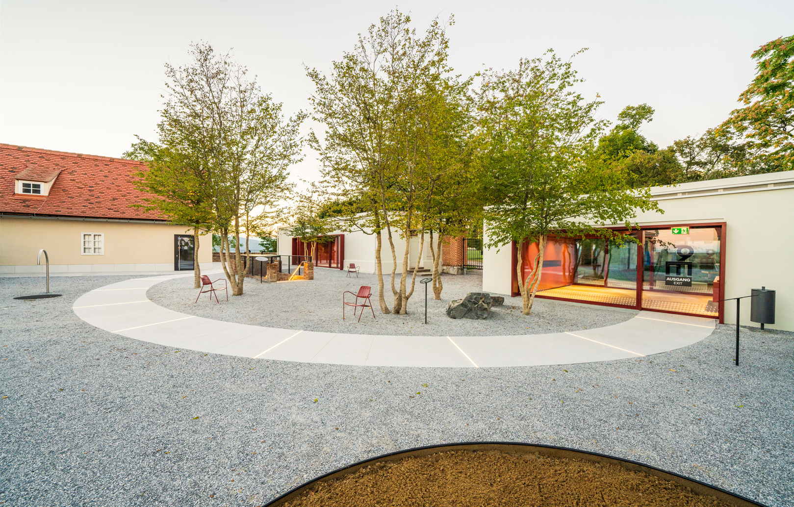 Verstärkt wird die Wirkung des Kreises durch den neu gepflanzten Baumhain. Er bildet ein natürliches Dach für die Besucherinnen und Besucher und begleitet sie durch die Jahreszeiten. Der Hain lädt zum Verweilen ein. Frei positionierte Sitzelemente erlauben verschiedene Arten der Kommunikation in seinem Schatten. Die ständige Veränderung des Blätterdachs wirkt als natürlicher Impulsgeber für das gesamte Areal. Der Baumhain ist Anziehungspunkt und schafft eine hohe Aufenthaltsqualität für alle Besucherinnen und Besucher des Museums.