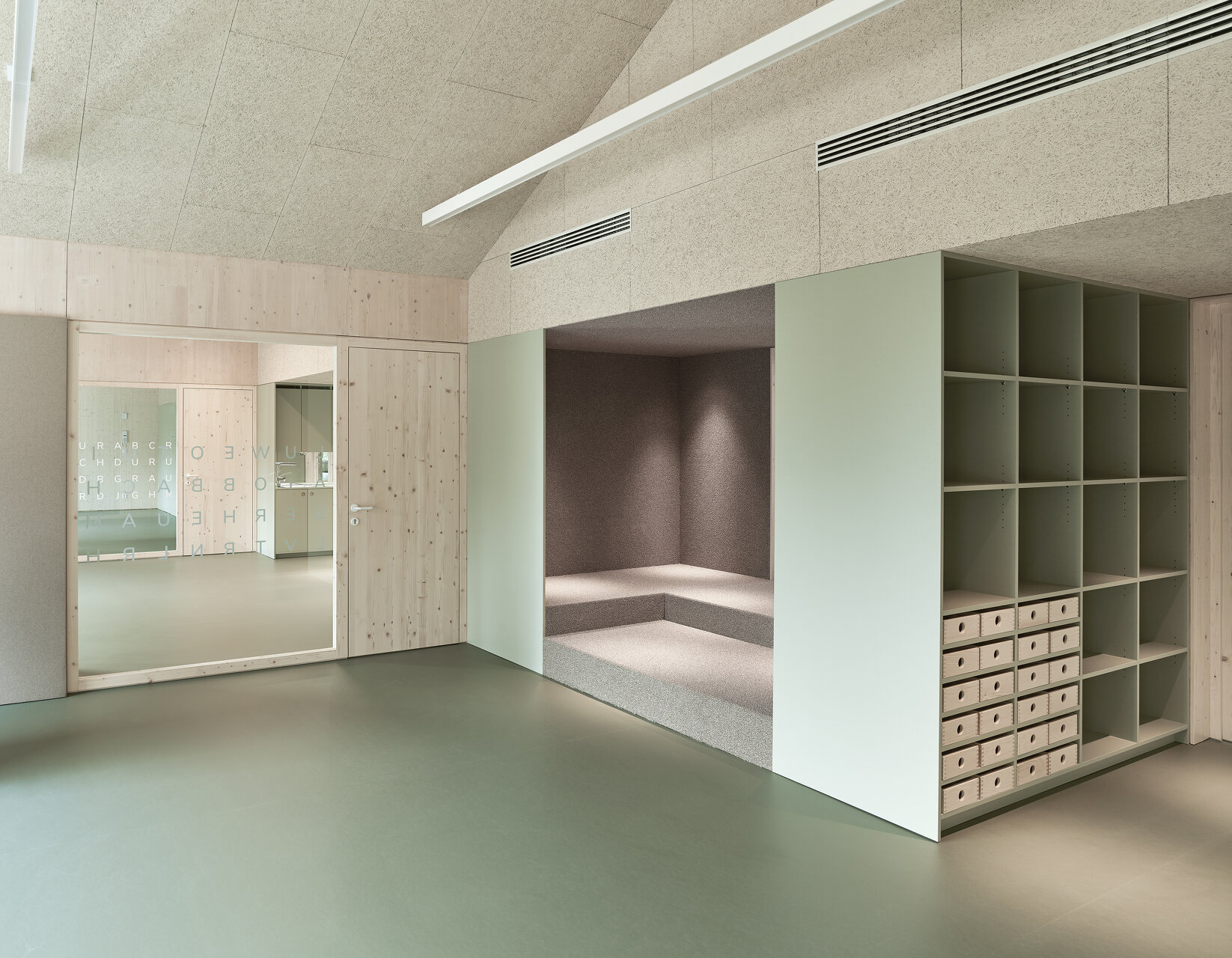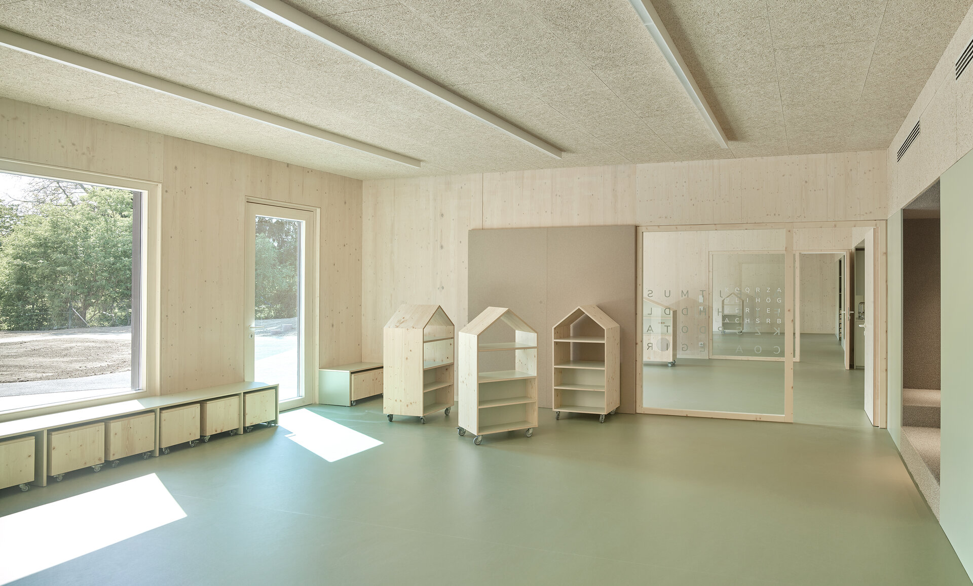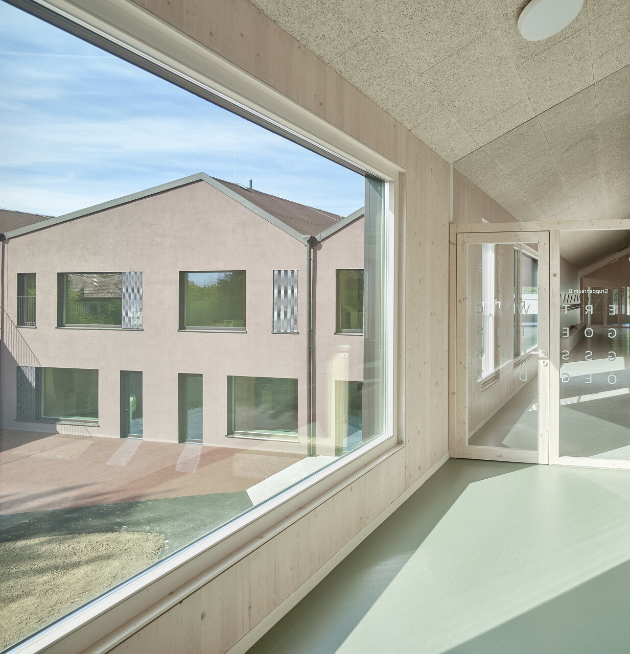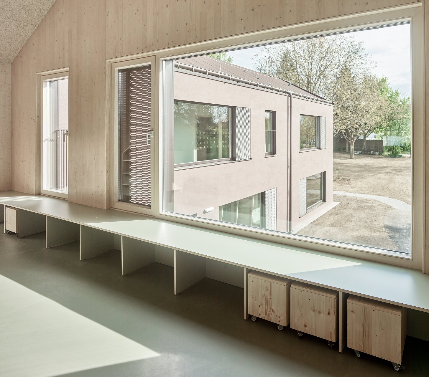 Nutznießer sind neben der Stadt in erster Linie die Kinder und das Betreuungspersonal; sie verbringen ja einen großen Teil ihres Lebens in diesen Räumen. Der bereits fertiggestellte Hort empfängt sie mit einem hellen, multifunktionalen, über die gesamte Gebäudehöhe offenen Eingangsbereich, der dank großzügiger Verglasungen mit dem Grünraum in Verbindung steht. Auch die Gruppenräume wenden sich mit großen Fensterelementen nach draußen. Sie werden allerdings durch schmale Zwischenbereiche von den Erschließungsflächen getrennt. In diesen etwas niedrigeren Zonen finden sich neben Stauräumen und Teeküchen Bereiche, die mit teppichbelegten Sitzstufen zum Rückzug einladen. So entsteht ein gewisses Maß an Konzentration und Intimität, ein Gefühl der Verbundenheit mit der jeweiligen Gruppe, wenngleich überall im Haus die Qualität des zusammenhängenden Ganzen spürbar bleibt.