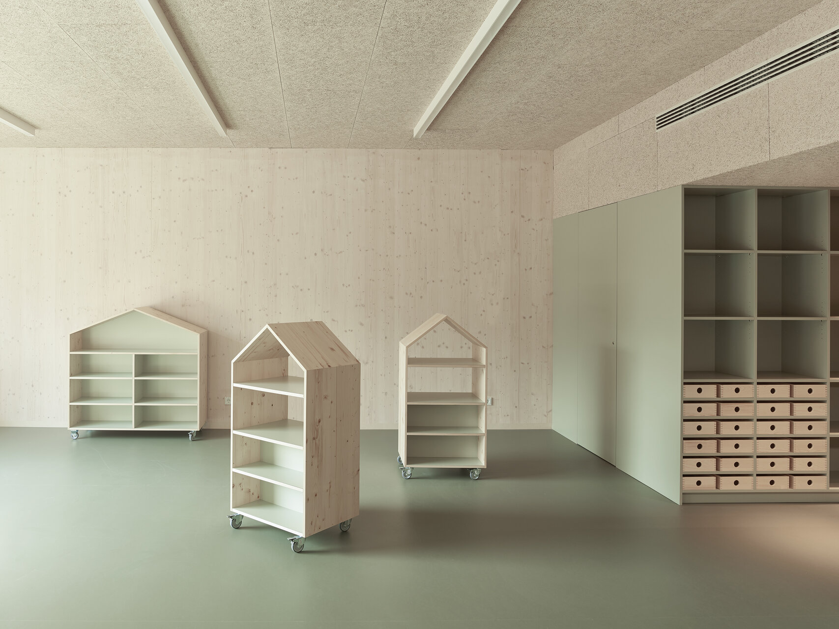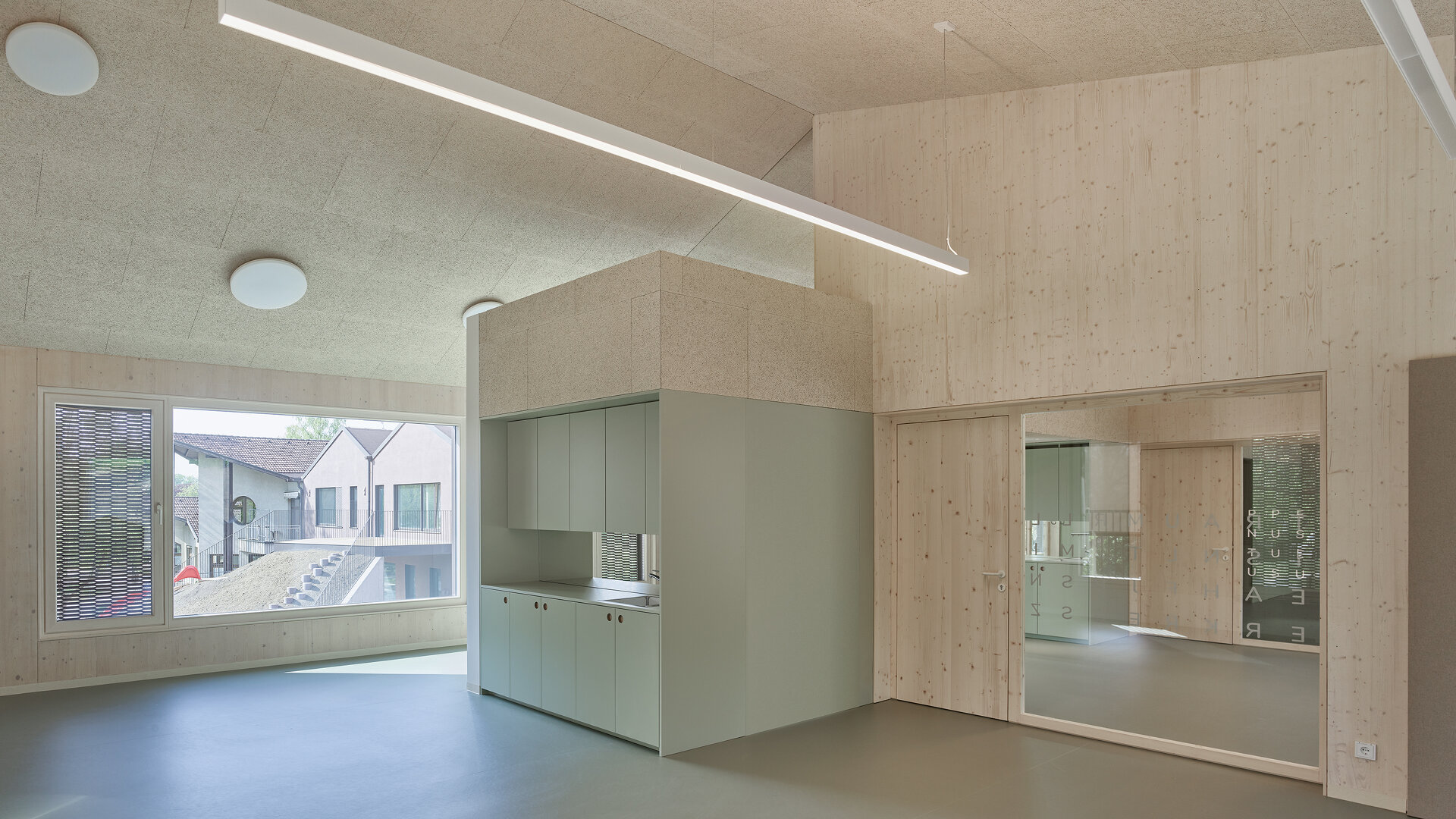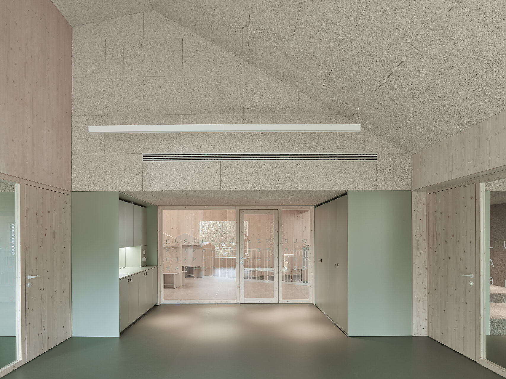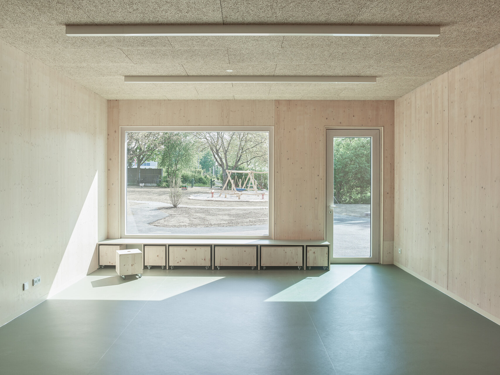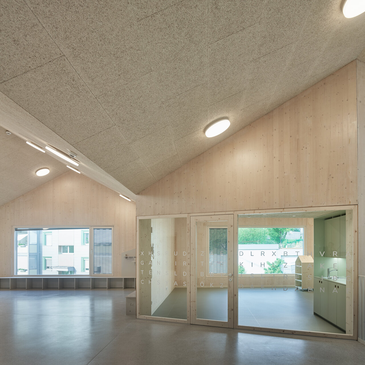 Nutznießer sind neben der Stadt in erster Linie die Kinder und das Betreuungspersonal; sie verbringen ja einen großen Teil ihres Lebens in diesen Räumen. Der bereits fertiggestellte Hort empfängt sie mit einem hellen, multifunktionalen, über die gesamte Gebäudehöhe offenen Eingangsbereich, der dank großzügiger Verglasungen mit dem Grünraum in Verbindung steht. Auch die Gruppenräume wenden sich mit großen Fensterelementen nach draußen. Sie werden allerdings durch schmale Zwischenbereiche von den Erschließungsflächen getrennt. In diesen etwas niedrigeren Zonen finden sich neben Stauräumen und Teeküchen Bereiche, die mit teppichbelegten Sitzstufen zum Rückzug einladen. So entsteht ein gewisses Maß an Konzentration und Intimität, ein Gefühl der Verbundenheit mit der jeweiligen Gruppe, wenngleich überall im Haus die Qualität des zusammenhängenden Ganzen spürbar bleibt.