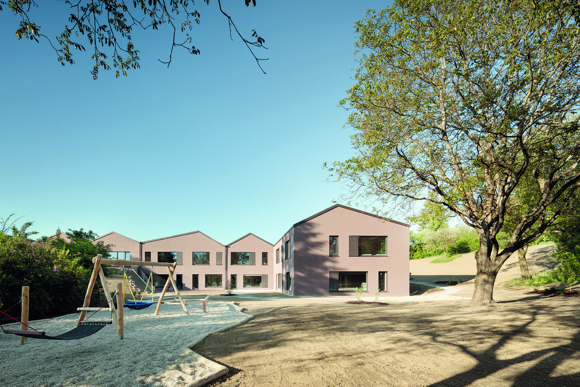 Auch das Mobiliar des Hortes wurde von Mia2 Architektur entwickelt oder ausgesucht. Neben der daraus gewonnenen Ordnung der Räume, die sich etwa auf die diskrete Leitungsführung der haustechnischen Anlagen erstreckt, ist es der kluge Umgang mit Licht, Material und Farbe, der das Haus zu einem Ort macht, in dem man gerne lernt, spielt oder arbeitet. Die Räume sind hell, aber ihre Oberflächen blenden nicht; der Baustoff Holz wird gezeigt, aber bleibt im Hintergrund; die Farben sind sanft und sorgsam aufeinander abgestimmt. Selbst den rötlich braunen Ton der mit Hanf gedämmten verputzten Fassade hat Mia2 Architektur aus der Färbung des vorgefundenen Daches abgeleitet, die nun als Zeichen erdiger Naturverbundenheit gelesen werden kann. So wird das Haus in seiner augenzwinkernd verspielten Körperhaftigkeit zu einem Teil des Gartens, aus dem es sich erhebt. Alte Bäume und vorsichtig in die Topografie eingefügte Bereiche mit Spielgeräten, einem Sandhaufen oder einem Rodelhügel halten die Freibereiche in austarierter Balance zwischen „natürlicher“ Anmutung und vielfältiger Nutzbarkeit. Es ist nicht leicht zu erklären, wo Architektur beginnt. In der Kinderbetreuungseinrichtung Hauderweg jedenfalls lässt sie sich schon in jungen Jahren als ebenso robustes wie inspirierendes Gehäuse des Alltags erleben.