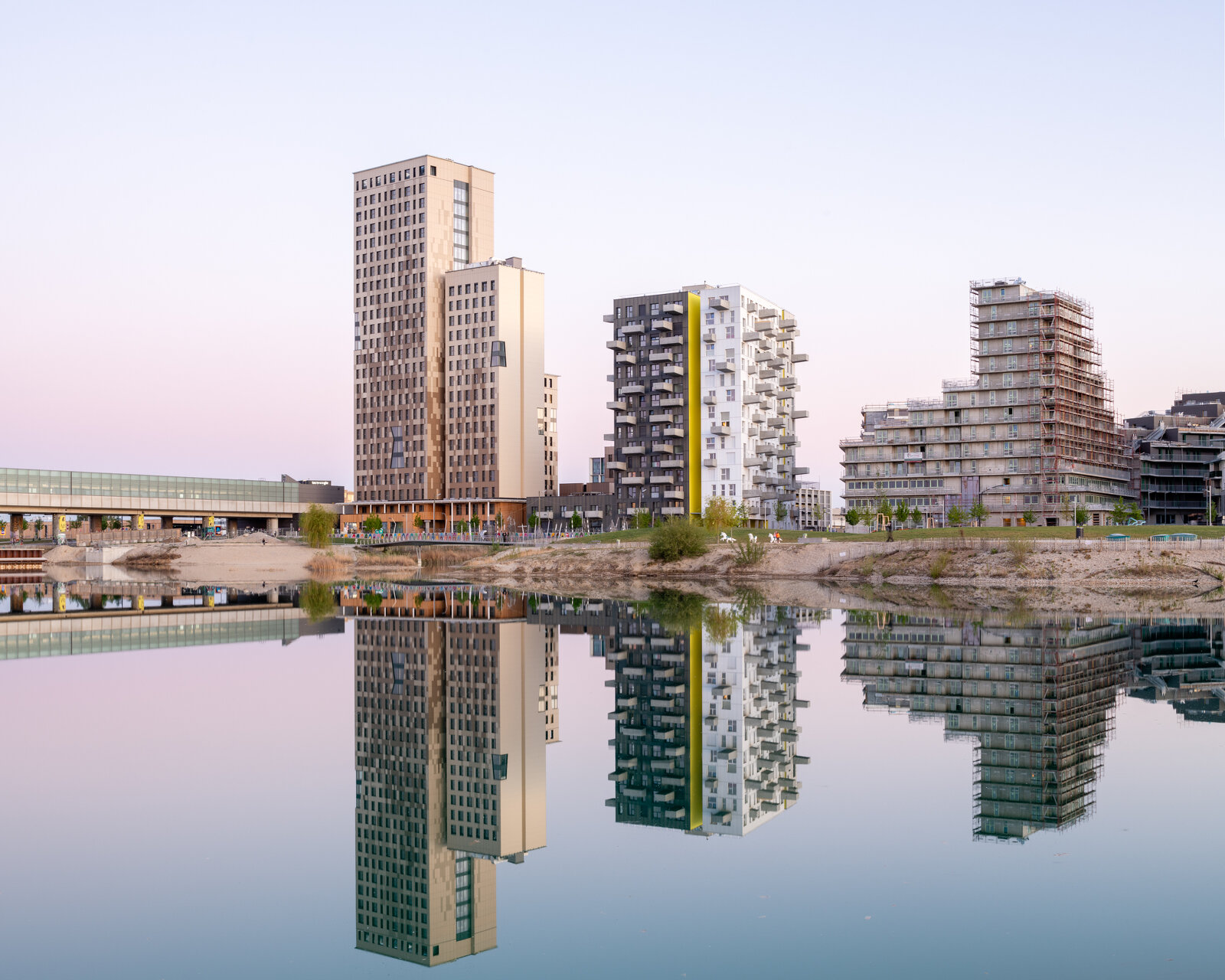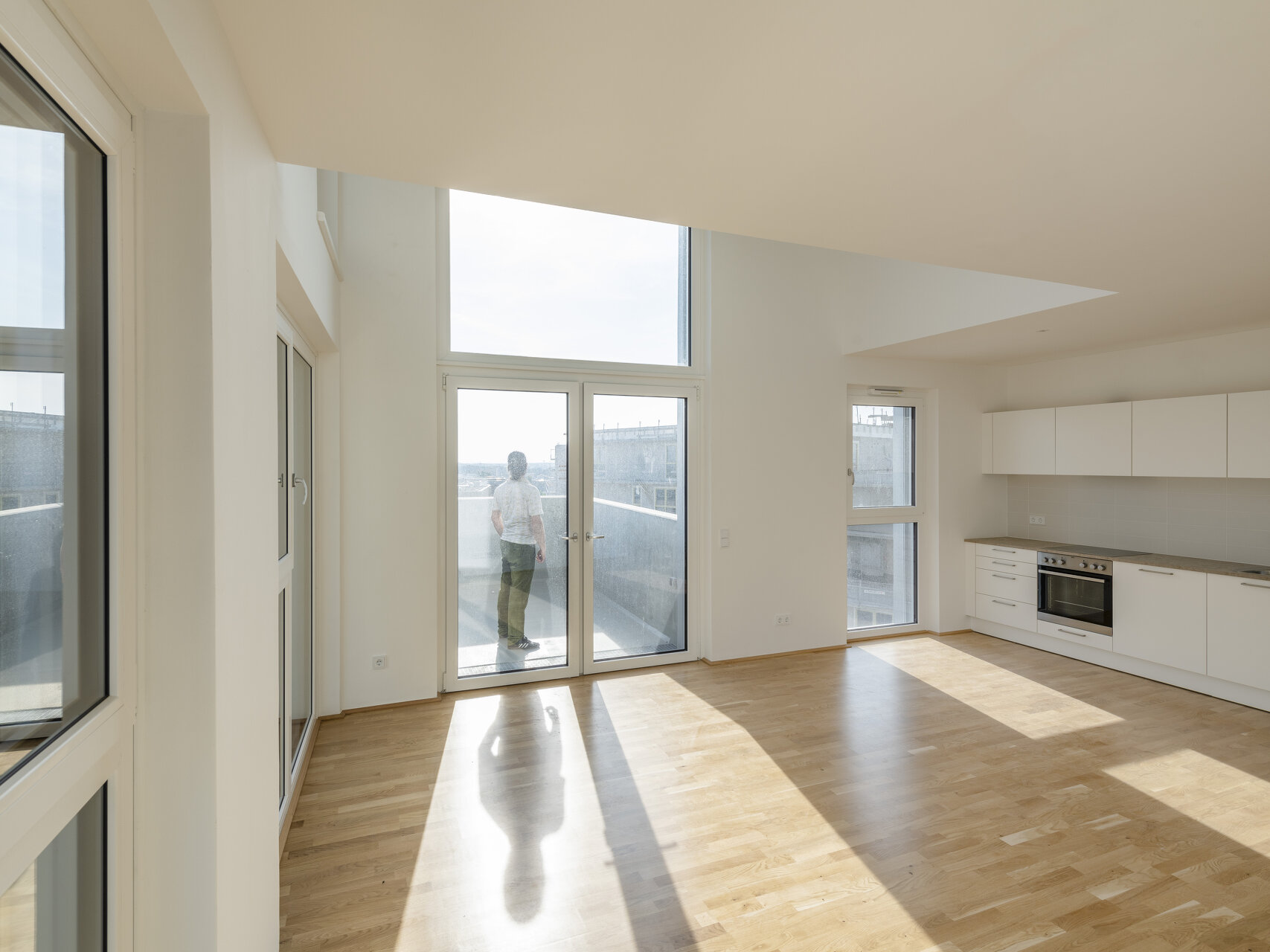 Ein Großteil der Wohnungen besitzt zudem einen Wohnbereich mit doppelter Raumhöhe von 5,40 Meter. Das ist eine besondere räumliche Großzügigkeit und holt buchstäblich den Himmel in die Wohnungen hinein. (Text: Architekten)