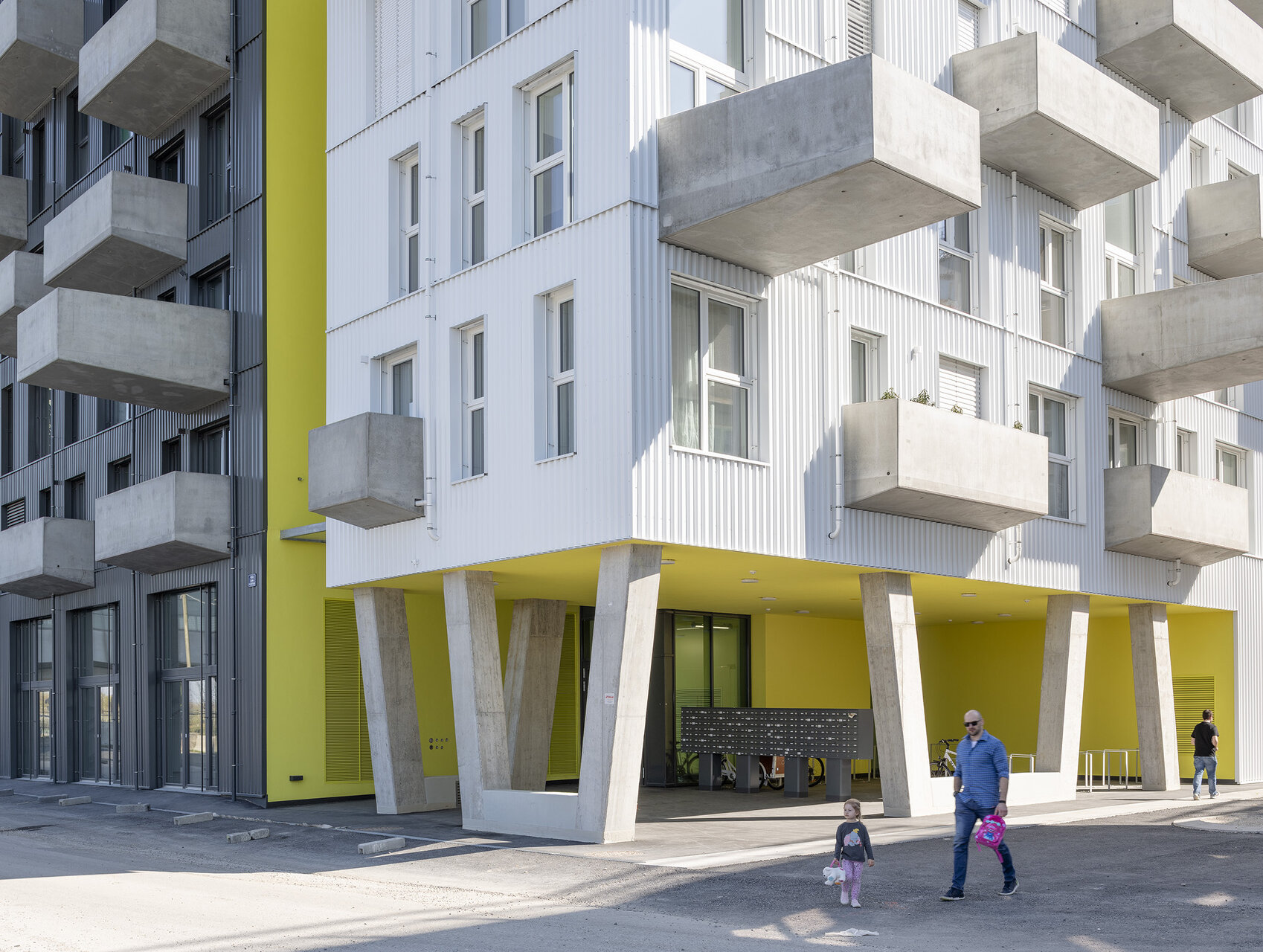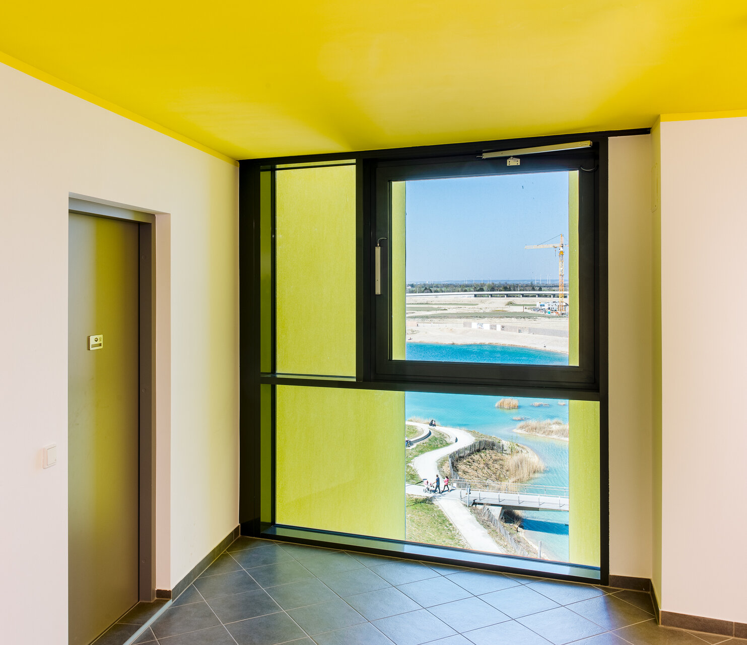 Die von außen wahrnehmbaren gelben Schlitze zwischen den dunkelgrau, hellgrau und weiß gestalteten Gebäudesegmenten bilden die winkelförmige, innere Erschließung ab. Ein einziger Erschießungskern reicht für alle Geschosswohnungen aus. Die raumhohen Verglasungen am Gangende bringen Tageslicht ins Innere.