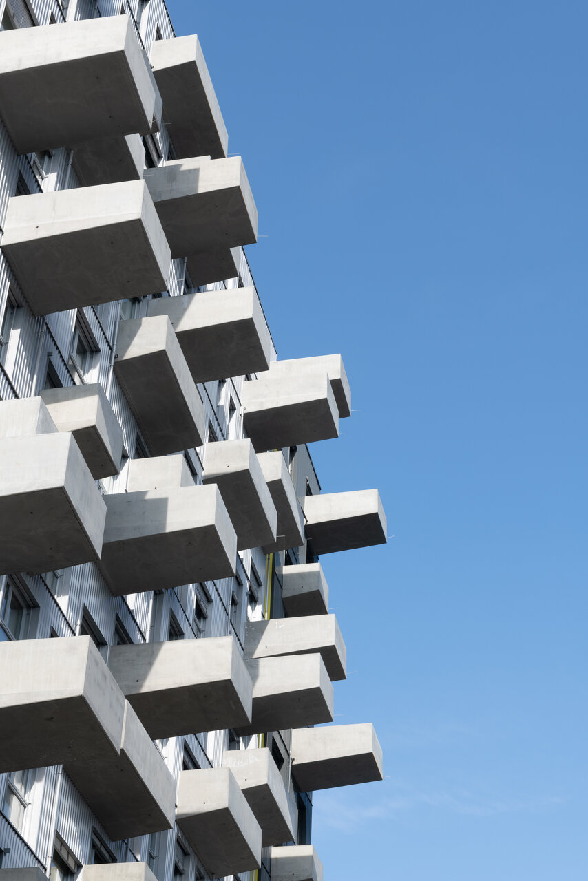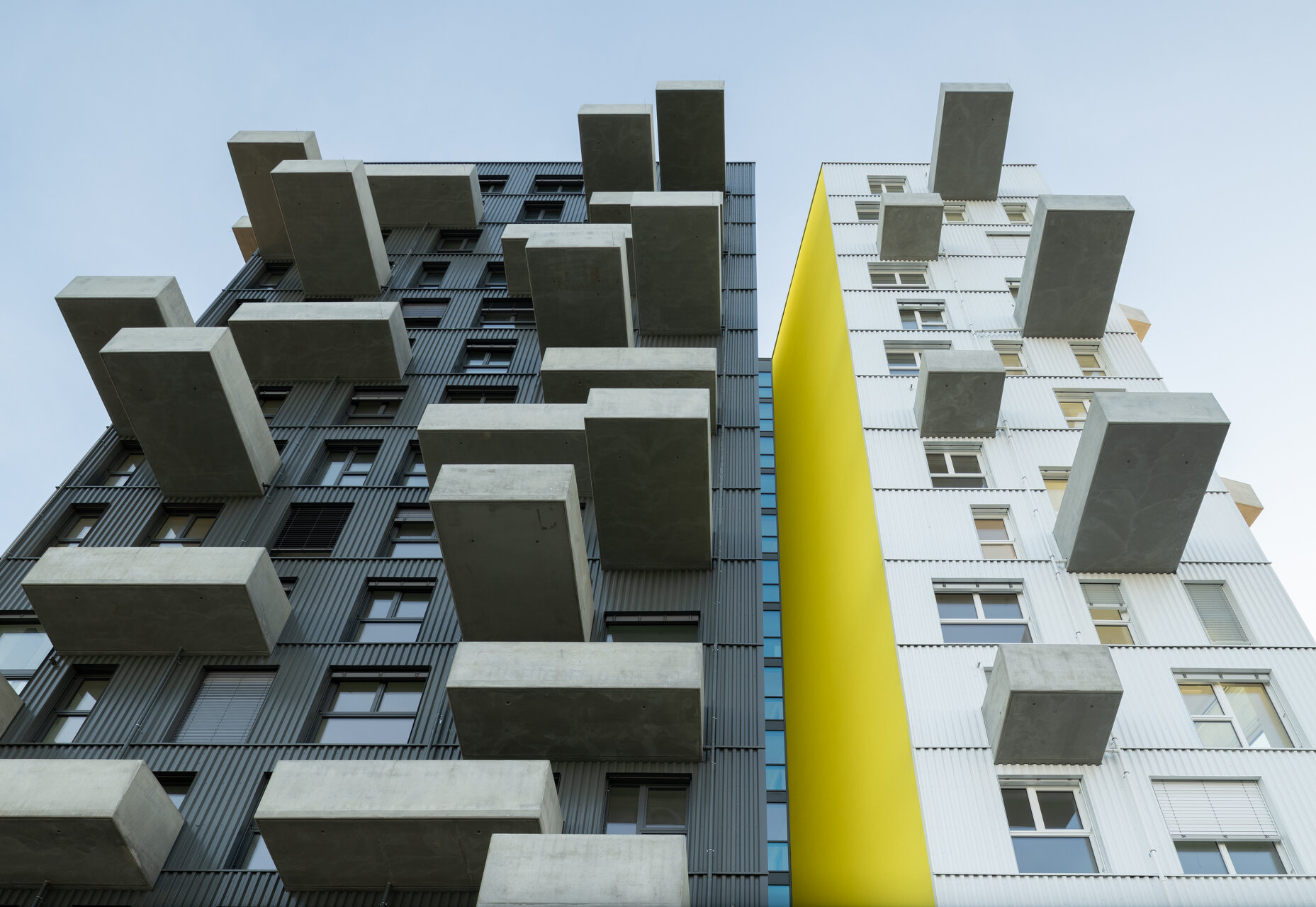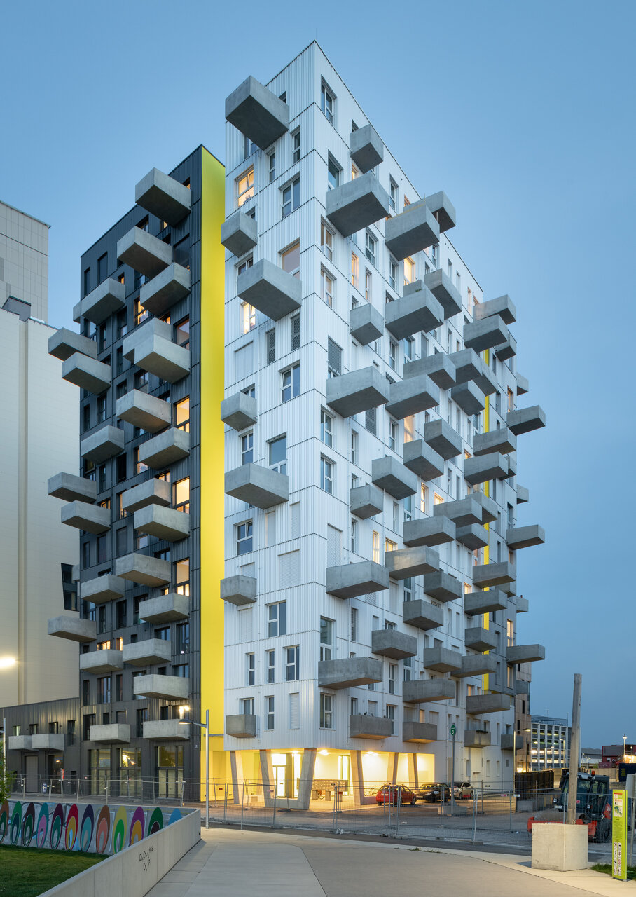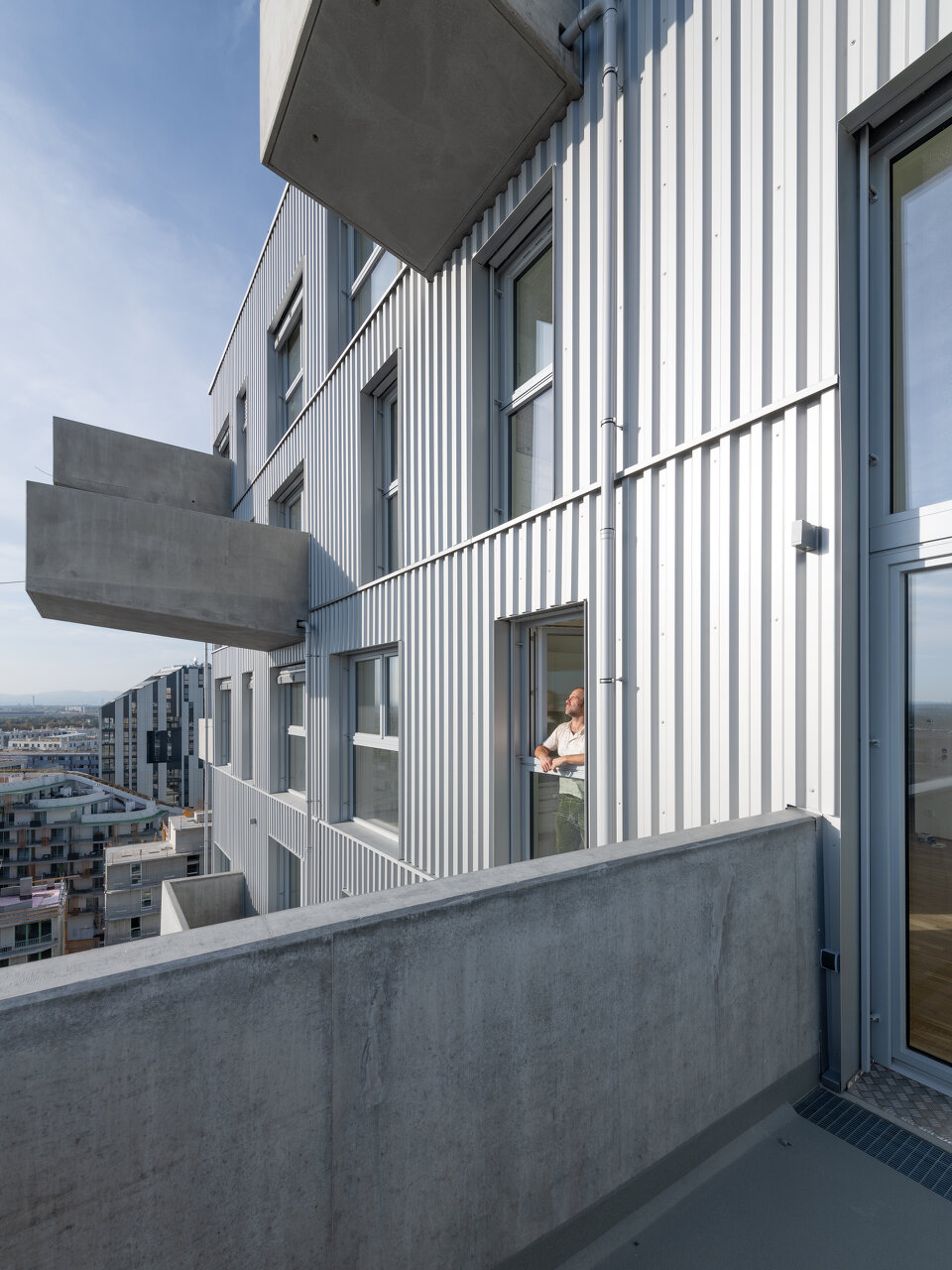 Die aus einem Stück gefertigten Betonbalkone sind als bis zu 3,30 Meter tiefe Freiraumwannen ausgestaltet und charakterisieren somit das Erscheinungsbild des Wohnhochhauses. Die hinterlüftete Fassade aus Trapezblech betont die vertikale Linearität des Wohnturms und ermöglichte die Integration der Balkonentwässerung in die Fassadentextur.