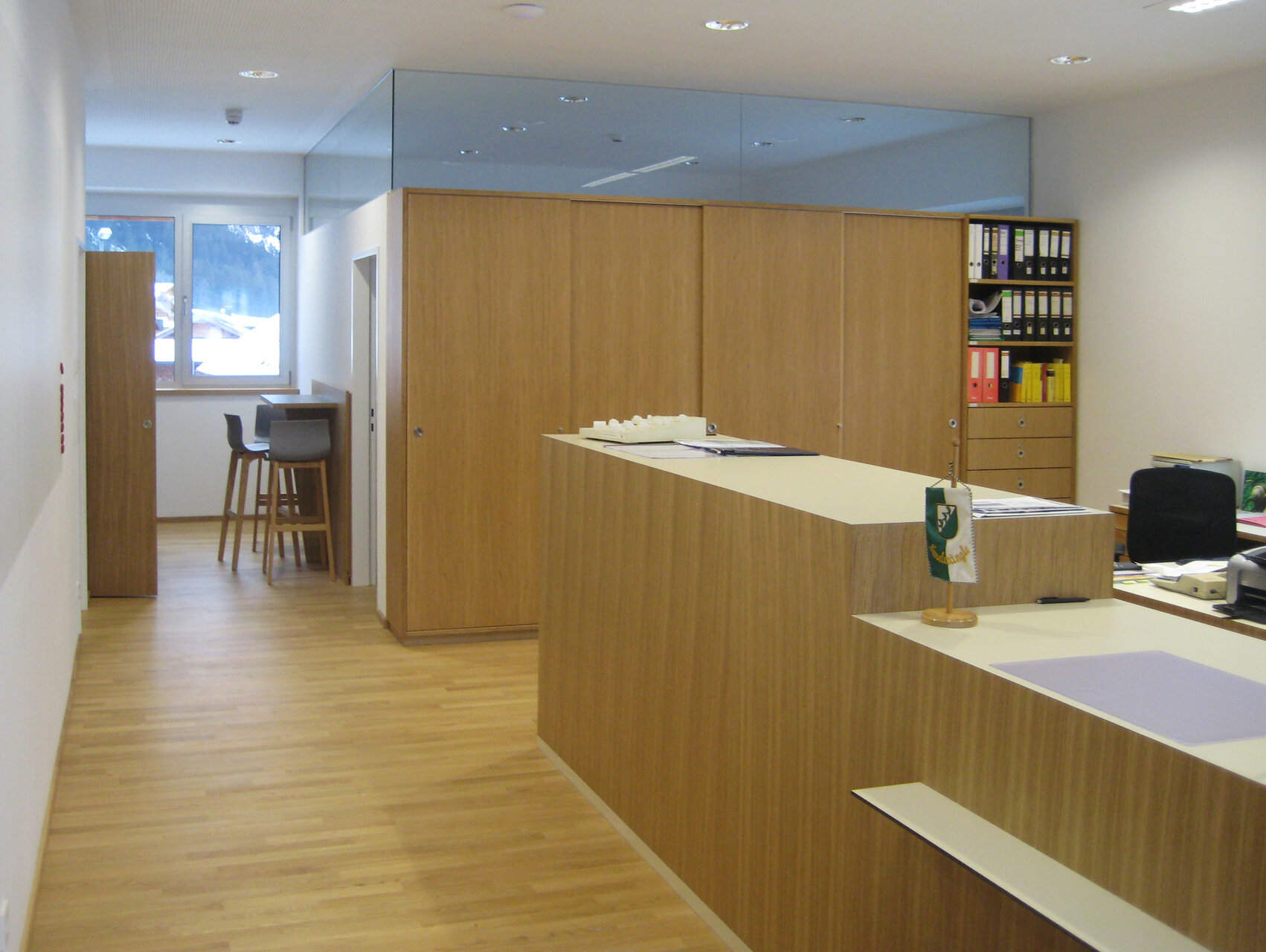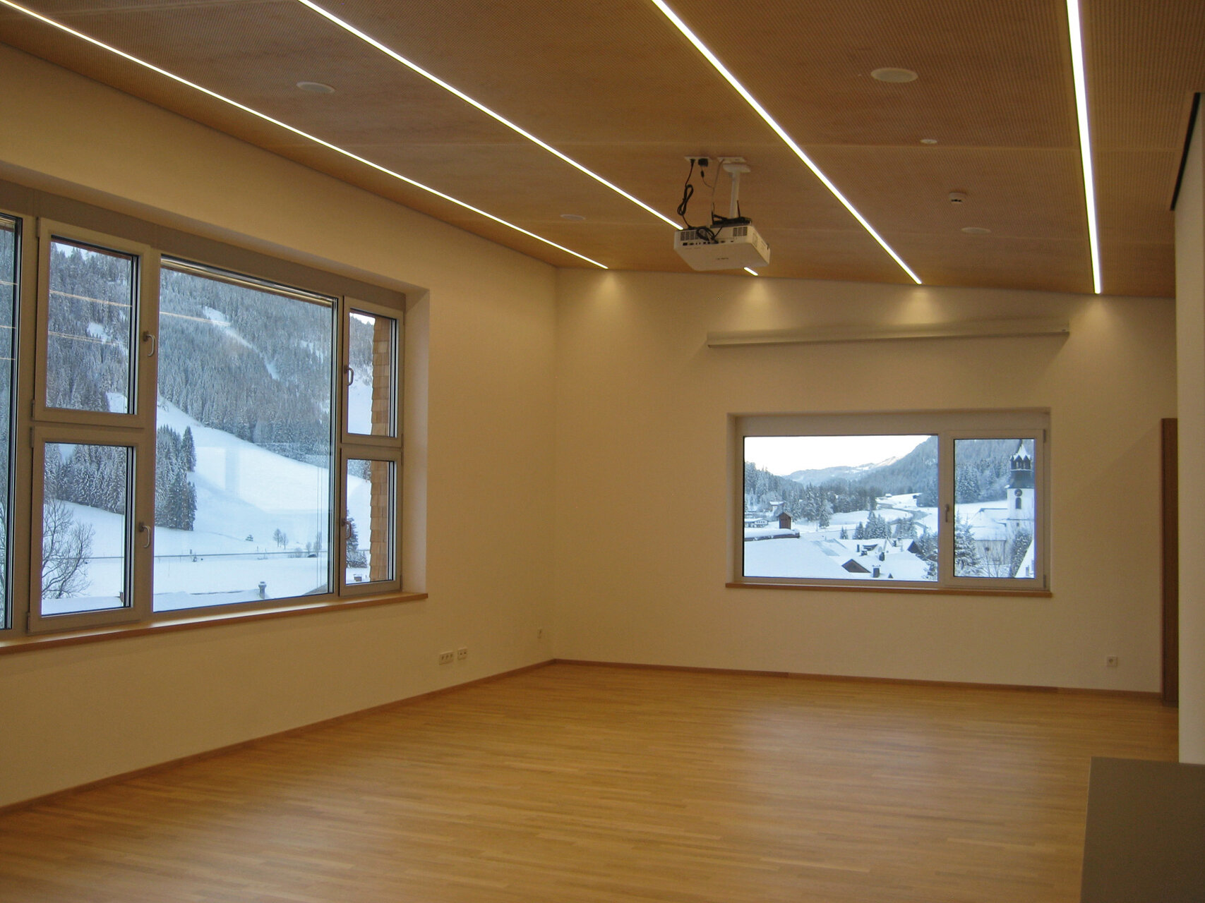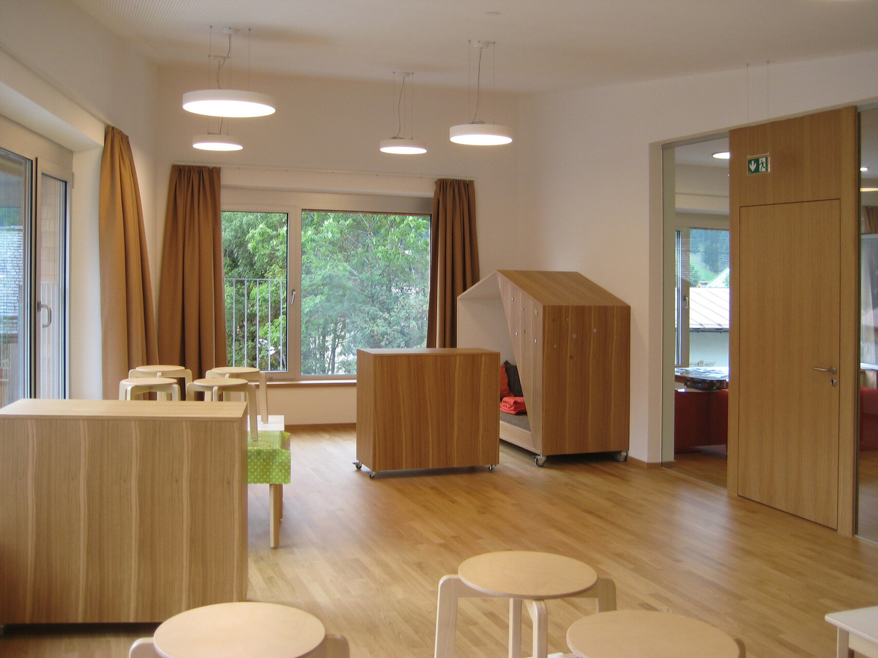 Das Mehrzweckgebäude beherbergt im Erdgeschoß das Tourismusbüro und Räumlichkeiten für die Jungbauernschaft. Darüber liegt der Schülerhort mit direkten Zugang zu den Freiflächen. Die nächste Ebene nimmt kompakt das neue Gemeindeamt mit Bürgerservice ein, ganz oben ist der multifunktional nutzbare Sitzungssaal situiert, von dem aus der gesamte Talraum überblickt werden kann.