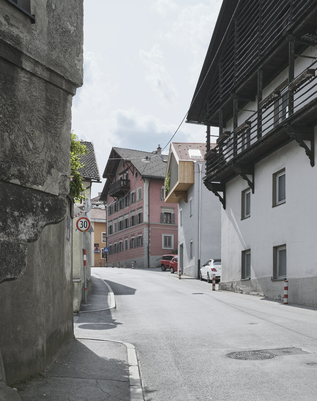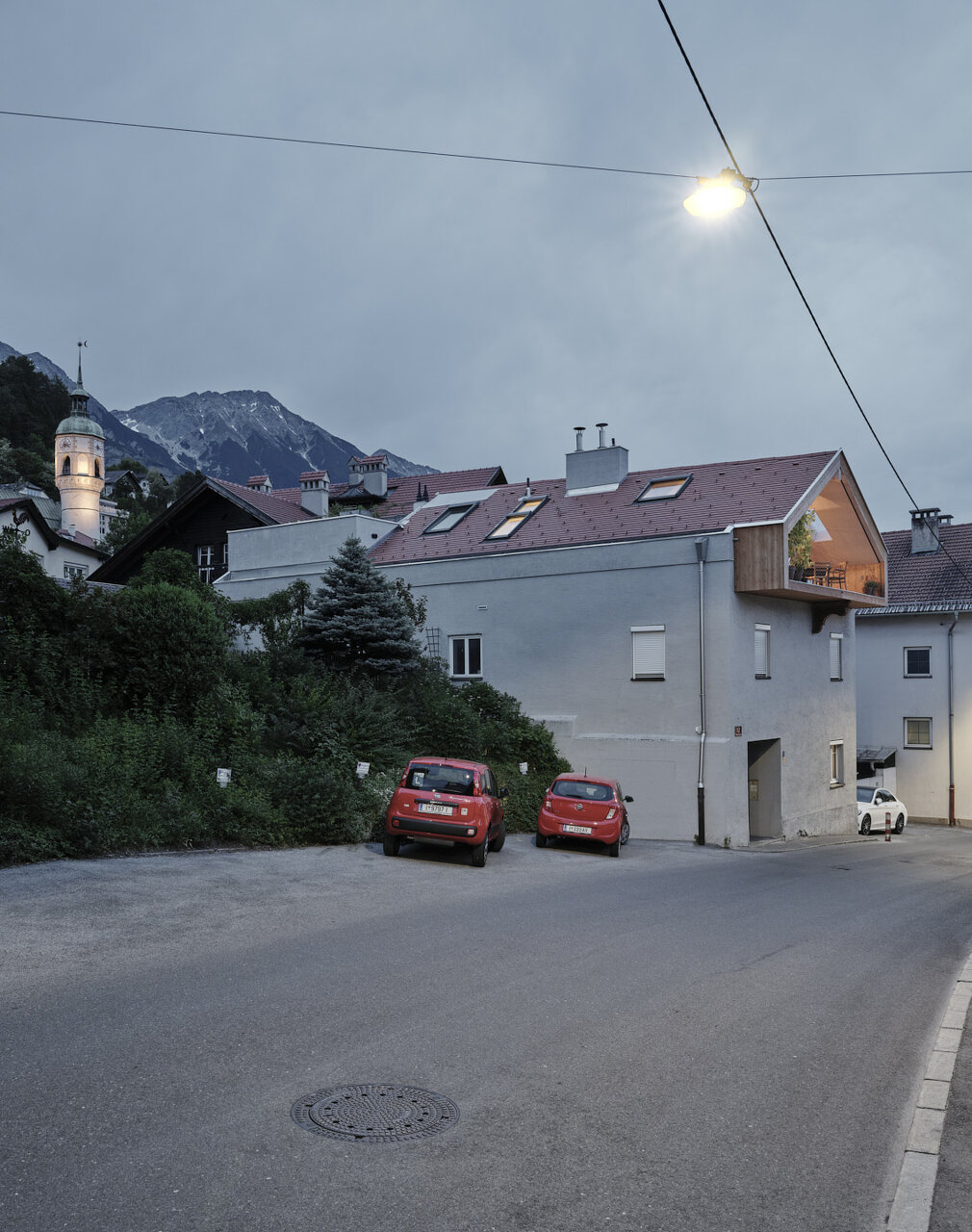 Ausgangspunkt war, dass sich der jungen Familie die Möglichkeit bot, den unausgebauten Dachboden eines über 100 Jahre alten Bestandshauses zu erwerben. Die baulichen Gegebenheiten des Bestandes mit seinem Grundriss in Form eines schiefwinkeligen Vierecks und vor allem die rechtlichen Vorgaben bestimmten den herausfordernden Entwurfsprozess. Nachdem die Außenwände des Bestandsgebäudes gleichzeitig die Grundgrenzen sind, musste die Tiroler Bauordnung ausgereizt werden, um in dem doch sehr niederen Bestand ein Maximum an Wohnraum schaffen zu können. Gleichzeitig musste entsprechend dem Stadt- und Ortsbildschutzgesetz jede bauliche Maßnahme an diesem charakteristischen Gebäude in einer Schutzzone vom SOG-Beirat bewilligt werden.