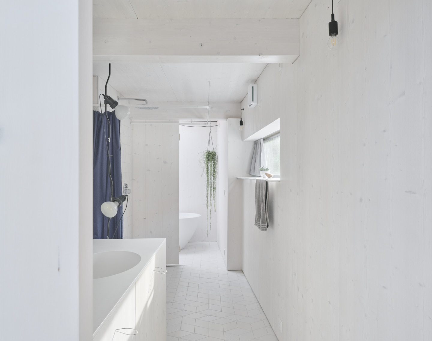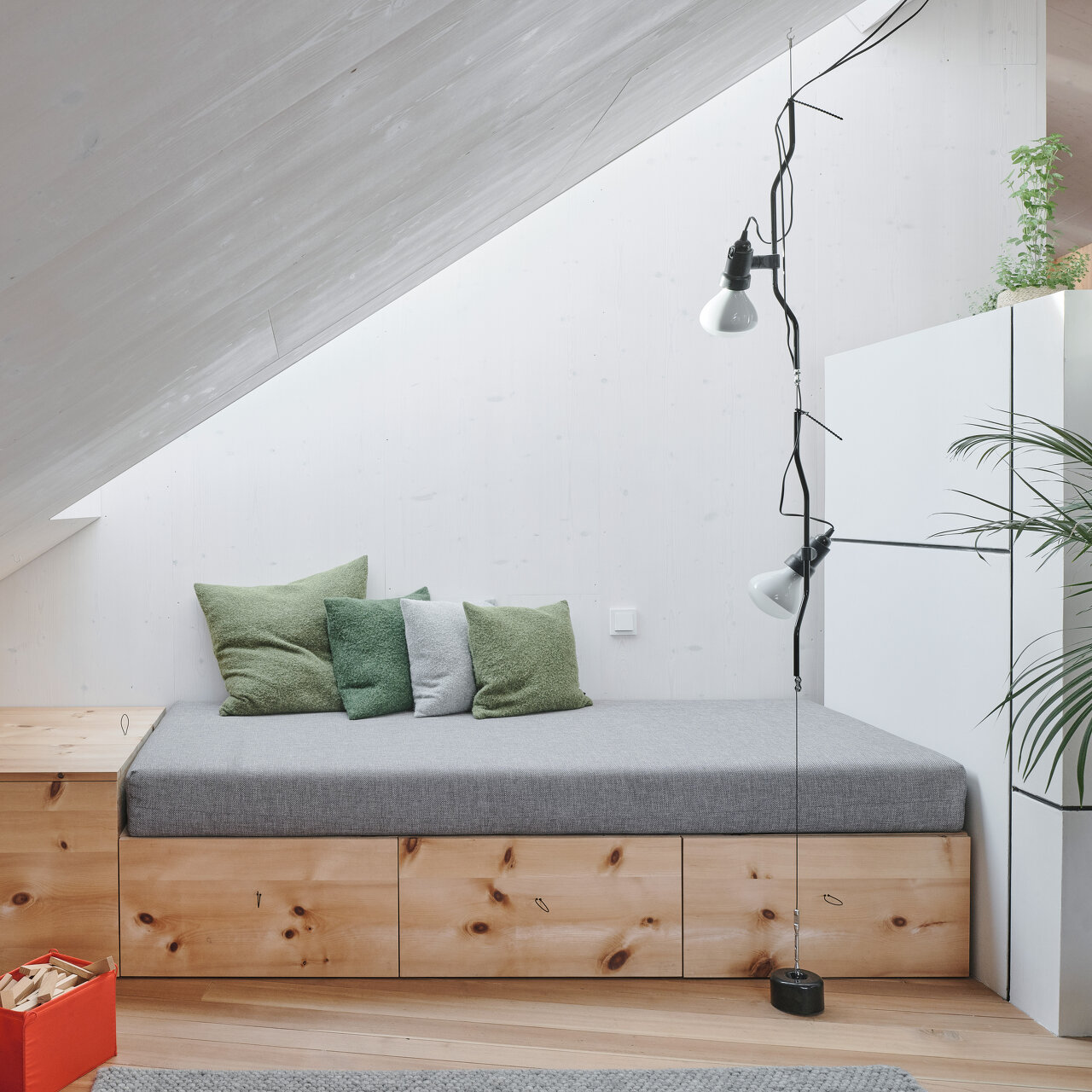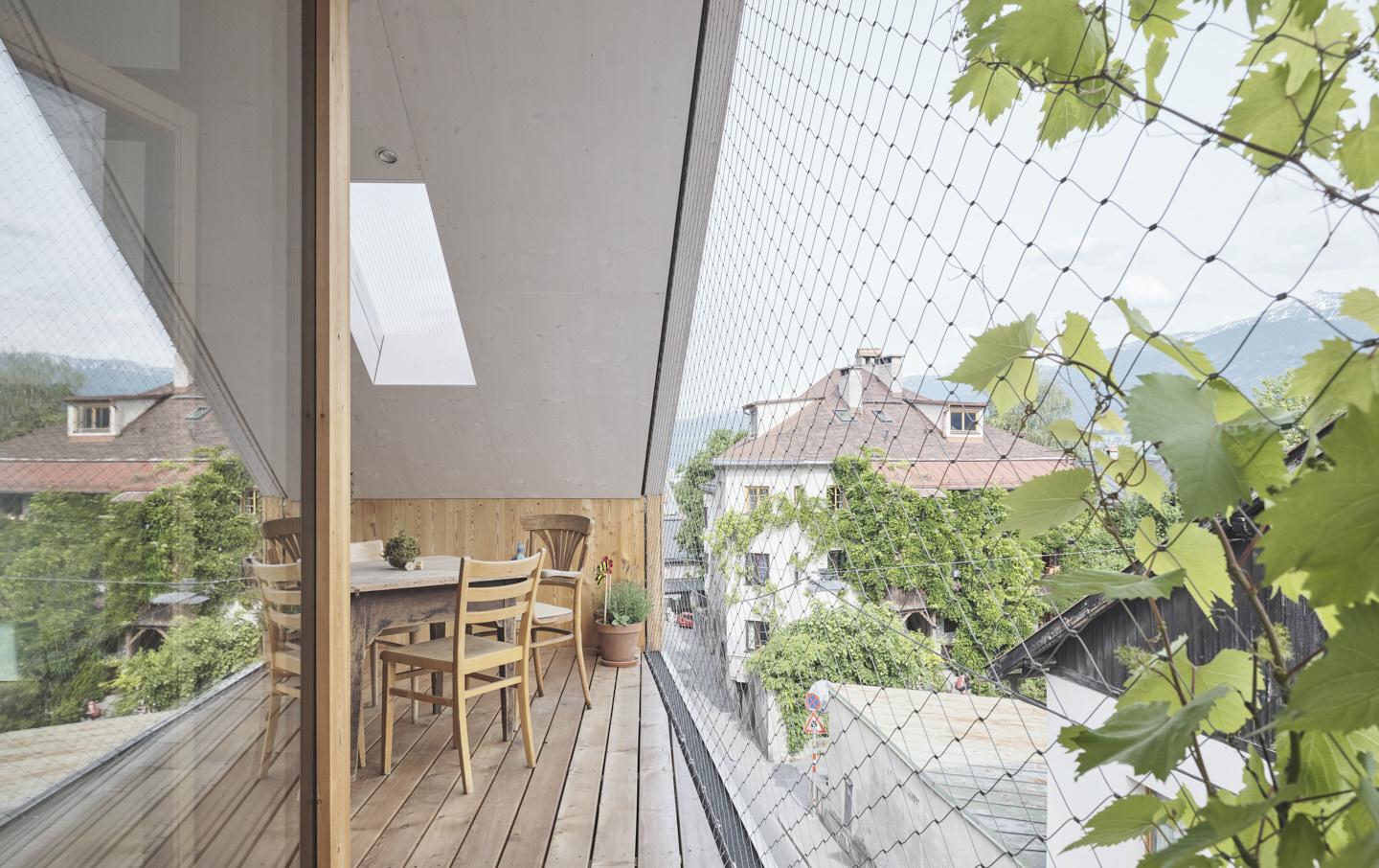 Da sich die Dachkonstruktion des historischen Bestandes für den Ausbau nicht mehr eignete, wurde das komplette Dach in Holzbauweise neu errichtet. Zum Einsatz kamen vorwiegend ökologisch nachhaltige Materialien, so wurde etwa die Dämmung zum besseren Hitzeschutz in Holzwolle und Jute eingebracht. Das Dach wurde den Vorgaben des Ortsbildschutzes entsprechend in roten Ziegeln ausgeführt. Um die drückende Wirkung der niederen Räume abzuschwächen wurde die hölzerne Untersicht der Dachflächen kalkweiß lasiert. Für den Boden und die Türen wurde langsam gewachsenes Lärchenholz aus dem Tiroler Oberland verwendet, die Oberflächen sind handgehobelt. (Text: Claudia Wedekind)