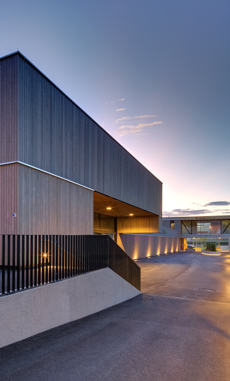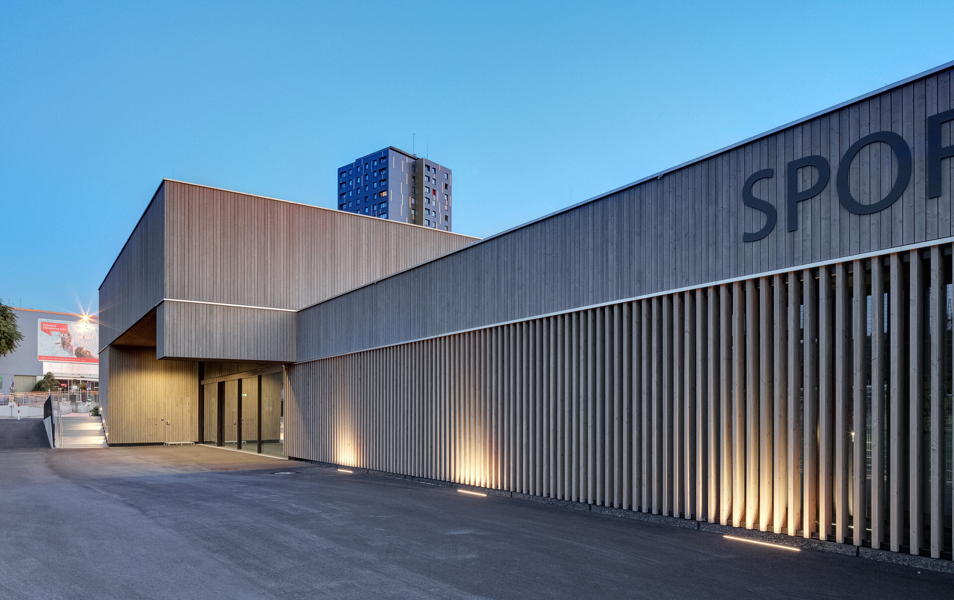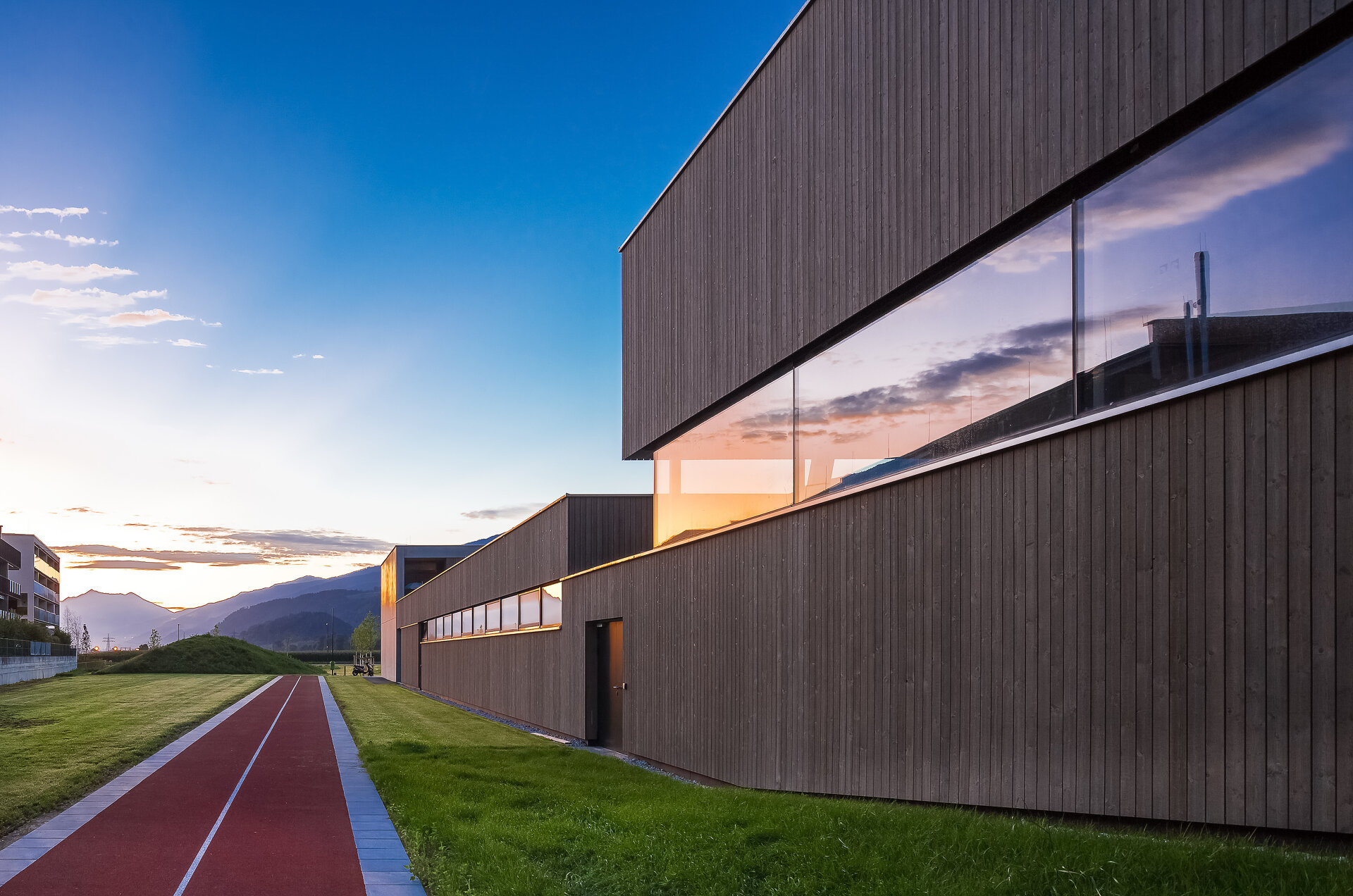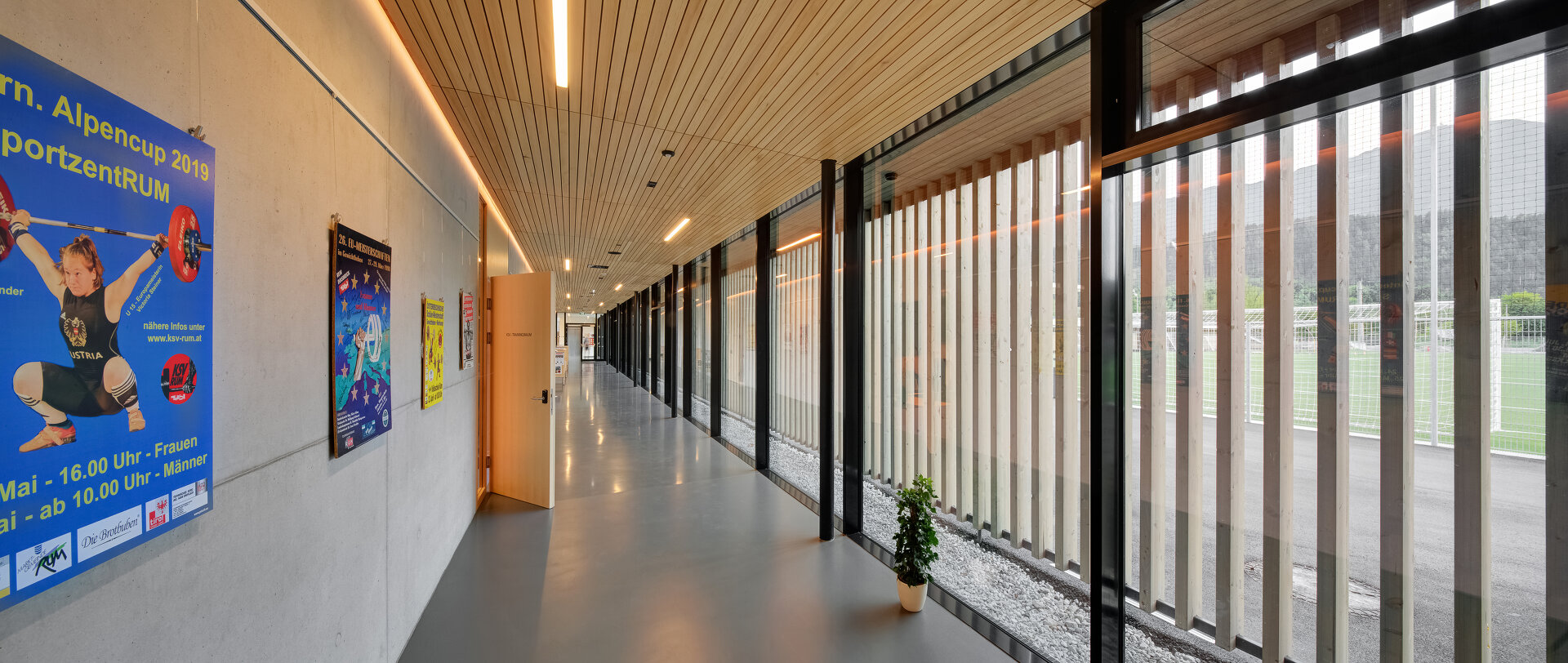 Insgesamt zeichnet sich das neue Sport- und Bewegungszentrum Rum durch eine interessante Durchwegung der Baukörper und attraktive Innen- und Außenräume aus. Die durchgängige Verwendung von Sichtbeton, Massivholz und flächigen Wand- und Bodenbelägen unterstreicht die Funktion des Gebäudes, das von einer vertikalen, hinterlüfteten Fichtenholzschalung umhüllt ist. (Text: Claudia Wedekind)