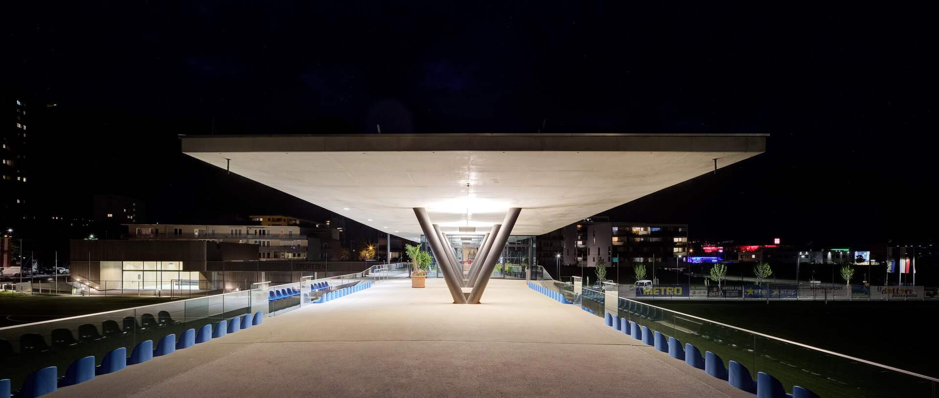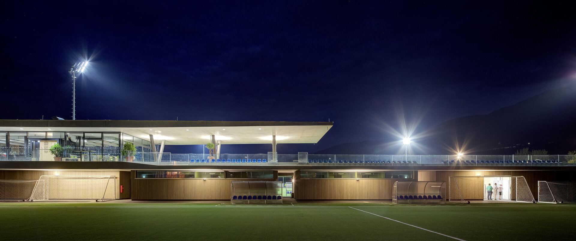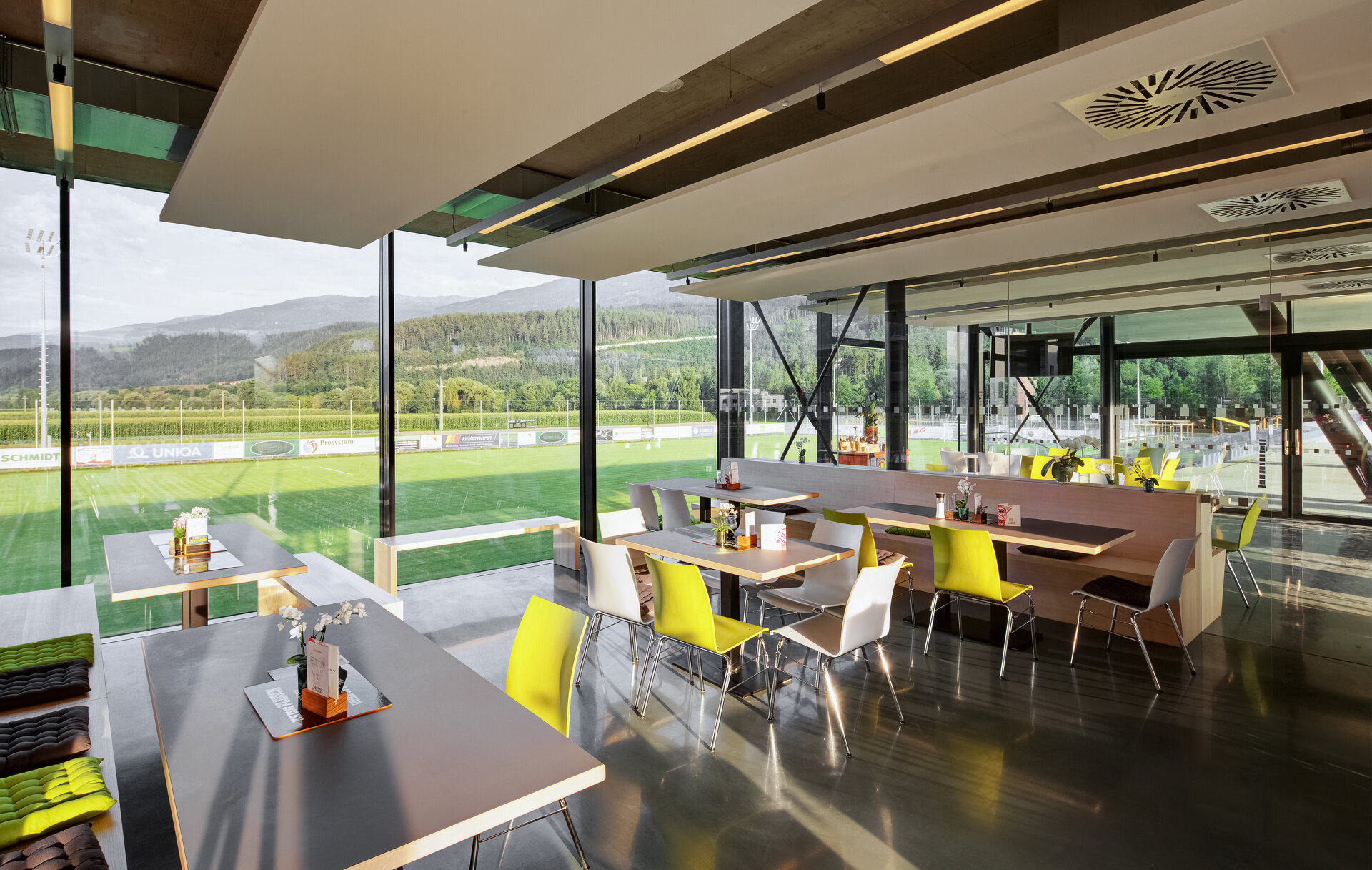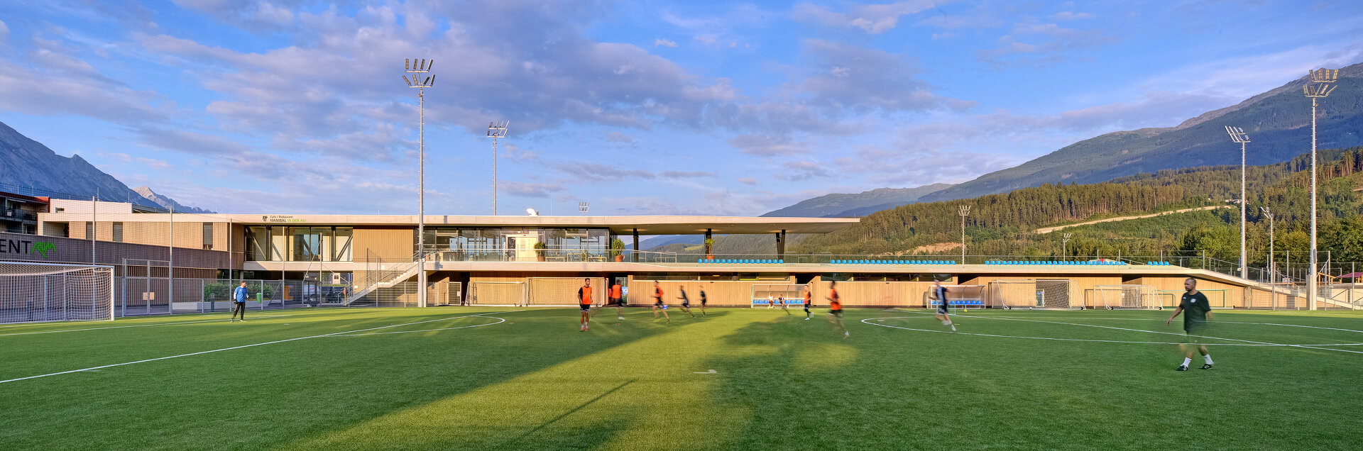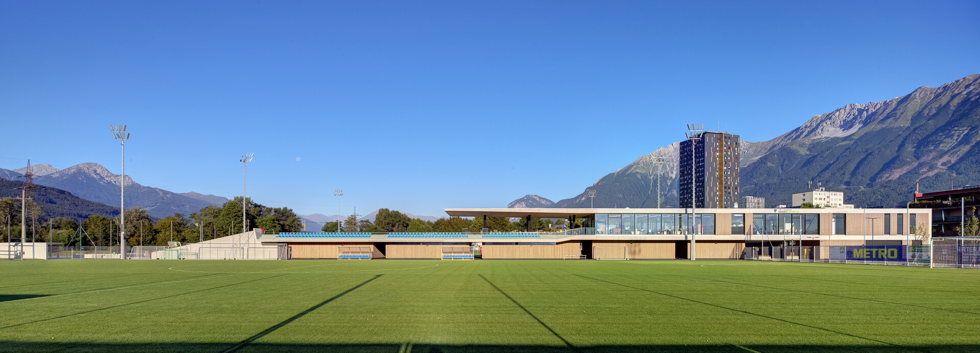 Im Erdgeschoß dieses langen und schmalen Baukörpers liegen die Garderoben und sämtliche vereinsinterne Nebenräume des Fußballvereins, der derzeit zwei Kampf- und 9 Nachwuchsmannschaften umfasst. Im Obergeschoß befinden sich ein über raumhohe Verglasungen zu den Sportflächen hin geöffnetes Restaurant sowie 200, teils überdachte Sitzplätze auf beidseitig zu den Spielfeldern orientierten Sitzstufen. Ein sich nach vorne verjüngendes, weit auskragendes Flugdach bietet für das Restaurant Beschattung und Witterungsschutz für die Tribünenplätze. Außentreppen und eine zur Innpromenade hin orientierte Rampe ermöglichen eine Durchwegung des gesamten Areals und unterstreichen die von den Architekten beabsichtigte Wirkung einer einladenden Geste für Besucher und Zuschauer.