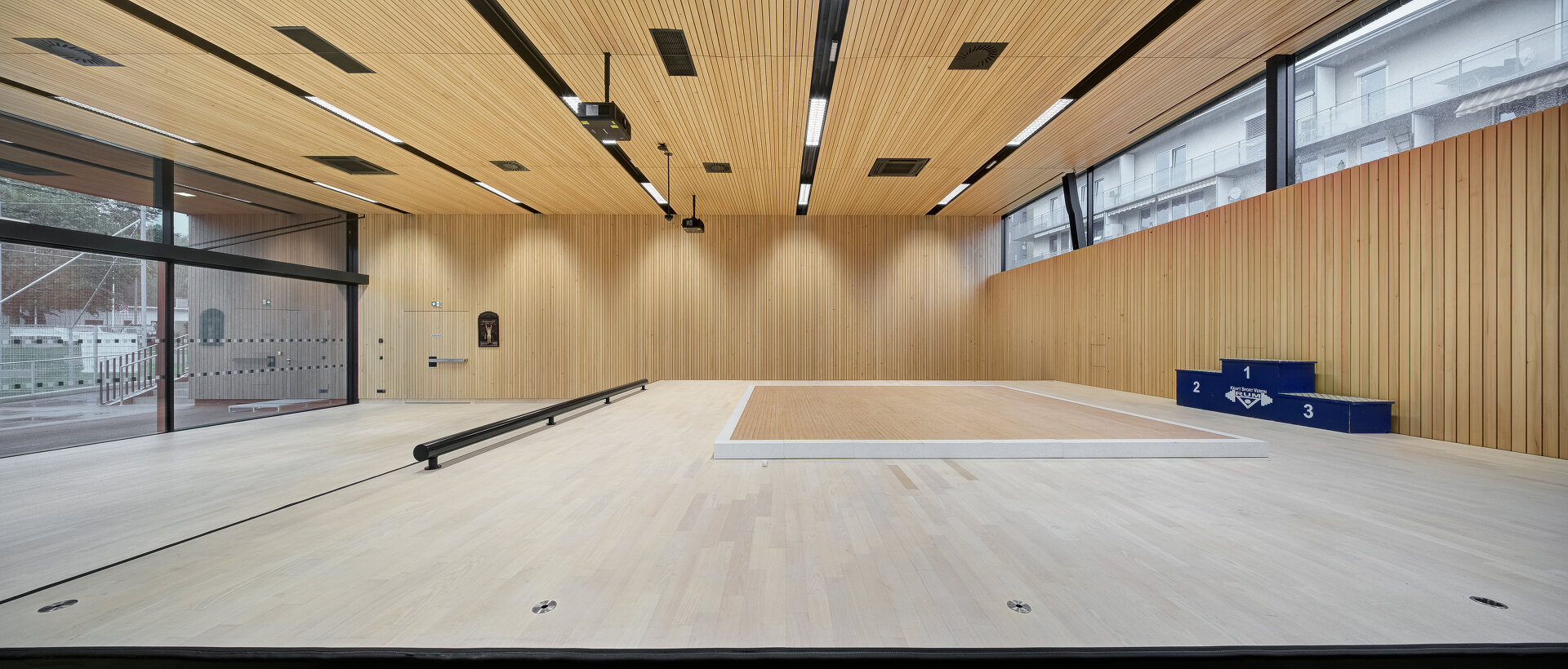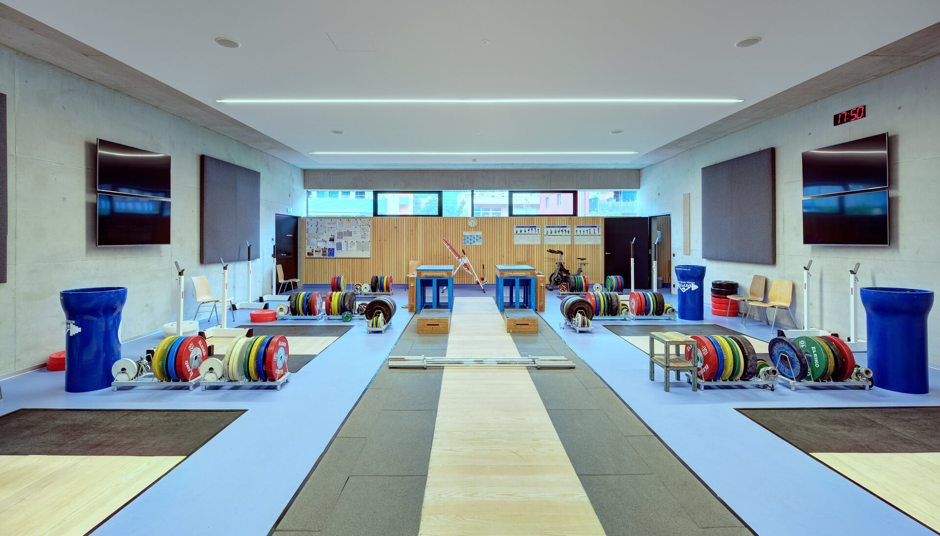 An dieses längsgestreckte Brückenbauwerk schließt sich ein Querbaukörper mit den Räumlichkeiten für den Kraftsportverein, das als Kopfgebäude den Abschluss zur anschließenden Wohnbebauung bildet. Herzstück dieses Baukörpers ist eine 4,5 m hohe Wettkampfhalle mit einer versenkbaren Bühne, womit eine multifunktionale Nutzung für Veranstaltungen abseits von Wettkämpfen möglich gemacht wurde.