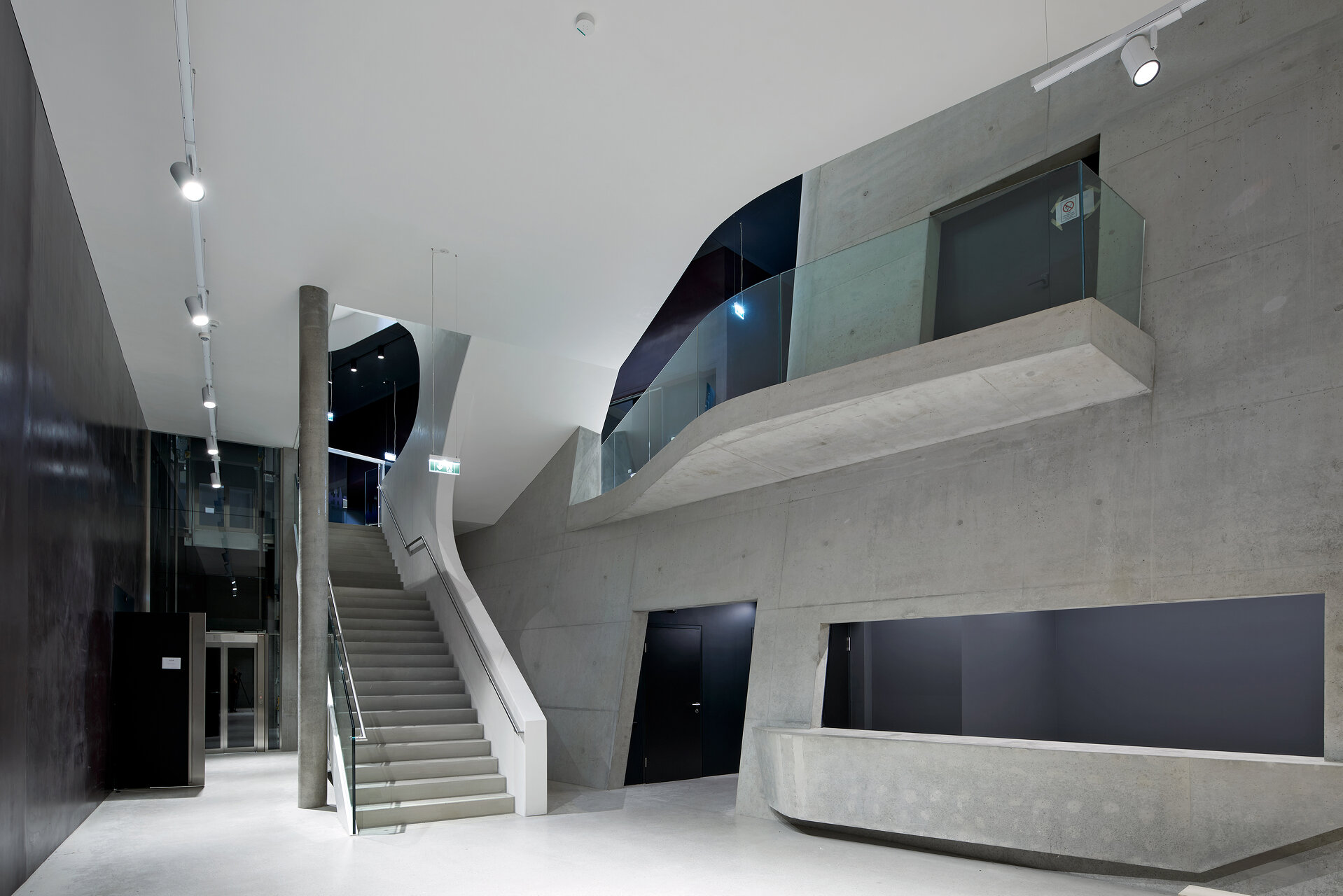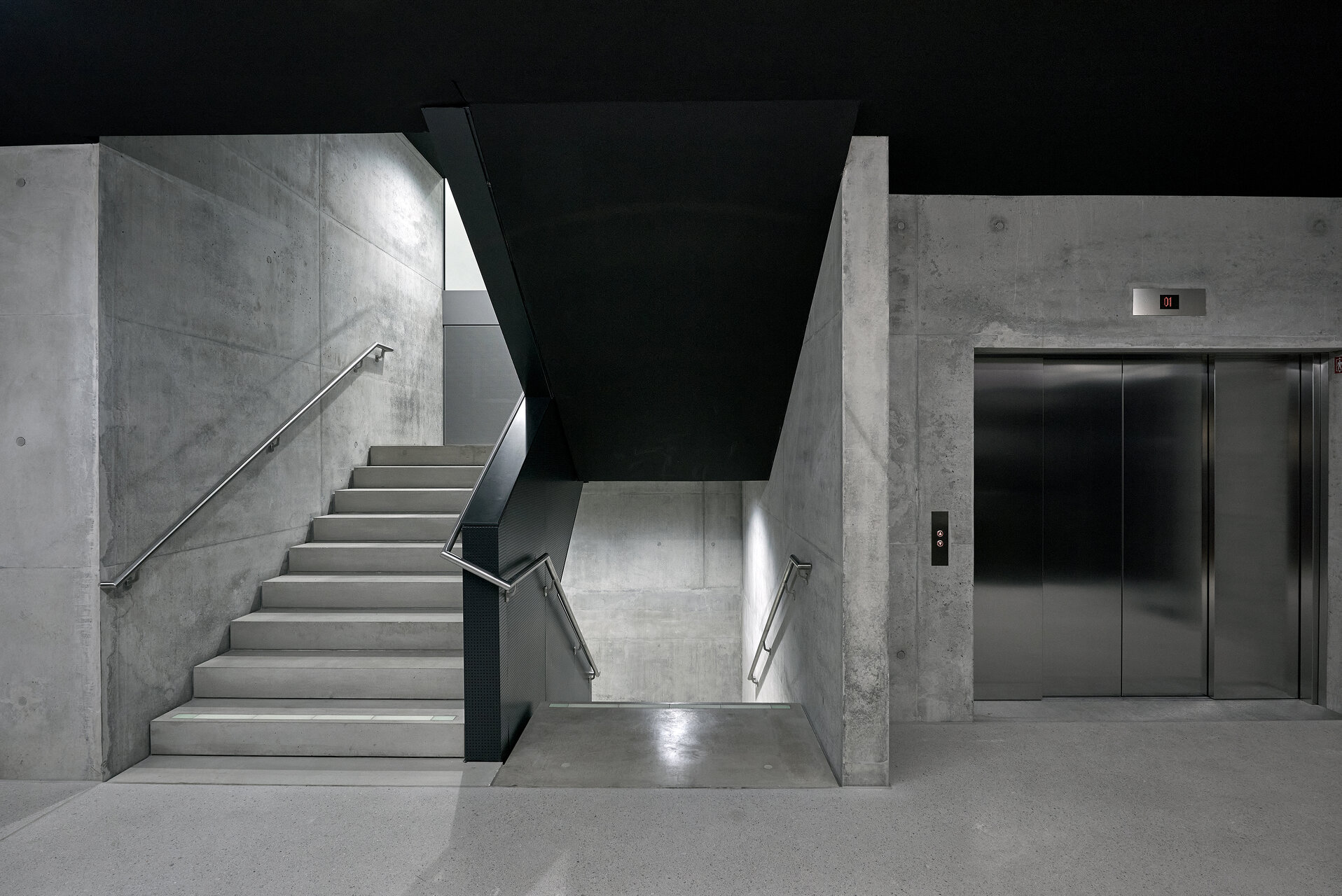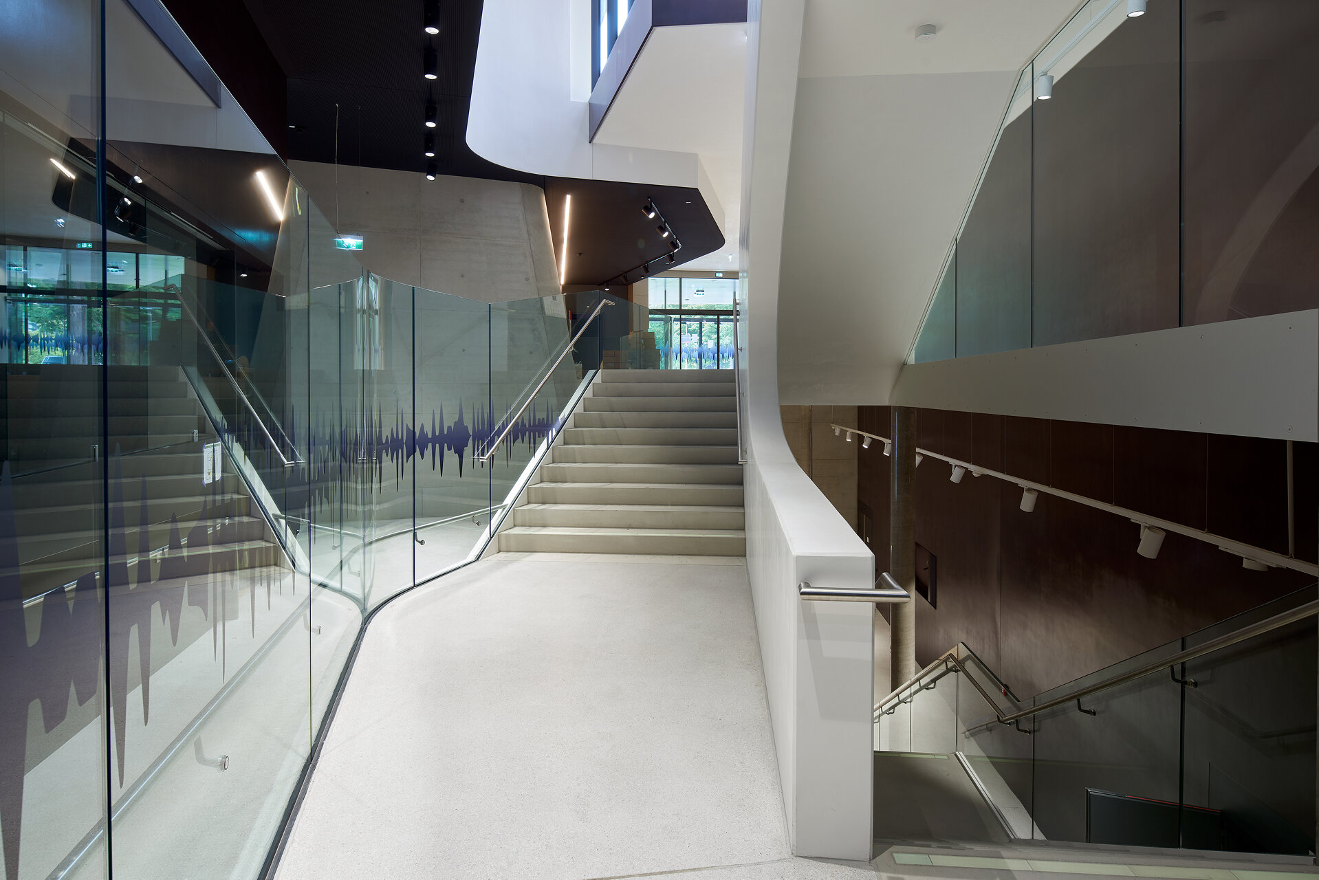 Im Südosten befindet sich ein zweiläufiges Stiegenhaus mit Lastenlift. Die Haupttreppenanlage ist eine räumlich durchkomponierte und in Beziehung zu Campus und Stadt gelegte Erschließungs- und Begegnungszone, die Studierende und Lehrende zu den Instituten, wie auch die Besuchenden zu den Sälen geleitet. Begleitet wird die Haupttreppenanlage von einem gläsernen Personenlift zur barrierefreien Erschließung sämtlicher Niveaus. Trotz Durchquerung kann jedes Institut abgeschlossen, die der Öffentlichkeit zugänglichen Säle hingegen offen gehalten werden. Beide Stiegenhäuser sind als Fluchttreppen ausgebildet, mit den jeweils erforderlichen Maßnahmen wie Verglasungen, Sprinklerbeaufschlagung, Brandschutzvorhängen oder Druckbelüftung.