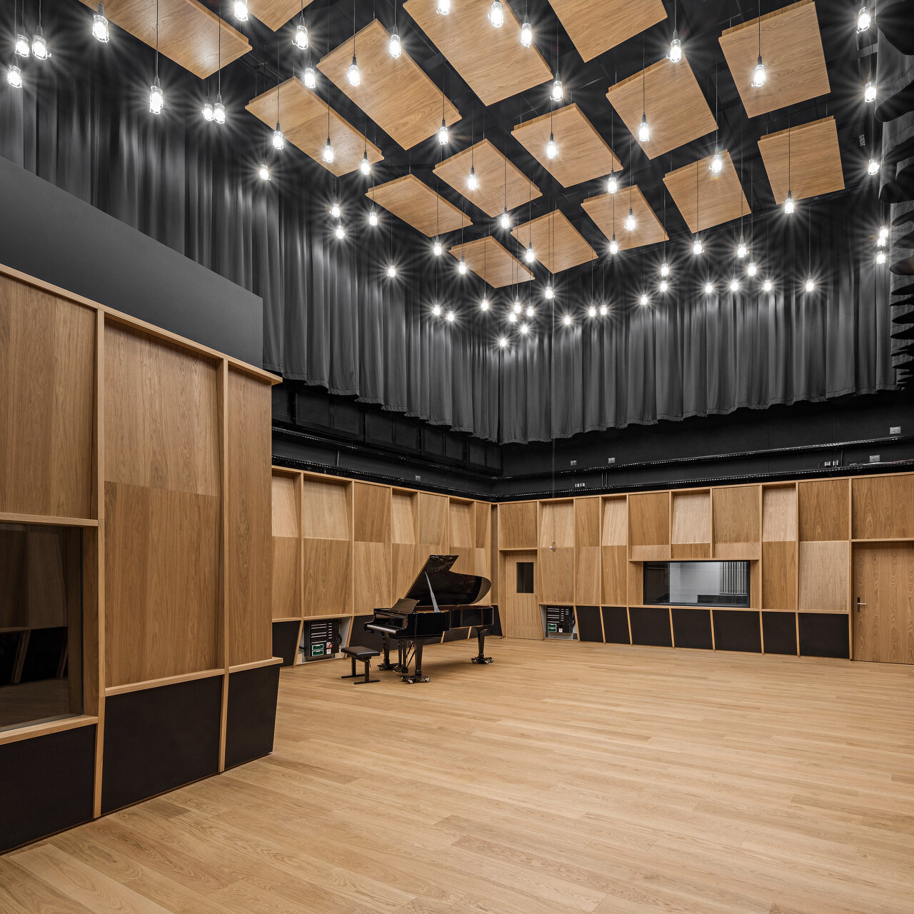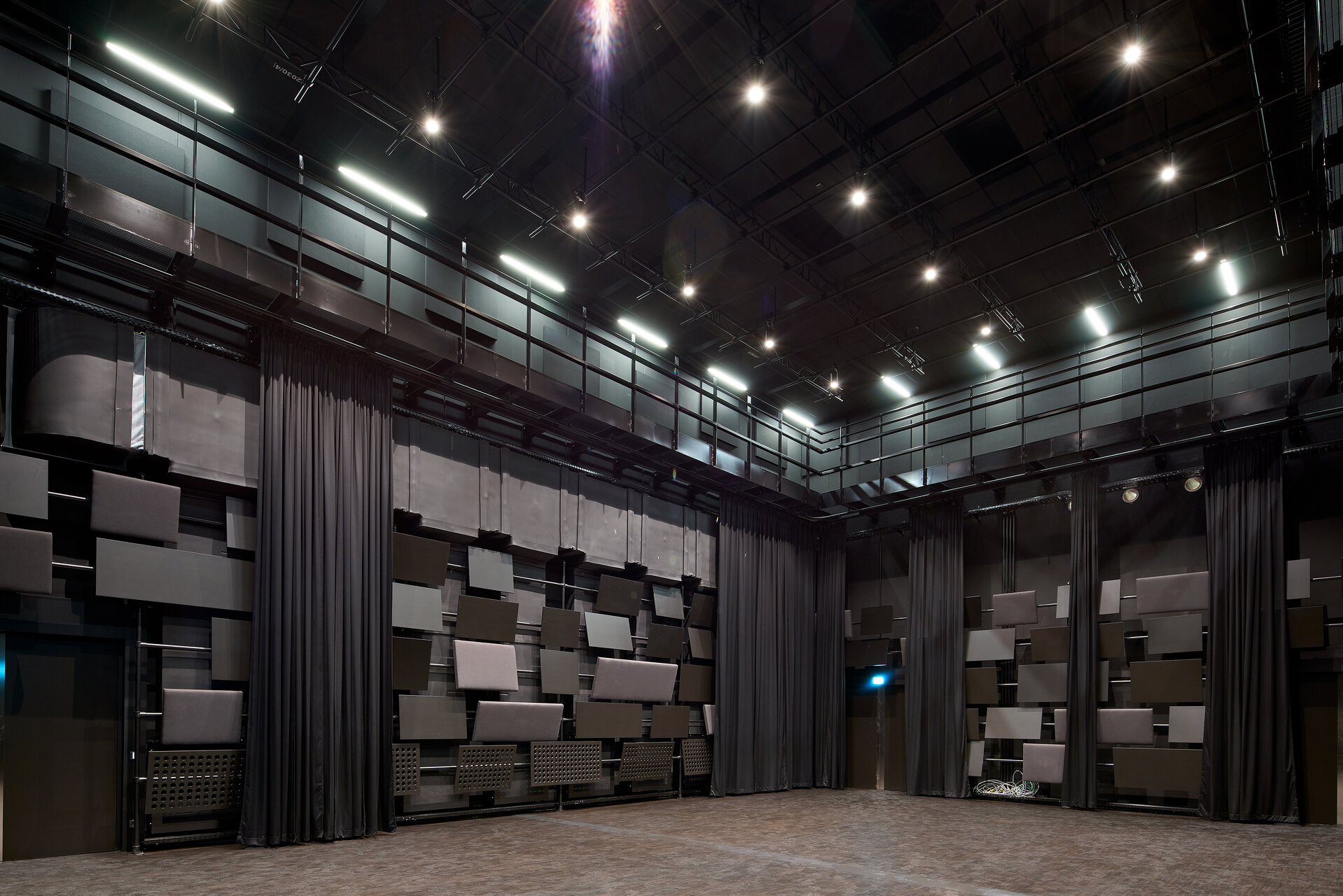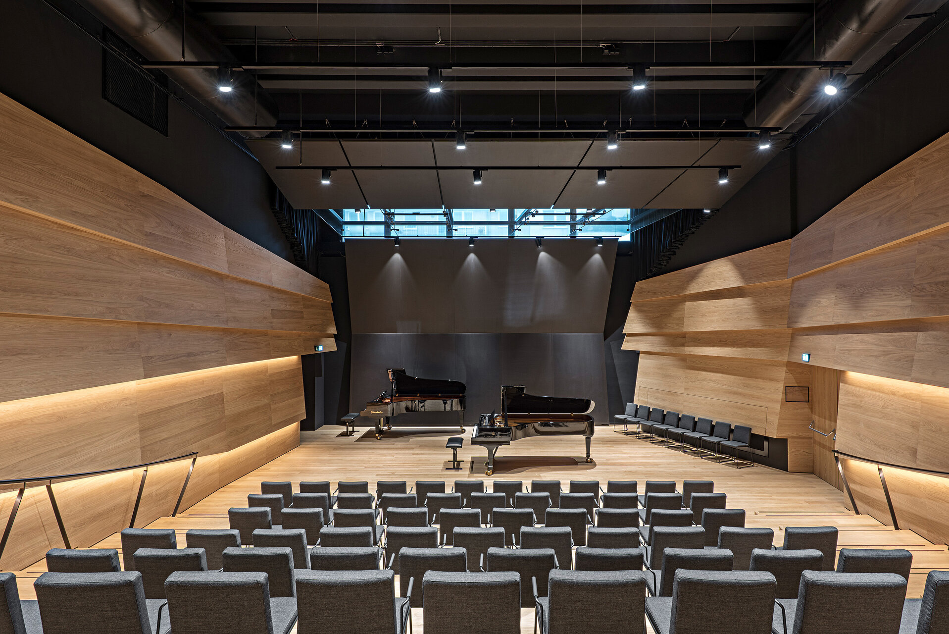 Der Konzertsaal ist mit massiven Holzelementen an Wänden und Decken ausgestattet. Diese Elemente wirken als eigener „Klangkörper“. Um die Nachhallzeit steuern zu können, gibt es in einer definierten Zone zwischen Oberkante der Wandelemente und den Deckenelementen akustisch hoch wirksame, bewegbare Stoffelemente bzw. Vorhänge. Im Art House Kino sind alle wesentlichen Raumoberflächen aus absorbierender Verkleidung, zusätzlich ist der Fußboden mit einer Lochung ausgerüstet, durch die die Zuluft geräuscharm quellen kann. Das Klangtheater ist als experimenteller Raum vollflächig mit schallabsorbierend wirksamen Rollos ausgestattet, die im Abstand vor der Innenschale der Raum-in-Raum-Konstruktion angebracht sind.